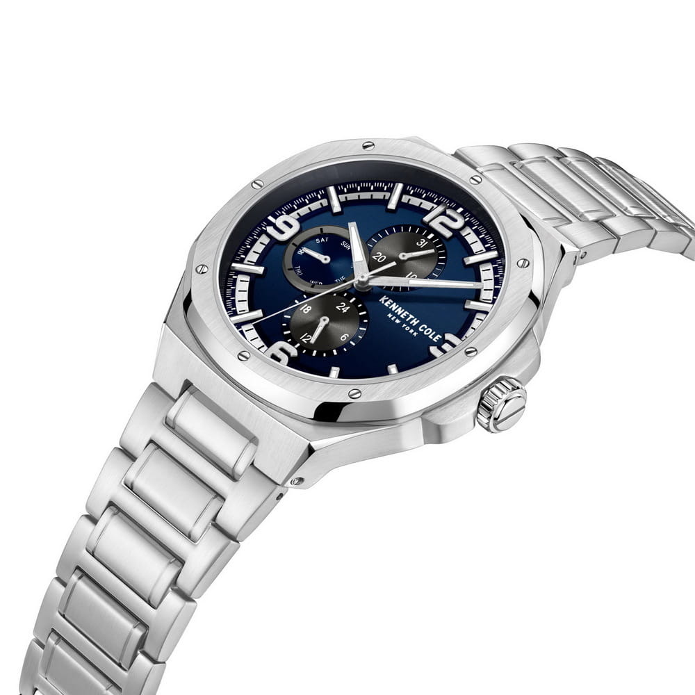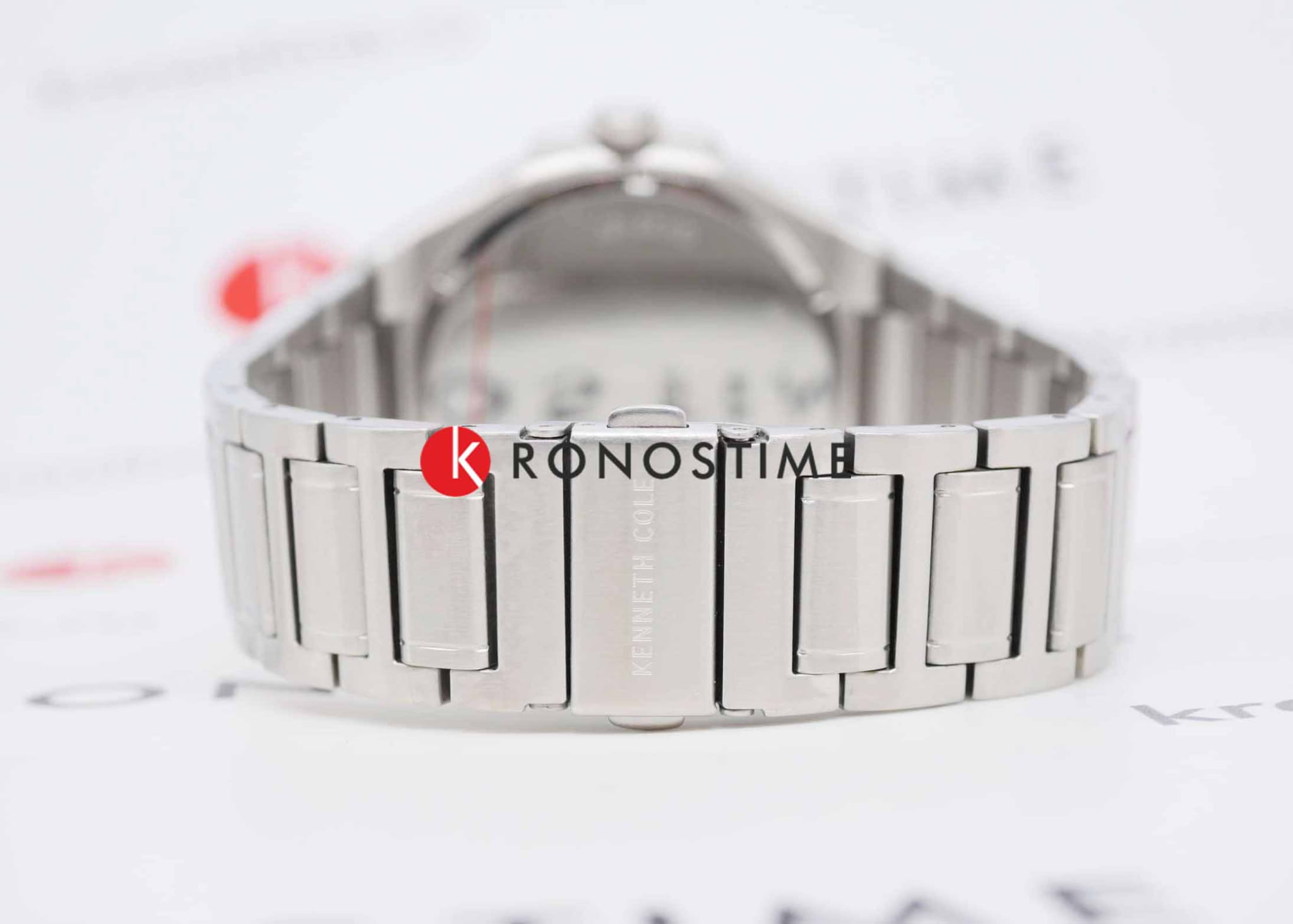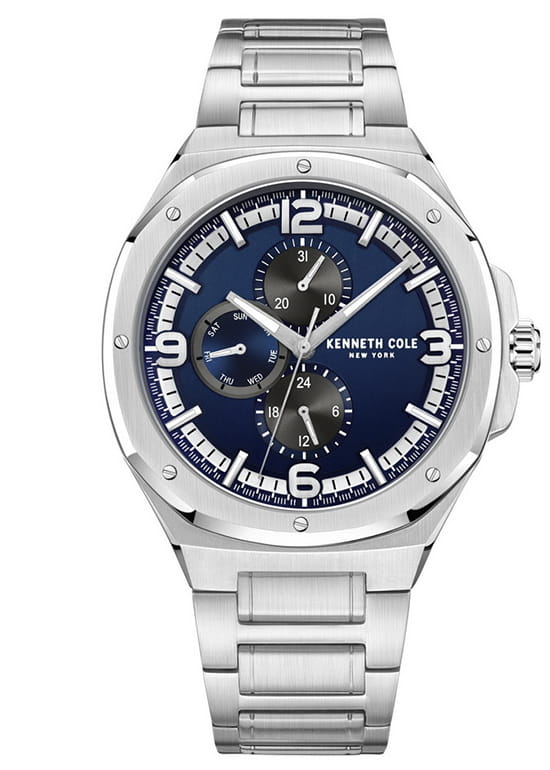 Мужские кварцевые часы-хронографХронографФункция позволяет измерять отрезки времени с особой точностью: часы, минуты, секунды. Верным признаком хронографа является наличие на циферблате 3 дополнительных окошек-счётчиков. с секундомеромСекундомерСекундоме́р — прибор, способный измерять интервалы времени с точностью до долей секунды. Kenneth Cole Dress Sport KCWGK2218704, кварцевый механизм с высокой точностью. Минеральное стеклоМинеральное стеклоМинеральное стекло представляет собой искусственно выращенный минерал кварца. Такое стекло отличается особой устойчивостью к повреждениям и царапинам. Уступает по некоторым качествам сапфировому стеклу. устойчивое к появлению царапин, обладающее высокой прозрачностью. Класс водозащиты: 30 метров, позволит защитить корпус от случайных брызг или капель дождя. Корпус и безельБезельВнешний ободок, закрепляющий стекло. В спортивных часах так называется поворотное кольцо с делениями на циферблате, выполняет роль таймера – замеряет отрезки времени на шкале. Неподвижный безель – элемент декора. Однонаправленно вращающийся безель на дайверских часах позволяет фиксировать моменты погружения и выныривания на поверхность. изготовлен из нержавеющей стали. Индикация даты и дня недели. Стрелки и метки с люминесцентным покрытиемЛюминесцентное покрытиеПозволяет считывать показания времени в темноте. Производители наносят на стрелки, часовые индексы, безель или поверхность циферблата светонакопительный состав, дающий холодное свечение.. Браслет из стали с раскладной застёжкойРаскладная застёжкаТакой тип застёжки используется только на браслетах из металла. Она никогда не раскрывается полностью, происходит разделение на 2 и более частей. Раскладывающая застёжка снизит вероятность потери часов к минимуму..