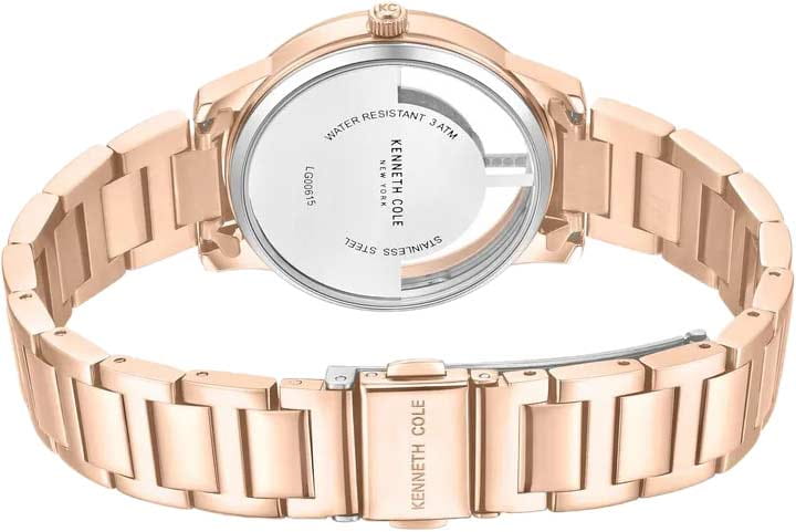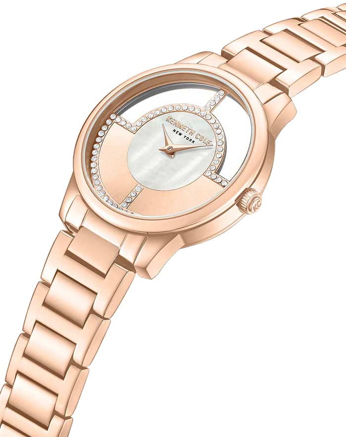 Женские кварцевые часы Kenneth Cole — это изысканный аксессуар, сочетающий элегантность и современный дизайн. Корпус диаметром 34 мм выполнен из нержавеющей стали с IP-покрытиемIP-покрытиеМетод ионного напыления. Демонстрирует повышенную устойчивость к истиранию, окислению и химическим веществам. Под воздействием высокого давления и температуры около 1500°C молекулы металла надёжно соединяются с частицами корпуса часов. золотого цвета. Циферблат золотистого цвета украшен вставками из перламутра и стразов из стекла, придающими сияние и глубину. Индексы на циферблате отсутствуют, что подчёркивает минималистичный и чистый образ. Циферблат защищён минеральным стекломМинеральное стеклоМинеральное стекло представляет собой искусственно выращенный минерал кварца. Такое стекло отличается особой устойчивостью к повреждениям и царапинам. Уступает по некоторым качествам сапфировому стеклу.. Особенностью модели является прозрачный корпус, добавляющий оригинальность и визуальную лёгкость дизайну. Часы оснащены стальным браслетом с IP-покрытиемIP-покрытиеМетод ионного напыления. Демонстрирует повышенную устойчивость к истиранию, окислению и химическим веществам. Под воздействием высокого давления и температуры около 1500°C молекулы металла надёжно соединяются с частицами корпуса часов. на раскладной застёжкеРаскладная застёжкаТакой тип застёжки используется только на браслетах из металла. Она никогда не раскрывается полностью, происходит разделение на 2 и более частей. Раскладывающая застёжка снизит вероятность потери часов к минимуму.. Водонепроницаемость 30 м позволяет использовать часы в повседневных условиях, защищая от случайных брызг и капель дождя. Утончённый стиль и необычные детали делают эти часы идеальным выбором для тех, кто ценит индивидуальность.