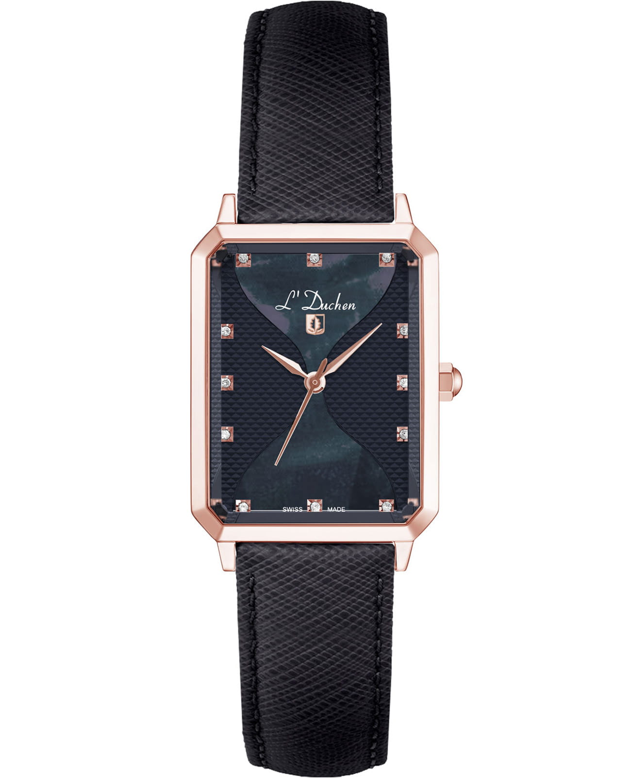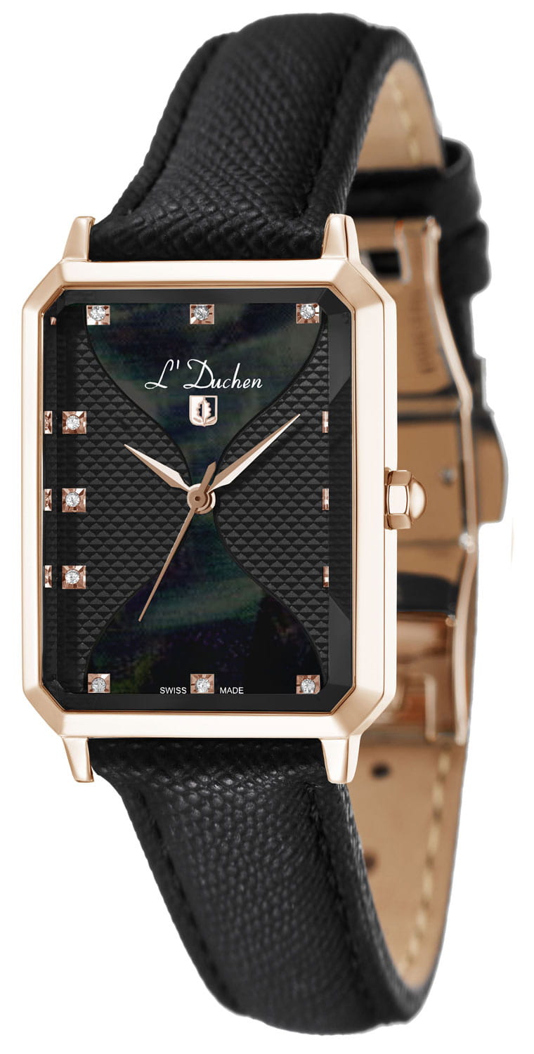 Женские швейцарские L'Duchen Pyramide D 591.41.31, кварцевый механизм с высокой точностью. Сапфировое стеклоСапфировое стеклоПрочный и надёжный материал из кристалла сапфира синтетического происхождения, характеризующийся особой твёрдостью и устойчивостью к царапинам и повреждениям. устойчивое к появлению царапин, обладающее высокой прозрачностью. Корпус часов выполнен из нержавеющей стали с PVD-покрытиемPVDУльтратонкое покрытие наносится в технике вакуумного напыления, сочетает в себе нитрид титана особой прочности со слоем золота или оксида хрома. Несёт в себе декоративную или защитную функцию.. Циферблат украшен фианитами. Класс водозащиты: 50 метров, позволит защитить корпус от случайных брызг или капель дождя. Кожаный ремешок.