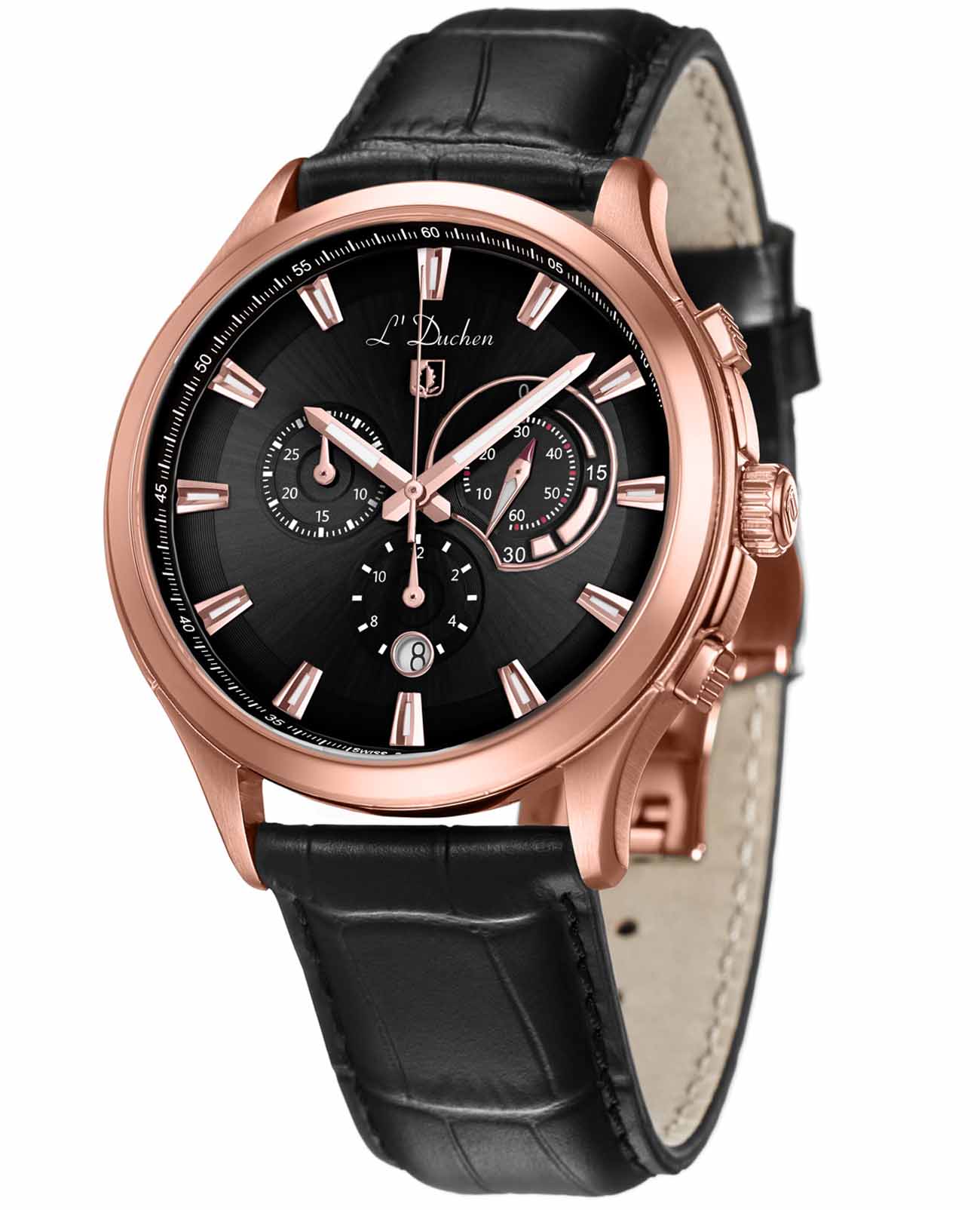 Мужские швейцарские часы- хронографХронографФункция позволяет измерять отрезки времени с особой точностью: часы, минуты, секунды. Верным признаком хронографа является наличие на циферблате 3 дополнительных окошек-счётчиков. L'Duchen Pilotage D 742.41.41, кварцевый механизм с высокой точностью. Сапфировое стеклоСапфировое стеклоПрочный и надёжный материал из кристалла сапфира синтетического происхождения, характеризующийся особой твёрдостью и устойчивостью к царапинам и повреждениям. устойчивое к появлению царапин, обладающее высокой прозрачностью. Корпус часов выполнен из нержавеющей стали с PVD-покрытиемPVDУльтратонкое покрытие наносится в технике вакуумного напыления, сочетает в себе нитрид титана особой прочности со слоем золота или оксида хрома. Несёт в себе декоративную или защитную функцию.. Стрелки с люминесцентным покрытиемЛюминесцентное покрытиеПозволяет считывать показания времени в темноте. Производители наносят на стрелки, часовые индексы, безель или поверхность циферблата светонакопительный состав, дающий холодное свечение.. Класс водозащиты: 100 метров, позволит плавать, нырять и заниматься другими водными видами спорта. Кожаный ремешок на застёжке «бабочка» с кнопкамиЗастёжка "бабочка"Такой вид застёжки дополняется предохранителями, помогающими избежать случайного раскрытия браслета. Обладают изящным исполнением. .