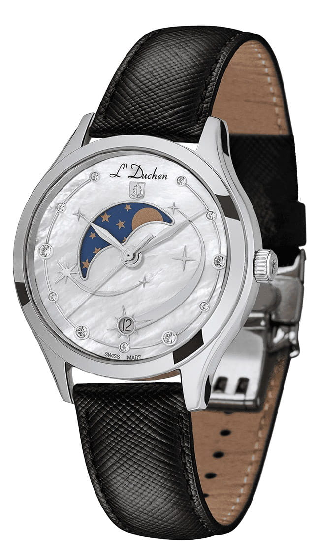 Женские кварцевые часы L'Duchen из коллекции Perseides — это волшебный аксессуар, вдохновлённый космическим зрелищем метеорного потока. Корпус диаметром 34 мм выполнен из нержавеющей стали 316L с эффектным чередованием полированных и матовых поверхностей. Циферблат белого цвета изготовлен из натурального перламутра, природная текстура которого создаёт уникальный фон. Центральная композиция украшена накладными элементами в виде падающих звёзд — символа метеорного потока Персеиды, в один из которых органично вписано окошко даты в положении 6 часов. Указатель фазы луны элегантно выделен металлической рамкой. Циферблат дополнительно сияет благодаря фианитам разного размера. Циферблат защищён сапфировым стекломСапфировое стеклоПрочный и надёжный материал из кристалла сапфира синтетического происхождения, характеризующийся особой твёрдостью и устойчивостью к царапинам и повреждениям.. Часы оснащены ремешком из натуральной кожи чёрного цвета с сафьяновым тиснением и застёжкой «бабочка» с кнопкамиЗастёжка "бабочка"Такой вид застёжки дополняется предохранителями, помогающими избежать случайного раскрытия браслета. Обладают изящным исполнением. , украшенной логотипом бренда — дубовым листом, символом мудрости и долговечности. Заводная головка и задняя крышка также декорированы фирменным тиснением. Водонепроницаемость 50 м позволяет использовать часы в повседневных условиях.
