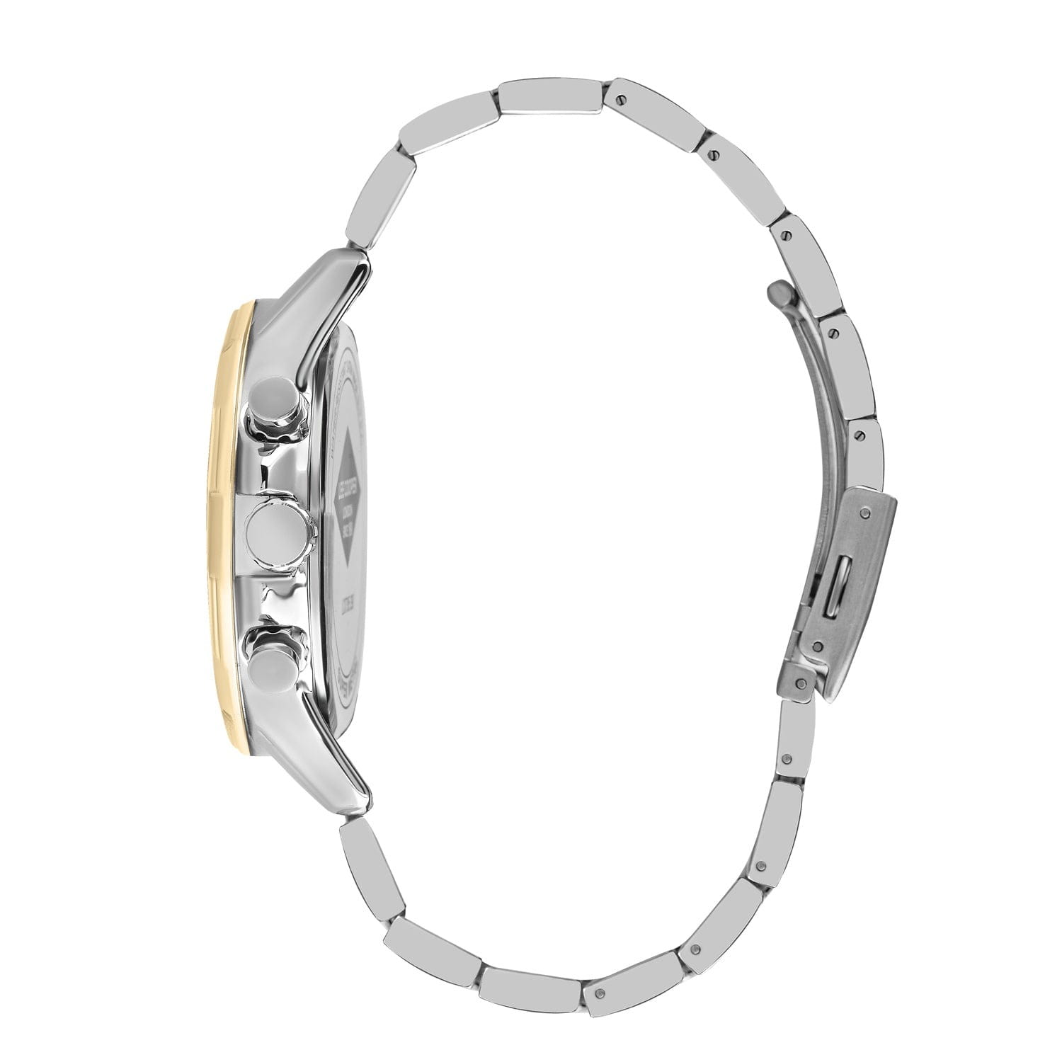 Мужские наручные часы Lee Cooper LC07385.260 — элегантная модель с функциональными возможностями для повседневного использования. Круглый корпус из нержавеющей стали с IP-покрытиемIP-покрытиеМетод ионного напыления. Демонстрирует повышенную устойчивость к истиранию, окислению и химическим веществам. Под воздействием высокого давления и температуры около 1500°C молекулы металла надёжно соединяются с частицами корпуса часов., а  безельБезельВнешний ободок, закрепляющий стекло. В спортивных часах так называется поворотное кольцо с делениями на циферблате, выполняет роль таймера – замеряет отрезки времени на шкале. Неподвижный безель – элемент декора. Однонаправленно вращающийся безель на дайверских часах позволяет фиксировать моменты погружения и выныривания на поверхность. золотистого цвета придаёт часам классический и современный вид. Чёрный циферблат оснащён дополнительными индикаторами и функцией хронографХронографФункция позволяет измерять отрезки времени с особой точностью: часы, минуты, секунды. Верным признаком хронографа является наличие на циферблате 3 дополнительных окошек-счётчиков., что позволяет измерять временные интервалы с высокой точностью. Стрелки и метки покрыты люминесцентным покрытиемЛюминесцентное покрытиеПозволяет считывать показания времени в темноте. Производители наносят на стрелки, часовые индексы, безель или поверхность циферблата светонакопительный состав, дающий холодное свечение., обеспечивая удобное считывание показаний в условиях недостаточного освещения. Циферблат защищён минеральным стекломМинеральное стеклоМинеральное стекло представляет собой искусственно выращенный минерал кварца. Такое стекло отличается особой устойчивостью к повреждениям и царапинам. Уступает по некоторым качествам сапфировому стеклу., устойчивым к царапинам. Часы работают на кварцевом механизме, обеспечивающем точность хода. Браслет из нержавеющей стали с раскладной застёжкойРаскладная застёжкаТакой тип застёжки используется только на браслетах из металла. Она никогда не раскрывается полностью, происходит разделение на 2 и более частей. Раскладывающая застёжка снизит вероятность потери часов к минимуму. гарантирует удобную посадку и надёжную фиксацию на запястье. Водозащита 30 метров защищает часы от брызг и дождя, делая их подходящими для повседневного использования.