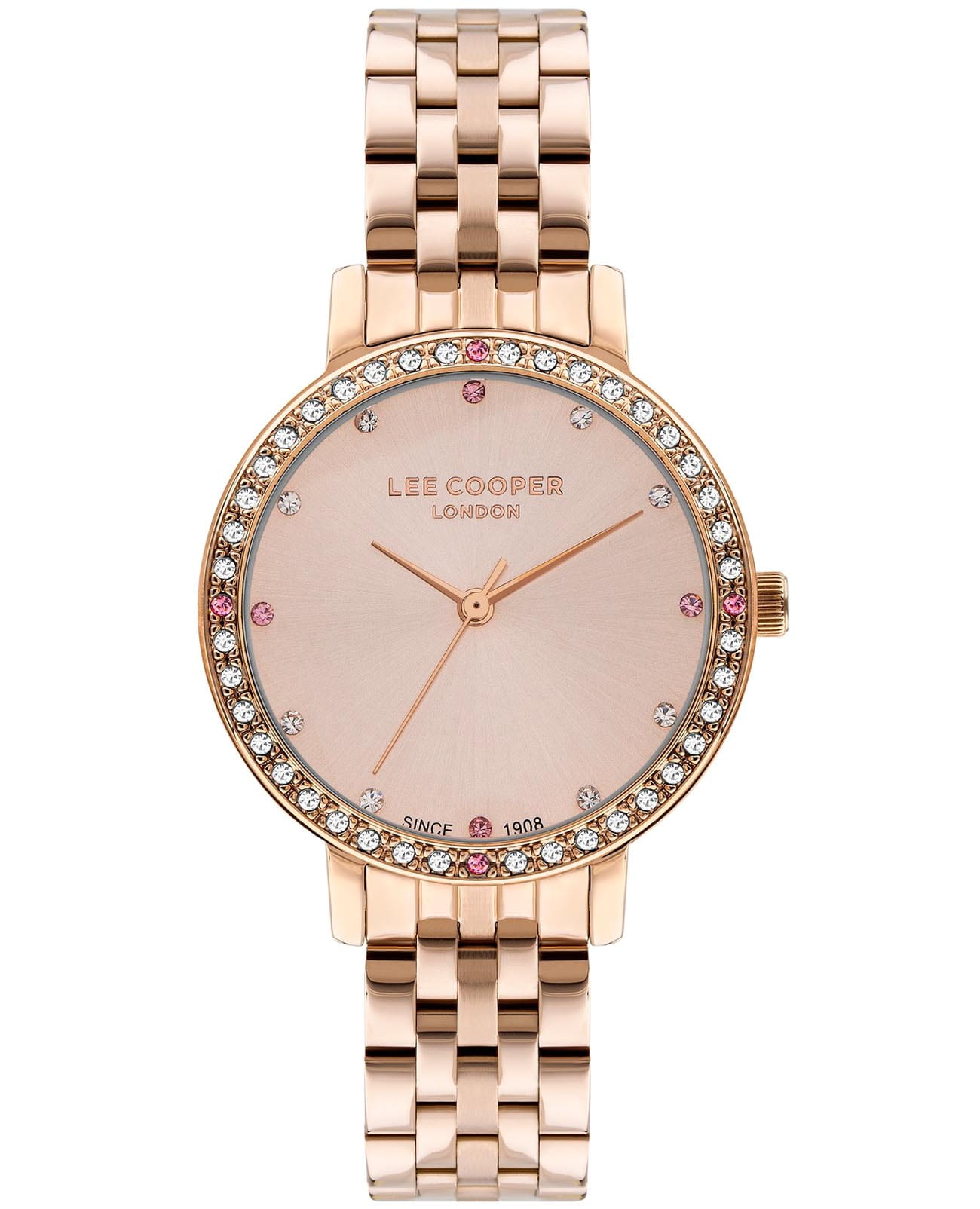 Женские часы Lee Cooper LC07590.410 — это стильное сочетание элегантности и современного дизайна. Круглый корпус диаметром 34 мм выполнен из суперметалла с IP-покрытиемIP-покрытиеМетод ионного напыления. Демонстрирует повышенную устойчивость к истиранию, окислению и химическим веществам. Под воздействием высокого давления и температуры около 1500°C молекулы металла надёжно соединяются с частицами корпуса часов. цвета розового золота. Неподвижный безельБезельВнешний ободок, закрепляющий стекло. В спортивных часах так называется поворотное кольцо с делениями на циферблате, выполняет роль таймера – замеряет отрезки времени на шкале. Неподвижный безель – элемент декора. Однонаправленно вращающийся безель на дайверских часах позволяет фиксировать моменты погружения и выныривания на поверхность. инкрустирован цирконами, что придает модели особый блеск. Циферблат с минималистичными метками в виде точек придает часам элегантность и утонченность, делая их идеальным аксессуаром для любой женщины, а минеральное стеклоМинеральное стеклоМинеральное стекло представляет собой искусственно выращенный минерал кварца. Такое стекло отличается особой устойчивостью к повреждениям и царапинам. Уступает по некоторым качествам сапфировому стеклу., обеспечивает устойчивость к царапинам. Центральные часовая, минутная и секундная стрелки. Часы оснащены надежным кварцевым механизмом, источник питания - батарейка. Металлический браслет с IP-покрытиемIP-покрытиеМетод ионного напыления. Демонстрирует повышенную устойчивость к истиранию, окислению и химическим веществам. Под воздействием высокого давления и температуры около 1500°C молекулы металла надёжно соединяются с частицами корпуса часов. на раскладной застёжкеРаскладная застёжкаТакой тип застёжки используется только на браслетах из металла. Она никогда не раскрывается полностью, происходит разделение на 2 и более частей. Раскладывающая застёжка снизит вероятность потери часов к минимуму. гарантирует комфортную посадку на запястье. Водозащита 30 метров защищает модель от случайных брызг и дождя. Lee Cooper  — отличный выбор для тех, кто ценит утонченность и качество.