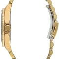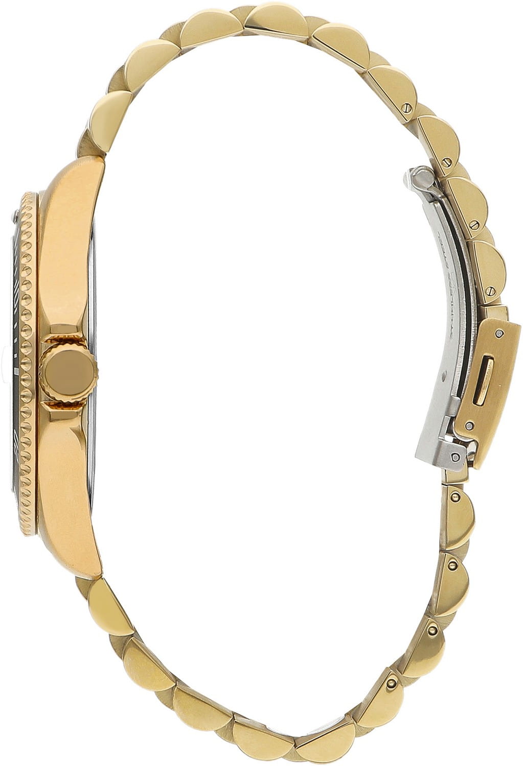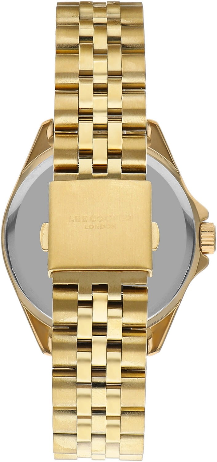Женские часы Lee Cooper LC07593.130 — это стильное сочетание элегантности и современного дизайна. Круглый корпус диаметром 36 мм выполнен из суперметалла с IP-покрытиемIP-покрытиеМетод ионного напыления. Демонстрирует повышенную устойчивость к истиранию, окислению и химическим веществам. Под воздействием высокого давления и температуры около 1500°C молекулы металла надёжно соединяются с частицами корпуса часов. золотистого цвета. Циферблат защищен минеральным стекломМинеральное стеклоМинеральное стекло представляет собой искусственно выращенный минерал кварца. Такое стекло отличается особой устойчивостью к повреждениям и царапинам. Уступает по некоторым качествам сапфировому стеклу., обеспечивающий устойчивость к царапинам. Поворотный безельБезельВнешний ободок, закрепляющий стекло. В спортивных часах так называется поворотное кольцо с делениями на циферблате, выполняет роль таймера – замеряет отрезки времени на шкале. Неподвижный безель – элемент декора. Однонаправленно вращающийся безель на дайверских часах позволяет фиксировать моменты погружения и выныривания на поверхность. с IP-покрытиемIP-покрытиеМетод ионного напыления. Демонстрирует повышенную устойчивость к истиранию, окислению и химическим веществам. Под воздействием высокого давления и температуры около 1500°C молекулы металла надёжно соединяются с частицами корпуса часов. черного цвета. Центральные часовая, минутная и секундная стрелки. Часы оснащены надежным кварцевым механизмом, источник питания - батарейка. Металлический браслет на раскладной застёжкеРаскладная застёжкаТакой тип застёжки используется только на браслетах из металла. Она никогда не раскрывается полностью, происходит разделение на 2 и более частей. Раскладывающая застёжка снизит вероятность потери часов к минимуму. гарантирует комфортную посадку на запястье. Водозащита 30 метров защищает модель от случайных брызг и дождя. Стрелки с люминесцентным покрытиемЛюминесцентное покрытиеПозволяет считывать показания времени в темноте. Производители наносят на стрелки, часовые индексы, безель или поверхность циферблата светонакопительный состав, дающий холодное свечение. позволяющие легко определять время даже в темноте. Lee Cooper  — отличный выбор для тех, кто ценит утонченность и качество.