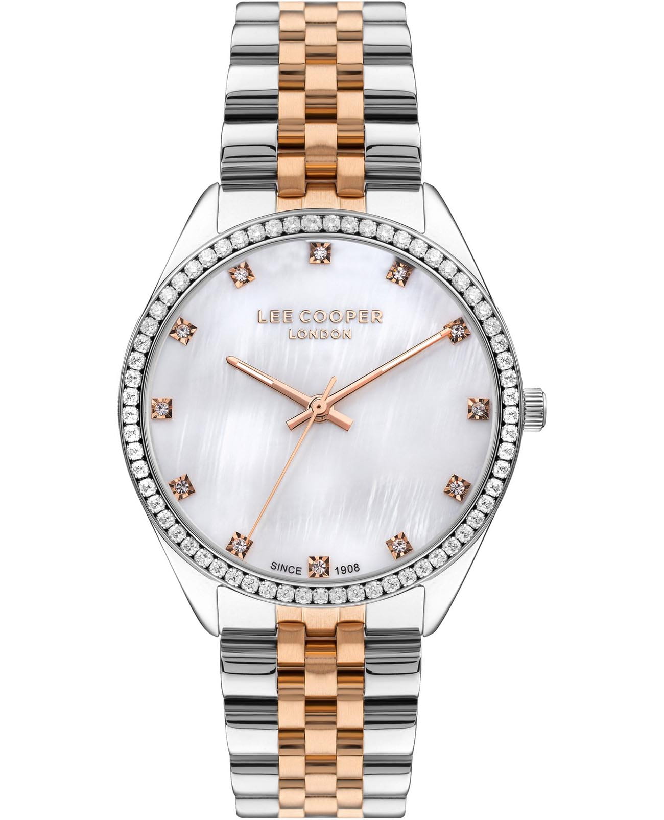 Женские часы Lee Cooper LC07831.520 выполнены в классическом стиле и сочетают строгий дизайн с надёжным механизмом. Модель оснащена кварцевым механизмом, обеспечивающим точность хода и минимальное обслуживание. Корпус круглой формы имеет размер 36 мм, изготовлен из суперметалла с изысканным неподвижным безелемБезельВнешний ободок, закрепляющий стекло. В спортивных часах так называется поворотное кольцо с делениями на циферблате, выполняет роль таймера – замеряет отрезки времени на шкале. Неподвижный безель – элемент декора. Однонаправленно вращающийся безель на дайверских часах позволяет фиксировать моменты погружения и выныривания на поверхность. с вставками из циркона, гарантирует комфорт при ношении. Циферблат дополнен изящными вставками из циркона для чёткого отсчёта времени. Защиту циферблата обеспечивает минеральное стеклоМинеральное стеклоМинеральное стекло представляет собой искусственно выращенный минерал кварца. Такое стекло отличается особой устойчивостью к повреждениям и царапинам. Уступает по некоторым качествам сапфировому стеклу., устойчивое к мелким механическим повреждениям. Стрелки с люминесцентным покрытиемЛюминесцентное покрытиеПозволяет считывать показания времени в темноте. Производители наносят на стрелки, часовые индексы, безель или поверхность циферблата светонакопительный состав, дающий холодное свечение.. Стальной браслет с частичным IP-покрытиемIP-покрытиеМетод ионного напыления. Демонстрирует повышенную устойчивость к истиранию, окислению и химическим веществам. Под воздействием высокого давления и температуры около 1500°C молекулы металла надёжно соединяются с частицами корпуса часов. на раскладной застёжкеРаскладная застёжкаТакой тип застёжки используется только на браслетах из металла. Она никогда не раскрывается полностью, происходит разделение на 2 и более частей. Раскладывающая застёжка снизит вероятность потери часов к минимуму. гарантирует удобную посадку и надёжную фиксацию на запястье. Водозащита 30WR позволяет использовать часы в повседневных условиях без риска повреждения от случайных брызг воды. Это сочетание классического дизайна, прочности материалов и качества исполнения для уверенных в себе женщин.