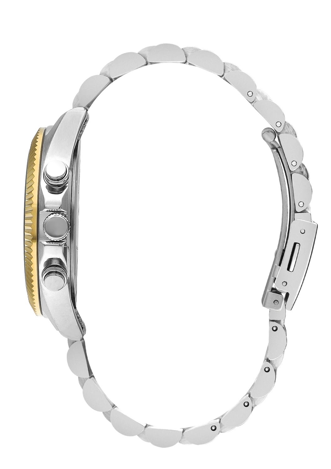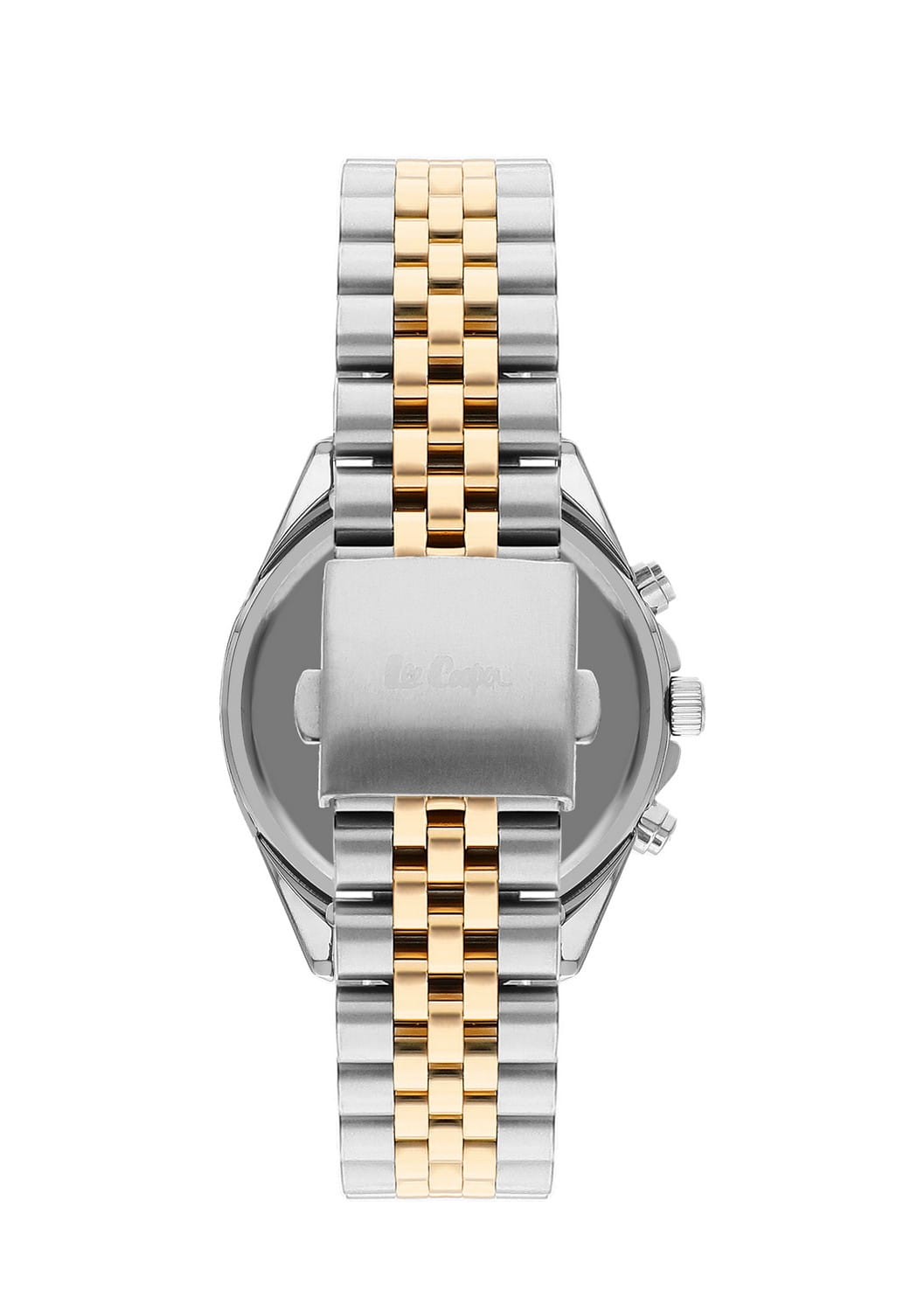 Мужские часы Lee Cooper LC07838.270 — это стильное сочетание элегантности и современного дизайна. Корпус диаметром 45 мм выполнен из суперметалла серебристого цвета с неподвижным безелемБезельВнешний ободок, закрепляющий стекло. В спортивных часах так называется поворотное кольцо с делениями на циферблате, выполняет роль таймера – замеряет отрезки времени на шкале. Неподвижный безель – элемент декора. Однонаправленно вращающийся безель на дайверских часах позволяет фиксировать моменты погружения и выныривания на поверхность. с IP-покрытиемIP-покрытиеМетод ионного напыления. Демонстрирует повышенную устойчивость к истиранию, окислению и химическим веществам. Под воздействием высокого давления и температуры около 1500°C молекулы металла надёжно соединяются с частицами корпуса часов., придающий модели особый блеск. Изысканный циферблат защищен минеральным стекломМинеральное стеклоМинеральное стекло представляет собой искусственно выращенный минерал кварца. Такое стекло отличается особой устойчивостью к повреждениям и царапинам. Уступает по некоторым качествам сапфировому стеклу., обеспечивающим устойчивость к царапинам. Метки в виде штрихов. Вынесенный циферблат с 24-х часовым указателем времени и c хронографомХронографФункция позволяет измерять отрезки времени с особой точностью: часы, минуты, секунды. Верным признаком хронографа является наличие на циферблате 3 дополнительных окошек-счётчиков.. Стрелки и метки с люминесцентным покрытиемЛюминесцентное покрытиеПозволяет считывать показания времени в темноте. Производители наносят на стрелки, часовые индексы, безель или поверхность циферблата светонакопительный состав, дающий холодное свечение. позволяют легко считывать время даже в условиях недостаточного освещения.Часы оснащены надежным кварцевым механизмом, а стальной браслет с частичным IP-покрытиемIP-покрытиеМетод ионного напыления. Демонстрирует повышенную устойчивость к истиранию, окислению и химическим веществам. Под воздействием высокого давления и температуры около 1500°C молекулы металла надёжно соединяются с частицами корпуса часов. на раскладной застёжкеРаскладная застёжкаТакой тип застёжки используется только на браслетах из металла. Она никогда не раскрывается полностью, происходит разделение на 2 и более частей. Раскладывающая застёжка снизит вероятность потери часов к минимуму. гарантирует комфортную посадку на запястье. Водозащита 50 метров защищает модель от случайных брызг и дождя. Lee Cooper — отличный выбор для тех, кто ценит утонченность и качество.