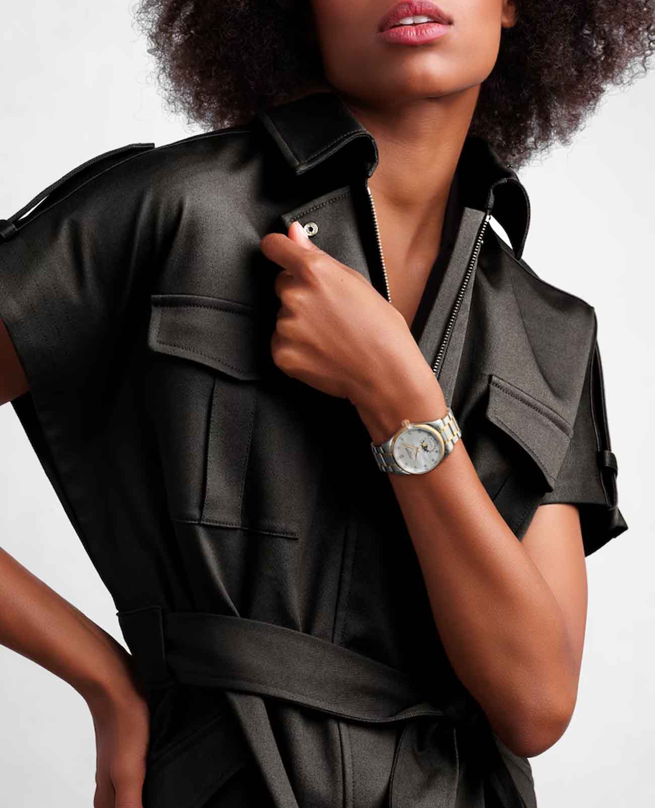 . Циферблат с 12 бриллиантами группы Top Wesselton VS-SI общим весом 0.055 карата. Прозрачная задняя крышка. Маленький стрелочный указатель фаз Луны и даты в положении 6 часов. Класс водозащиты: 30 метров, позволит защитить корпус от случайных брызг или капель дождя. Стальной браслет 18-каратным золотом18-каратное золотоОбозначение по каратной системе пробирования, оно показывает, сколько драгоценного металла содержится в изделии. 18 карат - в составе 75% чистого золота, соответствует 750 пробе.
