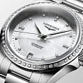 Женские швейцарские механические часы с автоподзаводом Longines Conquest L3.430.0.87.6. Сапфировое стеклоСапфировое стеклоПрочный и надёжный материал из кристалла сапфира синтетического происхождения, характеризующийся особой твёрдостью и устойчивостью к царапинам и повреждениям. устойчивое к появлению царапин, обладающее высокой прозрачностью. Корпус часов изготовлен из нержавеющей стали. Циферблат выполнен по технологии Sunray (солнечные лучи). Циферблат и безельБезельВнешний ободок, закрепляющий стекло. В спортивных часах так называется поворотное кольцо с делениями на циферблате, выполняет роль таймера – замеряет отрезки времени на шкале. Неподвижный безель – элемент декора. Однонаправленно вращающийся безель на дайверских часах позволяет фиксировать моменты погружения и выныривания на поверхность. украшены бриллиантами группы Top Wesselton VS-SI. Стрелки с люминесцентным покрытиемЛюминесцентное покрытиеПозволяет считывать показания времени в темноте. Производители наносят на стрелки, часовые индексы, безель или поверхность циферблата светонакопительный состав, дающий холодное свечение. Super-LumiNova. Окошко даты в положении 6 часов. Прозрачная задняя крышка. Класс водозащиты: 100 метров, позволит плавать, нырять и заниматься другими водными видами спорта. Стальной браслет на раскладной застёжкеРаскладная застёжкаТакой тип застёжки используется только на браслетах из металла. Она никогда не раскрывается полностью, происходит разделение на 2 и более частей. Раскладывающая застёжка снизит вероятность потери часов к минимуму..