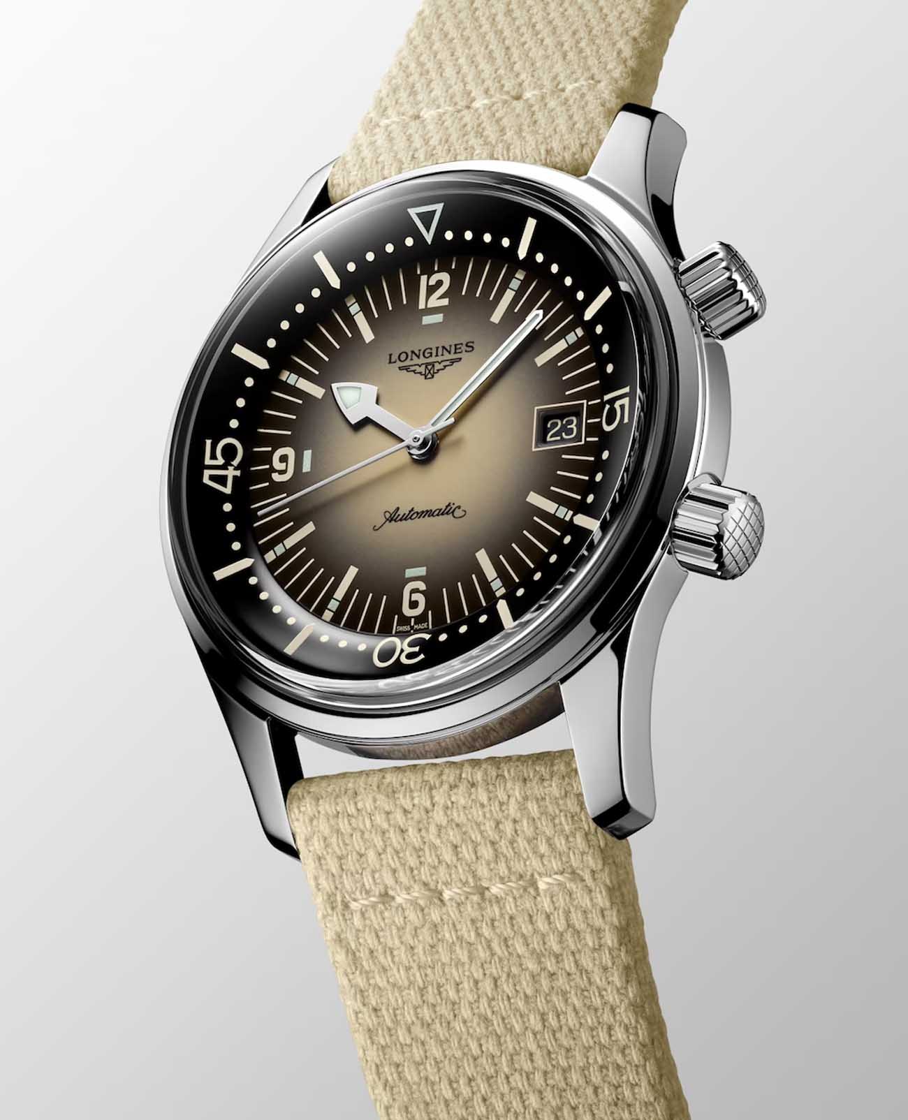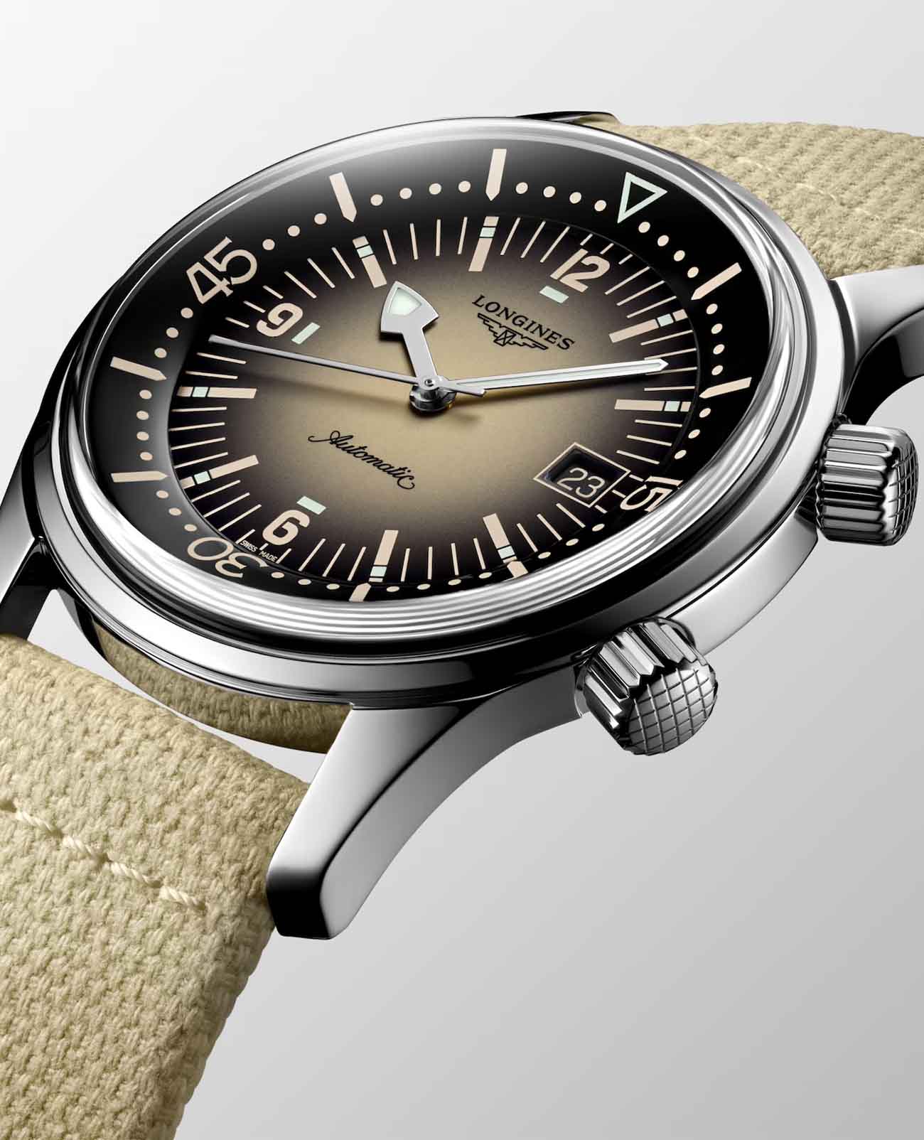 Мужские швейцарские механические часы с автоподзаводом Longines Legend Diver Watch L3.774.4.30.2. Сапфировое стеклоСапфировое стеклоПрочный и надёжный материал из кристалла сапфира синтетического происхождения, характеризующийся особой твёрдостью и устойчивостью к царапинам и повреждениям. устойчивое к появлению царапин, обладающее высокой прозрачностью. Корпус часов из нержавеющей стали. Стрелки и метки с люминесцентным покрытиемЛюминесцентное покрытиеПозволяет считывать показания времени в темноте. Производители наносят на стрелки, часовые индексы, безель или поверхность циферблата светонакопительный состав, дающий холодное свечение.. Нарисованные арабские цифры и метки. Окошко даты в положении 3 часов. Класс водозащиты: 300 метров, позволит плавать, нырять и заниматься другими водными видами спорта. Тканевый ремешок на стандартной застежке. Вращающийся стальной безельБезельВнешний ободок, закрепляющий стекло. В спортивных часах так называется поворотное кольцо с делениями на циферблате, выполняет роль таймера – замеряет отрезки времени на шкале. Неподвижный безель – элемент декора. Однонаправленно вращающийся безель на дайверских часах позволяет фиксировать моменты погружения и выныривания на поверхность..