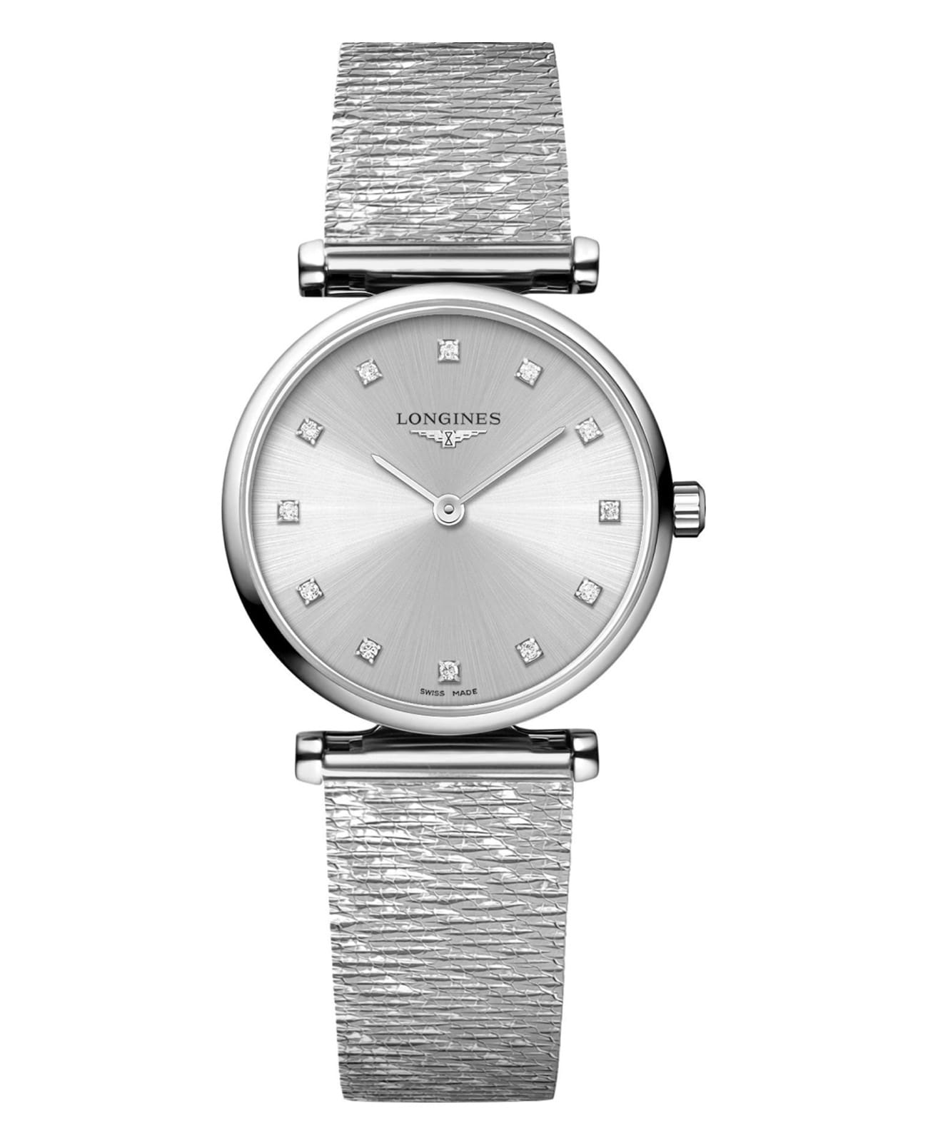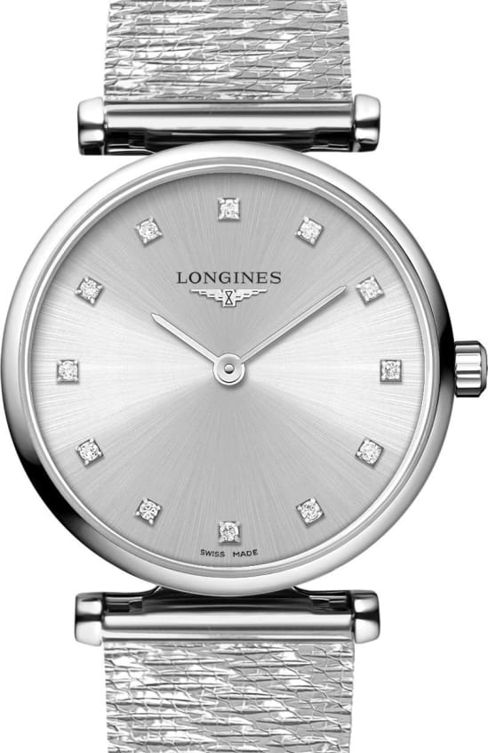 Женские швейцарские часы Longines La Grande Classique L4.209.4.74.6, кварцевый механизм с высокой точностью. Сапфировое стеклоСапфировое стеклоПрочный и надёжный материал из кристалла сапфира синтетического происхождения, характеризующийся особой твёрдостью и устойчивостью к царапинам и повреждениям. устойчивое к появлению царапин, обладающее высокой прозрачностью. Корпус часов изготовлен из стали. Циферблат дополнен 12 бриллиантами. Класс водозащиты: 30 метров, позволит защитить корпус от случайных брызг или капель дождя. Браслет из стали на раскладной застёжкеРаскладная застёжкаТакой тип застёжки используется только на браслетах из металла. Она никогда не раскрывается полностью, происходит разделение на 2 и более частей. Раскладывающая застёжка снизит вероятность потери часов к минимуму..