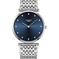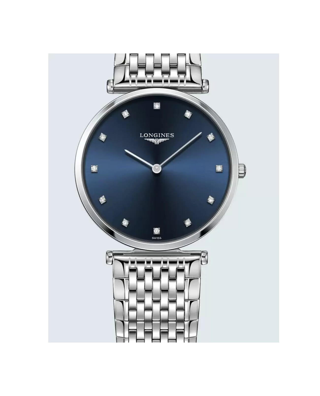 Компактный синий циферблат украшен 12 бриллиантами общим весом 0,081 карата. Элегантным дополнением стал стальной браслет оригинального плетения. Швейцарский кварцевый калибр L420 обеспечивает высокую точность хода. Сапфировое стекло не допускает появления царапин на поверхности.