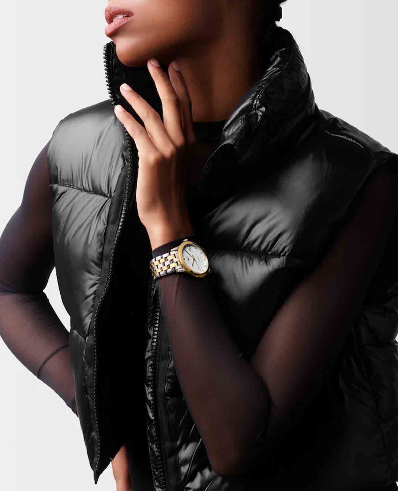 Сапфировое стеклоСапфировое стеклоПрочный и надёжный материал из кристалла сапфира синтетического происхождения, характеризующийся особой твёрдостью и устойчивостью к царапинам и повреждениям., отличающееся высокой устойчивостью к царапинам, дополнено антибликовым покрытиемАнтибликовое покрытиеСлой оксида металла в 0,13-0,3 микрон, благодаря которому стекло часов не бликует и не отражает свет. Антибликовое покрытие уменьшает отражение света в 10 раз, обеспечивая отличную читаемость показателей циферблата., что гарантирует отличную видимость циферблата в любых условиях освещения. БезельБезельВнешний ободок, закрепляющий стекло. В спортивных часах так называется поворотное кольцо с делениями на циферблате, выполняет роль таймера – замеряет отрезки времени на шкале. Неподвижный безель – элемент декора. Однонаправленно вращающийся безель на дайверских часах позволяет фиксировать моменты погружения и выныривания на поверхность. украшен элегантным PVD-покрытиемPVDУльтратонкое покрытие наносится в технике вакуумного напыления, сочетает в себе нитрид титана особой прочности со слоем золота или оксида хрома. Несёт в себе декоративную или защитную функцию., придающим часам ещё больше шарма. Циферблат украшен 13 бриллиантами группы Top Wesselton VS-SI, общий вес которых составляет 0.059 карата, подчеркивая утончённость и роскошь модели. Браслет также покрыт PVD-покрытиемPVDУльтратонкое покрытие наносится в технике вакуумного напыления, сочетает в себе нитрид титана особой прочности со слоем золота или оксида хрома. Несёт в себе декоративную или защитную функцию. и оборудован удобной застёжкой «бабочка» с кнопкамиЗастёжка "бабочка"Такой вид застёжки дополняется предохранителями, помогающими избежать случайного раскрытия браслета. Обладают изящным исполнением. , обеспечивая комфортное ношение. Окошко даты расположено в положении 3 часа, а прозрачная задняя крышка позволяет наблюдать за плавными движениями механизмов внутри часов. Водонепроницаемость корпуса составляет 30 метров, что достаточно для защиты от случайных брызг или капель дождя.