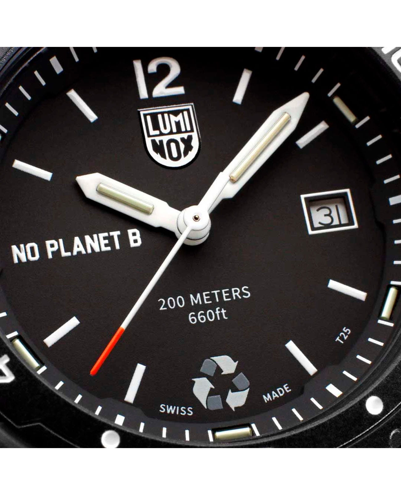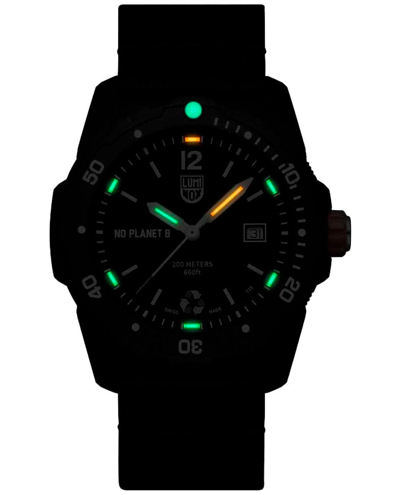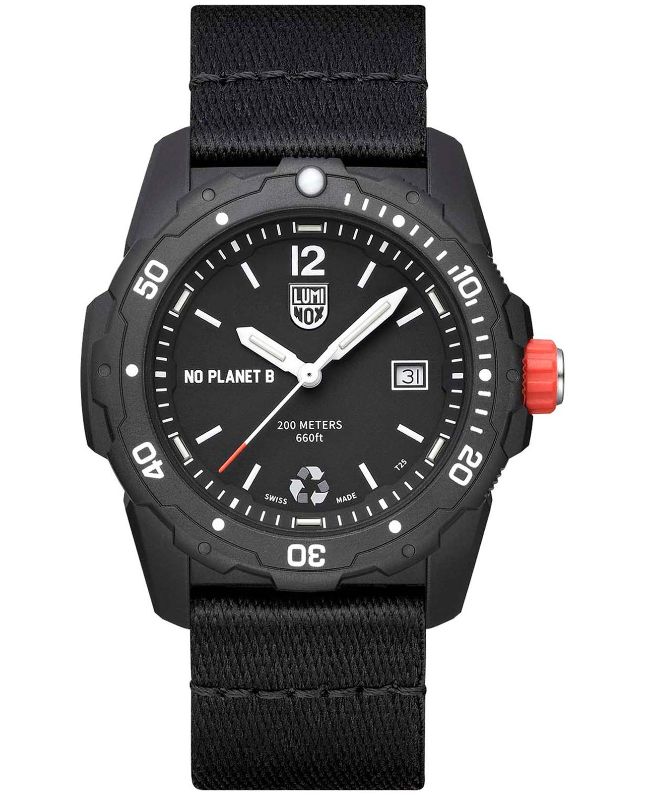 Мужские наручные часы Luminox Bear Grylls Survival ECO NO PLANET B XB.3722.ECO сочетают в себе экологичность и функциональность для любителей активного образа жизни. Модель обладает круглым корпусом диаметром 43 мм, изготовленным из переработанного океанского пластика, что обеспечивает высокую устойчивость к внешним воздействиям при минимальном воздействии на окружающую среду. Браслет выполнен из нейлона черного цвета на стандартной застежке, гарантирующей комфортное ношение и безопасность. Циферблат черного цвета оснащен индикацией времени и даты, а также люминесцентными элементами для видимости в темноте. Для защиты используется минеральное стеклоМинеральное стеклоМинеральное стекло представляет собой искусственно выращенный минерал кварца. Такое стекло отличается особой устойчивостью к повреждениям и царапинам. Уступает по некоторым качествам сапфировому стеклу., обеспечивающее прочную защиту от царапин. Часы комплектуются вращающимся безелемБезельВнешний ободок, закрепляющий стекло. В спортивных часах так называется поворотное кольцо с делениями на циферблате, выполняет роль таймера – замеряет отрезки времени на шкале. Неподвижный безель – элемент декора. Однонаправленно вращающийся безель на дайверских часах позволяет фиксировать моменты погружения и выныривания на поверхность. с односторонним вращением, полезным для подсчета времени погружения или других временных интервалов.Часы работают на кварцевом механизме Ronda 515, который обеспечивает точное время без необходимости подзаводки, при этом срок службы батарейки составляет около 3-4 лет. Водонепроницаемость часов достигает 200 метров (20 атмосфер), что позволяет использовать их при плавании, дайвинге и других водных видах спорта. Luminox XB.3722.ECO — это не просто аксессуар, а инструмент для выживания, созданный в сотрудничестве с Bear Grylls, который подчеркивает важность защиты нашей планеты через использование материалов из переработанного пластика.