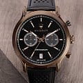 Мужские итальянские часы-хронографХронографФункция позволяет измерять отрезки времени с особой точностью: часы, минуты, секунды. Верным признаком хронографа является наличие на циферблате 3 дополнительных окошек-счётчиков. Maserati Legend R8871638001, кварцевый механизм с высокой точностью. Корпус часов изготовлен из стали с PVD-покрытиемPVDУльтратонкое покрытие наносится в технике вакуумного напыления, сочетает в себе нитрид титана особой прочности со слоем золота или оксида хрома. Несёт в себе декоративную или защитную функцию.. Стрелки с люминесцентным покрытиемЛюминесцентное покрытиеПозволяет считывать показания времени в темноте. Производители наносят на стрелки, часовые индексы, безель или поверхность циферблата светонакопительный состав, дающий холодное свечение.. Класс водозащиты: 100 метров, позволит плавать, нырять и заниматься другими водными видами спорта. Кожаный ремешок на стандартной застежке.