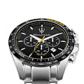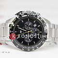 Черный циферблат оснащен тремя дополнительными счетчиками, выполняющими функции хронографаХронографФункция позволяет измерять отрезки времени с особой точностью: часы, минуты, секунды. Верным признаком хронографа является наличие на циферблате 3 дополнительных окошек-счётчиков., что позволяет точно измерять промежутки времени. Стрелки и часовые метки покрыты люминесцентным составомЛюминесцентное покрытиеПозволяет считывать показания времени в темноте. Производители наносят на стрелки, часовые индексы, безель или поверхность циферблата светонакопительный состав, дающий холодное свечение., обеспечивая отличную читаемость в условиях низкой освещенности.