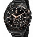Мужские наручные часы-хронографХронографФункция позволяет измерять отрезки времени с особой точностью: часы, минуты, секунды. Верным признаком хронографа является наличие на циферблате 3 дополнительных окошек-счётчиков. Maserati R8873612048, кварцевый механизм (автоматический калибр) с высокой точностью. Минеральное стеклоМинеральное стеклоМинеральное стекло представляет собой искусственно выращенный минерал кварца. Такое стекло отличается особой устойчивостью к повреждениям и царапинам. Уступает по некоторым качествам сапфировому стеклу. устойчивое к появлению царапин, обладающее высокой прозрачностью. Стрелки с люминесцентным покрытиемЛюминесцентное покрытиеПозволяет считывать показания времени в темноте. Производители наносят на стрелки, часовые индексы, безель или поверхность циферблата светонакопительный состав, дающий холодное свечение.. Класс водозащиты: 100 метров, позволит плавать, нырять и заниматься другими водными видами спорта. Корпус часов изготовлен из нержавеющей стали с PVD-покрытиемPVDУльтратонкое покрытие наносится в технике вакуумного напыления, сочетает в себе нитрид титана особой прочности со слоем золота или оксида хрома. Несёт в себе декоративную или защитную функцию.. Браслет с раскладной застёжкойРаскладная застёжкаТакой тип застёжки используется только на браслетах из металла. Она никогда не раскрывается полностью, происходит разделение на 2 и более частей. Раскладывающая застёжка снизит вероятность потери часов к минимуму. и с PVD-покрытиемPVDУльтратонкое покрытие наносится в технике вакуумного напыления, сочетает в себе нитрид титана особой прочности со слоем золота или оксида хрома. Несёт в себе декоративную или защитную функцию..