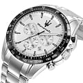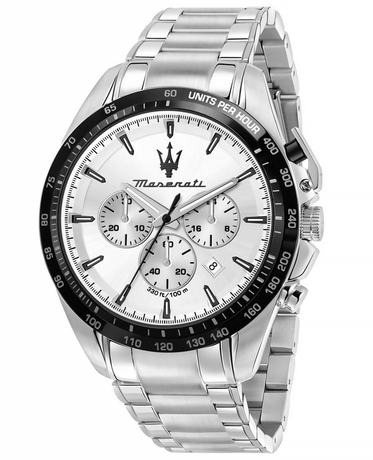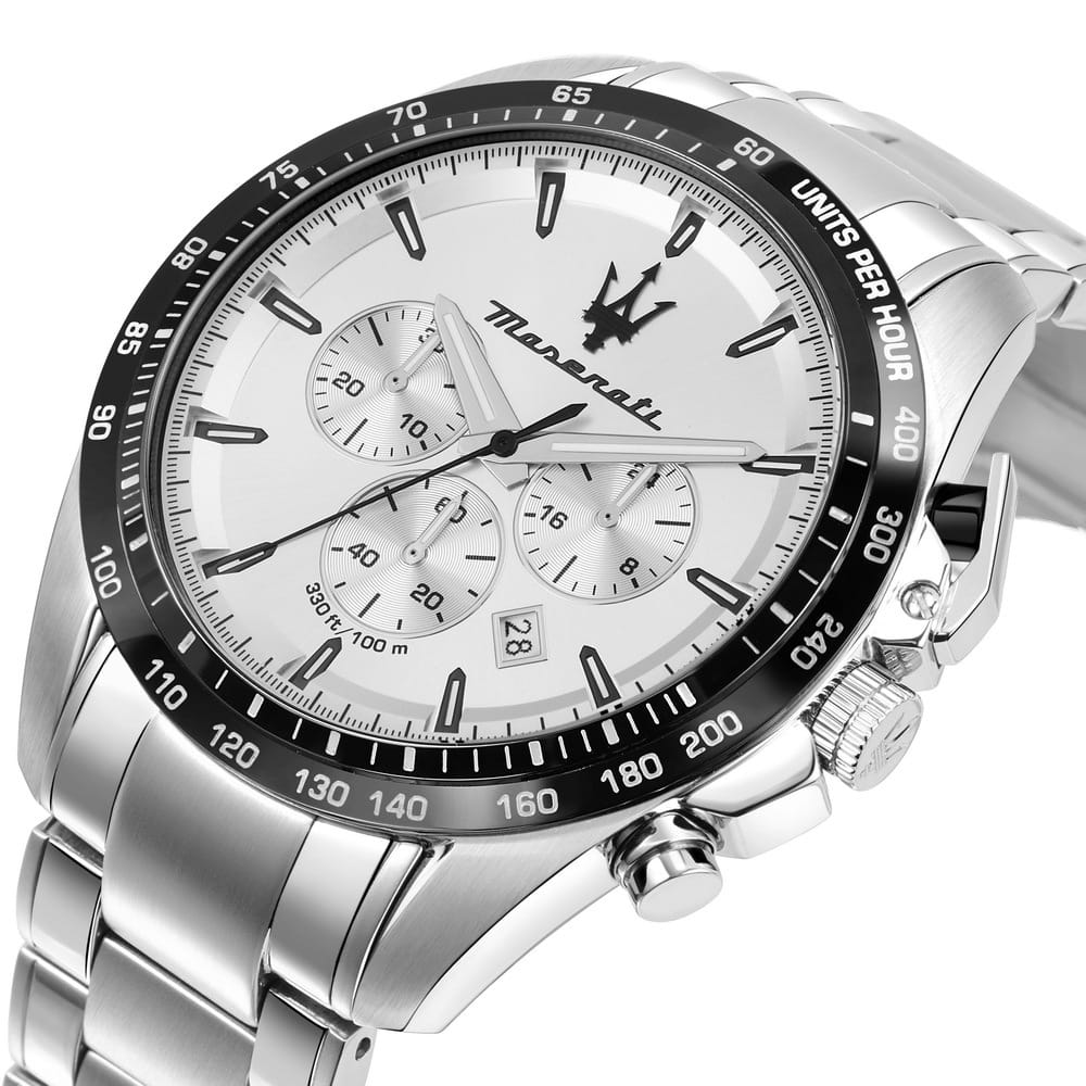 Мужские наручные часы-хронографХронографФункция позволяет измерять отрезки времени с особой точностью: часы, минуты, секунды. Верным признаком хронографа является наличие на циферблате 3 дополнительных окошек-счётчиков. Maserati R8873650002, кварцевый механизм (автоматический калибр) с высокой точностью. Минеральное стеклоМинеральное стеклоМинеральное стекло представляет собой искусственно выращенный минерал кварца. Такое стекло отличается особой устойчивостью к повреждениям и царапинам. Уступает по некоторым качествам сапфировому стеклу. устойчивое к появлению царапин, обладающее высокой прозрачностью. Стрелки и метки с люминесцентным покрытиемЛюминесцентное покрытиеПозволяет считывать показания времени в темноте. Производители наносят на стрелки, часовые индексы, безель или поверхность циферблата светонакопительный состав, дающий холодное свечение.. Класс водозащиты: 100 метров, позволит плавать, нырять и заниматься другими водными видами спорта.БезельБезельВнешний ободок, закрепляющий стекло. В спортивных часах так называется поворотное кольцо с делениями на циферблате, выполняет роль таймера – замеряет отрезки времени на шкале. Неподвижный безель – элемент декора. Однонаправленно вращающийся безель на дайверских часах позволяет фиксировать моменты погружения и выныривания на поверхность. изготовлен из нержавеющей стали с PVD-покрытиемPVDУльтратонкое покрытие наносится в технике вакуумного напыления, сочетает в себе нитрид титана особой прочности со слоем золота или оксида хрома. Несёт в себе декоративную или защитную функцию.. Браслет с раскладной застёжкойРаскладная застёжкаТакой тип застёжки используется только на браслетах из металла. Она никогда не раскрывается полностью, происходит разделение на 2 и более частей. Раскладывающая застёжка снизит вероятность потери часов к минимуму. и с PVD-покрытиемPVDУльтратонкое покрытие наносится в технике вакуумного напыления, сочетает в себе нитрид титана особой прочности со слоем золота или оксида хрома. Несёт в себе декоративную или защитную функцию..