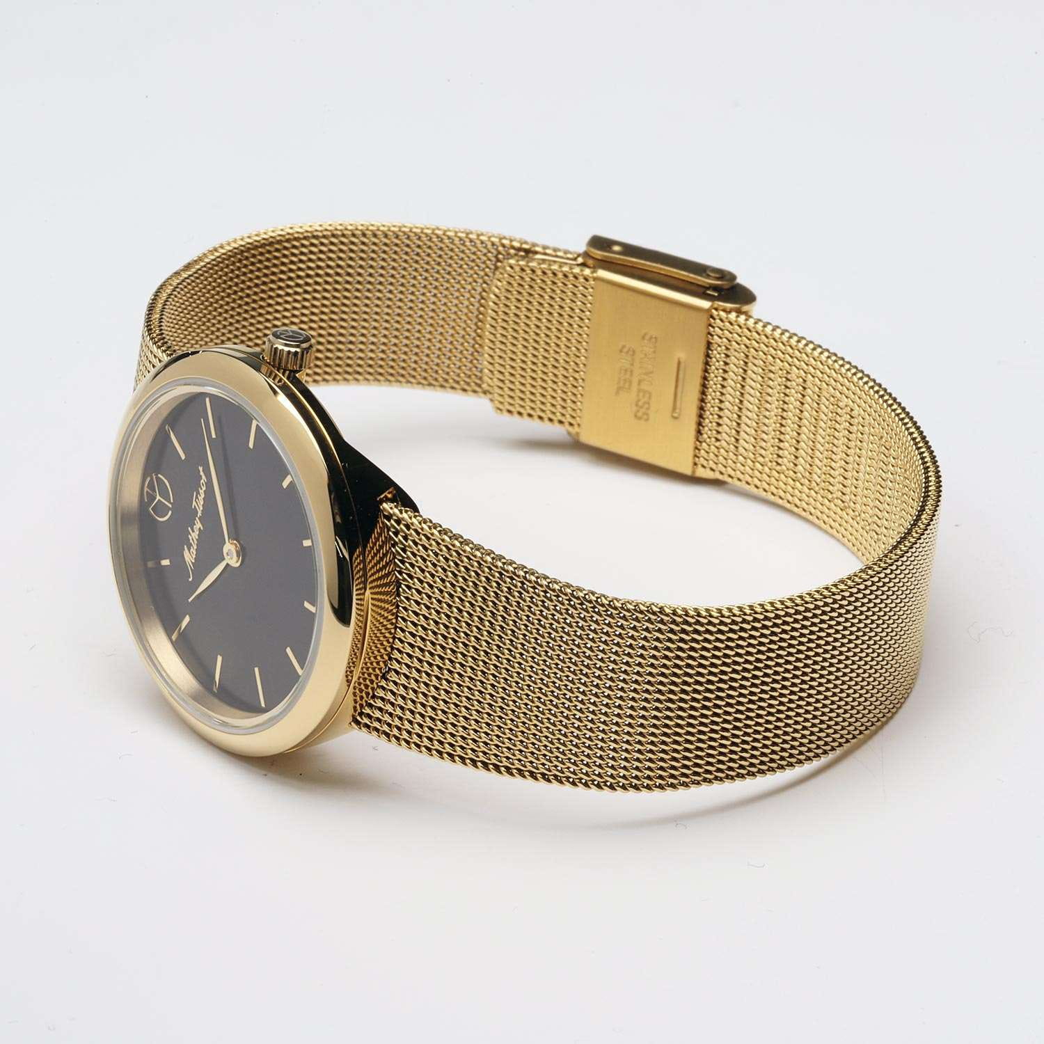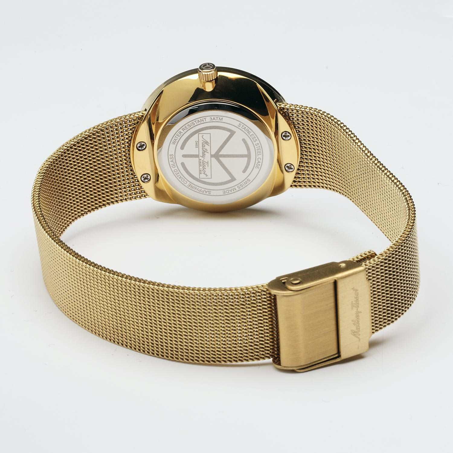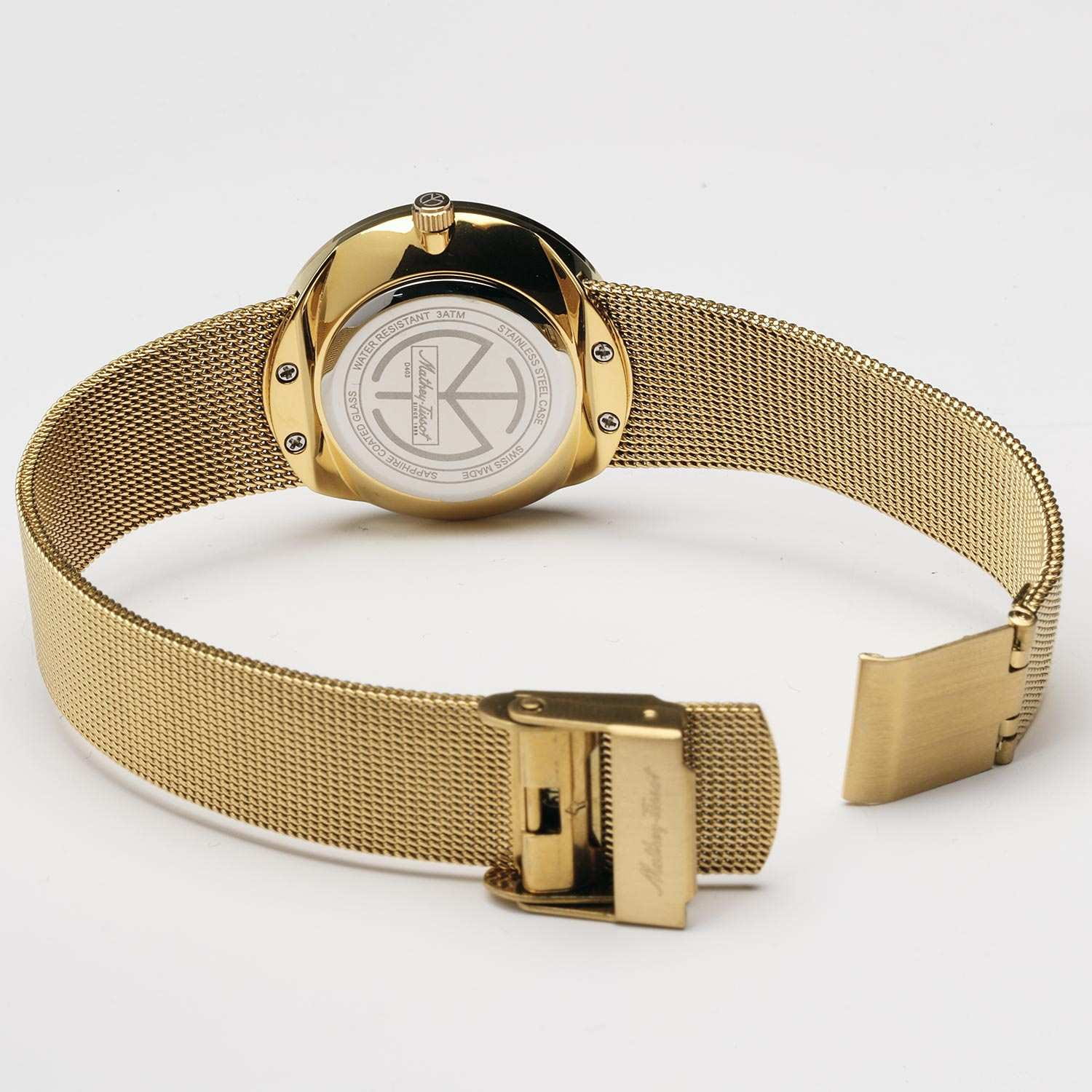Женские кварцевые часы Mathey-Tissot Milly D403PYN — это стильное сочетание элегантности и современного дизайна. Изящный корпус выполнен из нержавеющей стали с PVD-покрытиемPVDУльтратонкое покрытие наносится в технике вакуумного напыления, сочетает в себе нитрид титана особой прочности со слоем золота или оксида хрома. Несёт в себе декоративную или защитную функцию. золотистого цвета, диаметром 30 мм, что придаст образу элегантности и надежности. Изысканный перламутровый циферблат с метками в виде штрихов придает модели особый блеск. Циферблат защищен минеральным стекломМинеральное стеклоМинеральное стекло представляет собой искусственно выращенный минерал кварца. Такое стекло отличается особой устойчивостью к повреждениям и царапинам. Уступает по некоторым качествам сапфировому стеклу. с сапфировым покрытием, обеспечивает устойчивость к царапинам. Часы оснащены надежным кварцевым механизмом. Стальной браслет с PVD-покрытиемPVDУльтратонкое покрытие наносится в технике вакуумного напыления, сочетает в себе нитрид титана особой прочности со слоем золота или оксида хрома. Несёт в себе декоративную или защитную функцию. миланского плетения на раскладном замкеРаскладная застёжкаТакой тип застёжки используется только на браслетах из металла. Она никогда не раскрывается полностью, происходит разделение на 2 и более частей. Раскладывающая застёжка снизит вероятность потери часов к минимуму., гарантирует комфортное и безопасное ношение. Класс водозащиты: 30 метров позволит защитить корпус от случайных брызг или капель дождя. Mathey-Tissot  — отличный выбор для тех, кто ценит утонченность и качество.