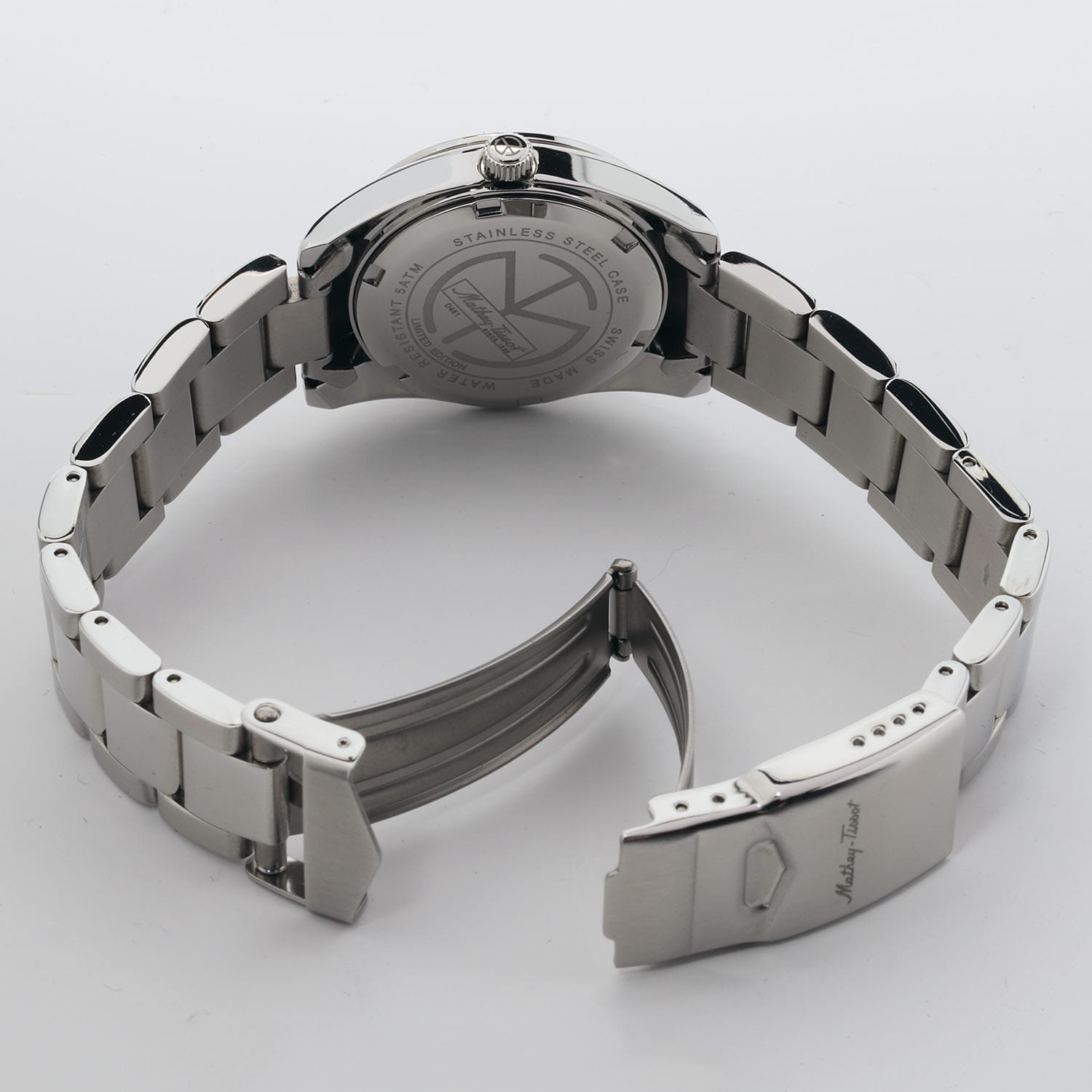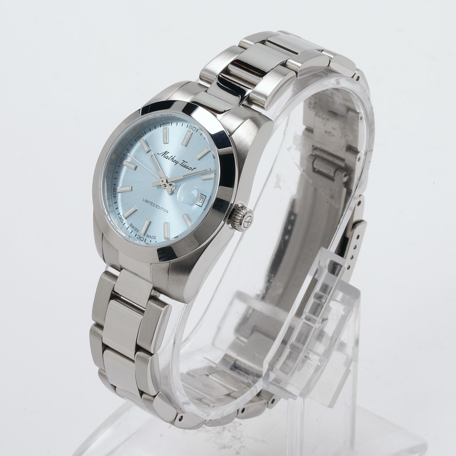 Женские кварцевые часы Mathey-Tissot Mathy D451BU — это стильное сочетание элегантности и современного дизайна. Лимитированная серия. Изящный корпус выполнен из нержавеющей стали, диаметром 32 мм, что придаст образу женственности и романтизма. Изысканный циферблат с метками в виде штрихов придает модели особый блеск. Циферблат защищен минеральным стекломМинеральное стеклоМинеральное стекло представляет собой искусственно выращенный минерал кварца. Такое стекло отличается особой устойчивостью к повреждениям и царапинам. Уступает по некоторым качествам сапфировому стеклу., обеспечивающий устойчивость к царапинам. Стрелки и метки с люминесцентным покрытиемЛюминесцентное покрытиеПозволяет считывать показания времени в темноте. Производители наносят на стрелки, часовые индексы, безель или поверхность циферблата светонакопительный состав, дающий холодное свечение.. Окошко даты находится в положении 3 часа. Часы оснащены надежным кварцевым механизмом. Стальной браслет на раскладной застёжке с фиксаторомРаскладная застёжкаТакой тип застёжки используется только на браслетах из металла. Она никогда не раскрывается полностью, происходит разделение на 2 и более частей. Раскладывающая застёжка снизит вероятность потери часов к минимуму., гарантирует комфортное и безопасное ношение. Класс водозащиты: 50 метров позволит защитить корпус от случайных брызг или капель дождя. Mathey-Tissot — отличный выбор для тех, кто ценит утонченность и качество.