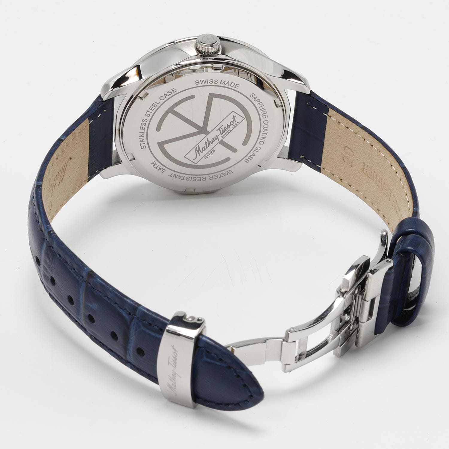 Мужские кварцевые часы Mathey-Tissot Edmond Quartz H1886QABU — это стильное сочетание элегантности и современного дизайна. Изящный корпус выполнен из нержавеющей стали, диаметром 42 мм, что придаст образу элегантности и надежности. Изысканный циферблат с метками в виде штрихов и римских цифр придает модели особый блеск. Циферблат защищен минеральным стекломМинеральное стеклоМинеральное стекло представляет собой искусственно выращенный минерал кварца. Такое стекло отличается особой устойчивостью к повреждениям и царапинам. Уступает по некоторым качествам сапфировому стеклу. с сапфировым покрытием, обеспечивает устойчивость к царапинам. Окошко даты находится в положении 12 часов. Кожаный ремешок с тиснением под кожу аллигатора на застёжке-бабочке с кнопкамиЗастёжка "бабочка"Такой вид застёжки дополняется предохранителями, помогающими избежать случайного раскрытия браслета. Обладают изящным исполнением. , гарантирует комфортное и безопасное ношение. Секундная стрелка вынесена на отдельный циферблат. Рифленая заводная головка. Класс водозащиты: 50 метров позволит защитить корпус от случайных брызг или капель дождя. Mathey-Tissot  — отличный выбор для тех, кто ценит утонченность и качество.