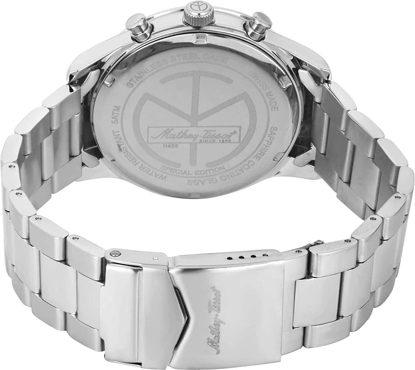Мужские кварцевые часы Mathey-Tissot Mathy H455VE — это стильное сочетание элегантности и современного дизайна. Изящный корпус выполнен из нержавеющей стали, диаметром 44 мм, что придаст образу элегантности и надежности. Изысканный циферблат с метками в виде штрихов придает модели особый блеск. Циферблат защищен минеральным стекломМинеральное стеклоМинеральное стекло представляет собой искусственно выращенный минерал кварца. Такое стекло отличается особой устойчивостью к повреждениям и царапинам. Уступает по некоторым качествам сапфировому стеклу., обеспечивает устойчивость к царапинам. Стрелки и метки с люминесцентным покрытиемЛюминесцентное покрытиеПозволяет считывать показания времени в темноте. Производители наносят на стрелки, часовые индексы, безель или поверхность циферблата светонакопительный состав, дающий холодное свечение.. Окошко даты находится в положении 3 часа. Часы оснащены надежным кварцевым механизмом. Стальной браслет на раскладной застёжке с фиксаторомРаскладная застёжкаТакой тип застёжки используется только на браслетах из металла. Она никогда не раскрывается полностью, происходит разделение на 2 и более частей. Раскладывающая застёжка снизит вероятность потери часов к минимуму., гарантирует комфортное и безопасное ношение. Рифленая заводная головка. Класс водозащиты: 50 метров, позволит защитить корпус от случайных брызг или капель дождя. Mathey-Tissot — отличный выбор для тех, кто ценит утонченность и качество.