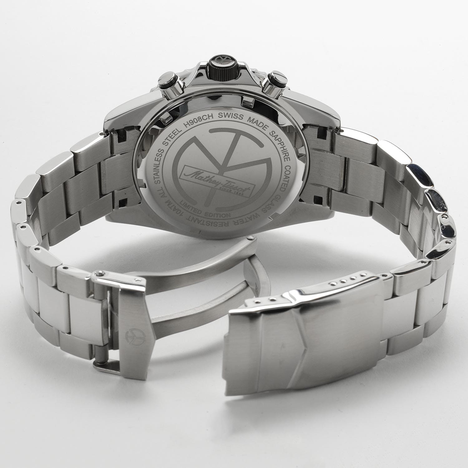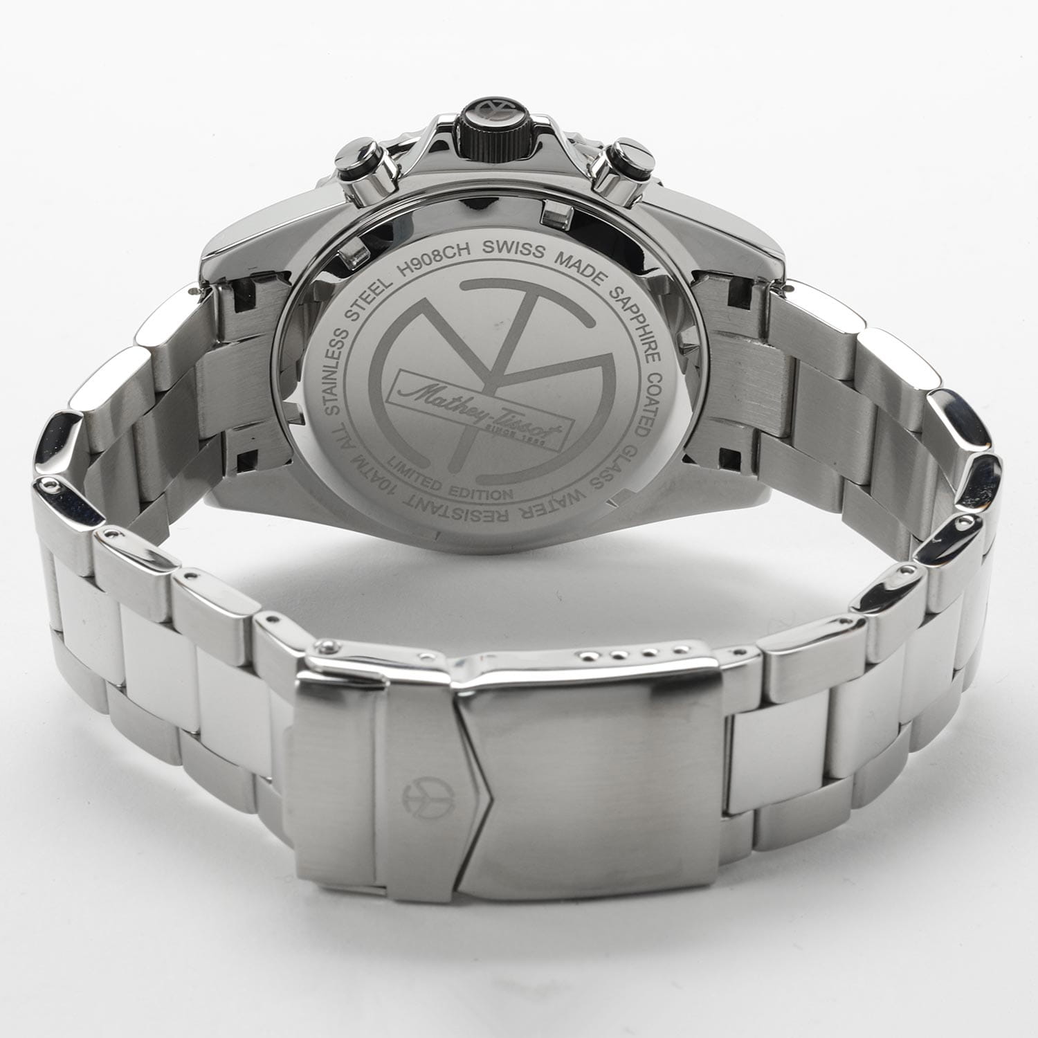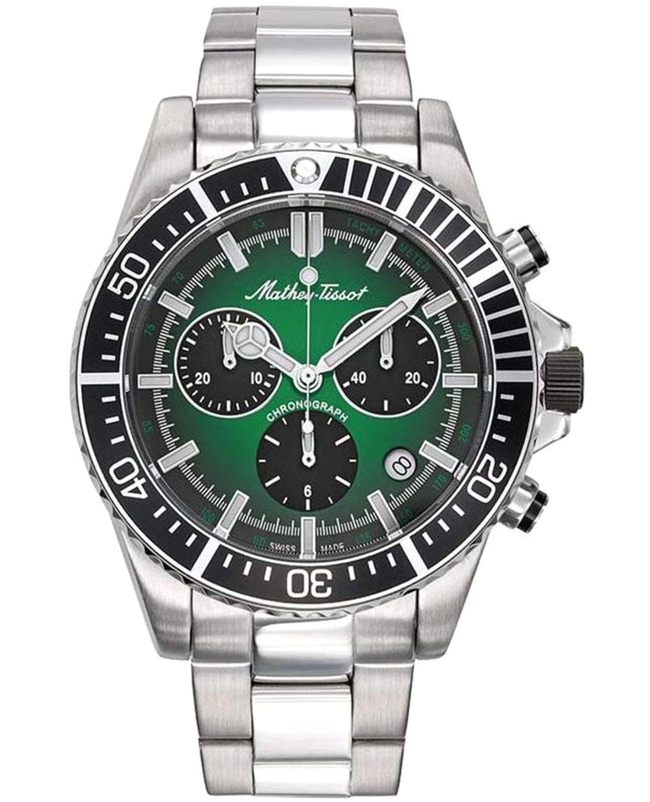 Мужские кварцевые часы-хронографХронографФункция позволяет измерять отрезки времени с особой точностью: часы, минуты, секунды. Верным признаком хронографа является наличие на циферблате 3 дополнительных окошек-счётчиков. с секундомеромСекундомерСекундоме́р — прибор, способный измерять интервалы времени с точностью до долей секунды. Mathey-Tissot Mathy H908CHAV — это стильное сочетание элегантности и современного дизайна. Изящный корпус выполнен из нержавеющей стали, диаметром 42 мм, что придаст образу элегантности и надежности. Изысканный циферблат с метками в виде штрихов придает модели особый блеск. Циферблат защищен минеральным стекломМинеральное стеклоМинеральное стекло представляет собой искусственно выращенный минерал кварца. Такое стекло отличается особой устойчивостью к повреждениям и царапинам. Уступает по некоторым качествам сапфировому стеклу. с сапфировым покрытием, обеспечивает устойчивость к царапинам. Стрелки и метки с люминесцентным покрытиемЛюминесцентное покрытиеПозволяет считывать показания времени в темноте. Производители наносят на стрелки, часовые индексы, безель или поверхность циферблата светонакопительный состав, дающий холодное свечение.. БезельБезельВнешний ободок, закрепляющий стекло. В спортивных часах так называется поворотное кольцо с делениями на циферблате, выполняет роль таймера – замеряет отрезки времени на шкале. Неподвижный безель – элемент декора. Однонаправленно вращающийся безель на дайверских часах позволяет фиксировать моменты погружения и выныривания на поверхность. с PVD-покрытиемPVDУльтратонкое покрытие наносится в технике вакуумного напыления, сочетает в себе нитрид титана особой прочности со слоем золота или оксида хрома. Несёт в себе декоративную или защитную функцию.. Окошко даты находится в положении между 4 и 5 часов. Стальной браслет на раскладной застёжке с фиксаторомРаскладная застёжкаТакой тип застёжки используется только на браслетах из металла. Она никогда не раскрывается полностью, происходит разделение на 2 и более частей. Раскладывающая застёжка снизит вероятность потери часов к минимуму., гарантирует комфортное и безопасное ношение. Рифленая заводная головка. Класс водозащиты: 100 метров позволит плавать, нырять и заниматься другими водными видами спорта. Mathey-Tissot  — отличный выбор для тех, кто ценит утонченность и качество.