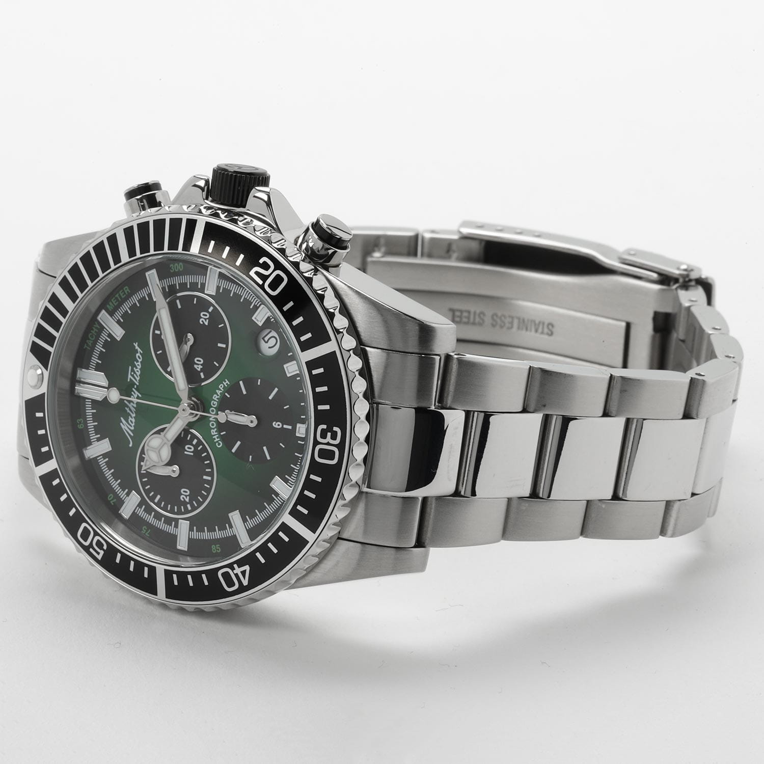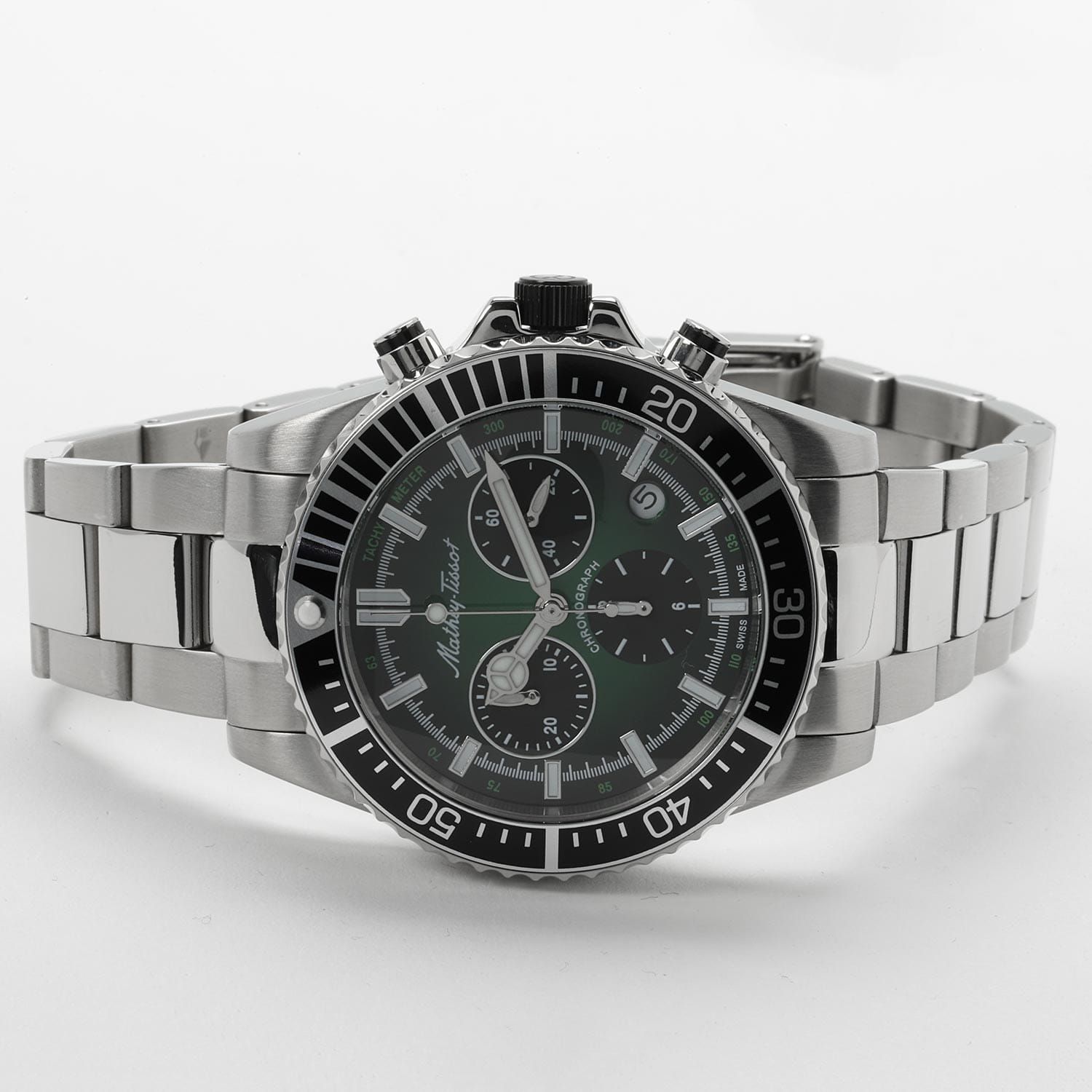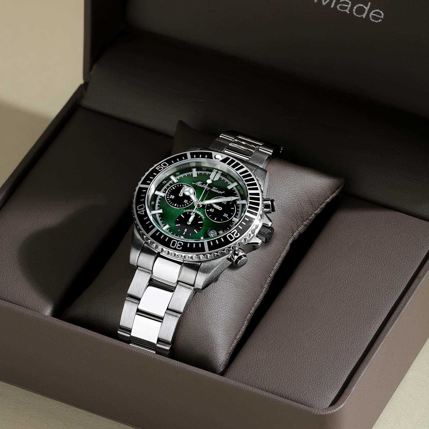Мужские кварцевые часы-хронографХронографФункция позволяет измерять отрезки времени с особой точностью: часы, минуты, секунды. Верным признаком хронографа является наличие на циферблате 3 дополнительных окошек-счётчиков. с секундомеромСекундомерСекундоме́р — прибор, способный измерять интервалы времени с точностью до долей секунды. Mathey-Tissot Mathy H908CHAV — это стильное сочетание элегантности и современного дизайна. Изящный корпус выполнен из нержавеющей стали, диаметром 42 мм, что придаст образу элегантности и надежности. Изысканный циферблат с метками в виде штрихов придает модели особый блеск. Циферблат защищен минеральным стекломМинеральное стеклоМинеральное стекло представляет собой искусственно выращенный минерал кварца. Такое стекло отличается особой устойчивостью к повреждениям и царапинам. Уступает по некоторым качествам сапфировому стеклу. с сапфировым покрытием, обеспечивает устойчивость к царапинам. Стрелки и метки с люминесцентным покрытиемЛюминесцентное покрытиеПозволяет считывать показания времени в темноте. Производители наносят на стрелки, часовые индексы, безель или поверхность циферблата светонакопительный состав, дающий холодное свечение.. БезельБезельВнешний ободок, закрепляющий стекло. В спортивных часах так называется поворотное кольцо с делениями на циферблате, выполняет роль таймера – замеряет отрезки времени на шкале. Неподвижный безель – элемент декора. Однонаправленно вращающийся безель на дайверских часах позволяет фиксировать моменты погружения и выныривания на поверхность. с PVD-покрытиемPVDУльтратонкое покрытие наносится в технике вакуумного напыления, сочетает в себе нитрид титана особой прочности со слоем золота или оксида хрома. Несёт в себе декоративную или защитную функцию.. Окошко даты находится в положении между 4 и 5 часов. Стальной браслет на раскладной застёжке с фиксаторомРаскладная застёжкаТакой тип застёжки используется только на браслетах из металла. Она никогда не раскрывается полностью, происходит разделение на 2 и более частей. Раскладывающая застёжка снизит вероятность потери часов к минимуму., гарантирует комфортное и безопасное ношение. Рифленая заводная головка. Класс водозащиты: 100 метров позволит плавать, нырять и заниматься другими водными видами спорта. Mathey-Tissot  — отличный выбор для тех, кто ценит утонченность и качество.