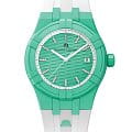 Часы AIKON #tide обладают всеми преимуществами AIKON, но кроме того, они выполнены из особого материала под названием #tideocean – переработанного океанского пластика, усиленного стекловолокном. В результате сложного технологического процесса переработки получен композитный материал, вдвое превосходящий по прочности обычный пластик. Износостойкость композита #tideocean в пять раз выше полиэтилентерефталата (ПЭТ). И еще немаловажный экологический фактор – в процессе превращения океанского пластика в материал #tideocean углеродные выбросы в атмосферу значительно снижаются, чем при обычном процессе выпуска первичного пластика. В новой модели безельБезельВнешний ободок, закрепляющий стекло. В спортивных часах так называется поворотное кольцо с делениями на циферблате, выполняет роль таймера – замеряет отрезки времени на шкале. Неподвижный безель – элемент декора. Однонаправленно вращающийся безель на дайверских часах позволяет фиксировать моменты погружения и выныривания на поверхность., корпус, задняя крышка, заводная головка, наконечник и застежка выполнены из композитного материала #tideocean. 17 пластиковых бутылок требуется для производства одних отличных часов и их специальной упаковки, также на 100% состоящей из материала #tide, появившегося в результате отходов пластика в океане. В результате такой переработки выигрывают все. Унисекс швейцарские кварцевые часы Maurice Lacroix Aikon Quartz AI2008-CCCC1-3A0-0. Сапфировое стеклоСапфировое стеклоПрочный и надёжный материал из кристалла сапфира синтетического происхождения, характеризующийся особой твёрдостью и устойчивостью к царапинам и повреждениям. устойчивое к появлению царапин, обладающее высокой прозрачностью. Бирюзовый циферблат. Стрелки и метки с люминесцентным покрытиемЛюминесцентное покрытиеПозволяет считывать показания времени в темноте. Производители наносят на стрелки, часовые индексы, безель или поверхность циферблата светонакопительный состав, дающий холодное свечение.. Класс водозащиты: 100 метров, позволит плавать, нырять и заниматься другими водными видами спорта. Окошко даты находится в положении 3 часов. Циферблат с тематическим гильошированием "Vagues du Jura". Корпус выполнен из переработанного пластика, ранее загрязнявшего Мировой океан. Каучуковый ремешок с классической застежкой.