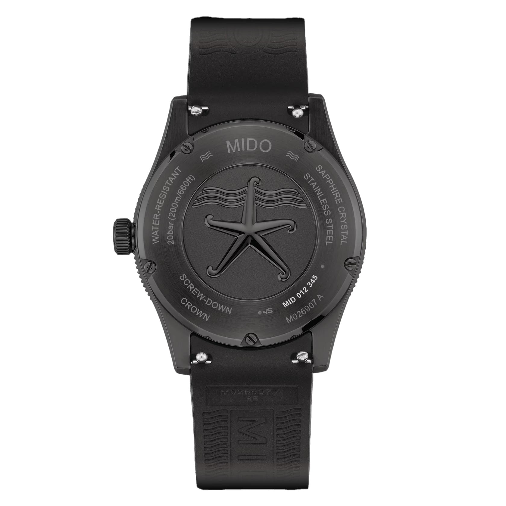 Мужские швейцарские механические часы с сапфировым стеклом Mido Ocean Star 39 M026.907.37.051.00, механический механизм (автоматический калибр) с высокой точностью. Сапфировое стеклоСапфировое стеклоПрочный и надёжный материал из кристалла сапфира синтетического происхождения, характеризующийся особой твёрдостью и устойчивостью к царапинам и повреждениям. устойчивое к появлению царапин, обладающее высокой прозрачностью. Корпус часов изготовлен из стали. Вращающийся безельБезельВнешний ободок, закрепляющий стекло. В спортивных часах так называется поворотное кольцо с делениями на циферблате, выполняет роль таймера – замеряет отрезки времени на шкале. Неподвижный безель – элемент декора. Однонаправленно вращающийся безель на дайверских часах позволяет фиксировать моменты погружения и выныривания на поверхность. из нержавеющей стали с PVDPVDУльтратонкое покрытие наносится в технике вакуумного напыления, сочетает в себе нитрид титана особой прочности со слоем золота или оксида хрома. Несёт в себе декоративную или защитную функцию. покрытием и керамики с покрытием Superluminova. Циферблат украшают метки с бриллиантами. Стрелки с люминесцентным покрытиемЛюминесцентное покрытиеПозволяет считывать показания времени в темноте. Производители наносят на стрелки, часовые индексы, безель или поверхность циферблата светонакопительный состав, дающий холодное свечение.. Окошко даты в положении 3 часов. Класс водозащиты: 200 метров, позволит плавать, нырять и заниматься другими водными видами спорта.