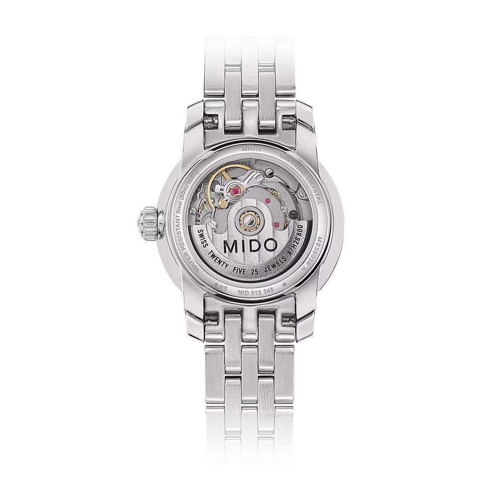 Mido Baroncelli Lady Twenty Five M039.007.11.106.00  — утончённые женские часы, созданные для тех, кто ценит изящество и швейцарскую точность. Корпус диаметром 25 мм выполнен из полированной нержавеющей стали и гармонично сочетается с пятизвенным браслетом, дополненным раскладной застёжкойРаскладная застёжкаТакой тип застёжки используется только на браслетах из металла. Она никогда не раскрывается полностью, происходит разделение на 2 и более частей. Раскладывающая застёжка снизит вероятность потери часов к минимуму.. Циферблат из натурального перламутра украшен двенадцатью бриллиантами-часовыми метками, создающими игру света и подчеркивающими утончённый характер модели. Защиту обеспечивает сапфировое стеклоСапфировое стеклоПрочный и надёжный материал из кристалла сапфира синтетического происхождения, характеризующийся особой твёрдостью и устойчивостью к царапинам и повреждениям. с надёжным антибликовым покрытиемАнтибликовое покрытиеСлой оксида металла в 0,13-0,3 микрон, благодаря которому стекло часов не бликует и не отражает свет. Антибликовое покрытие уменьшает отражение света в 10 раз, обеспечивая отличную читаемость показателей циферблата., что гарантирует отличную читаемость в любых условиях. Прозрачная задняя крышка открывает вид на тщательно декорированный ротор, что придаёт часам дополнительное очарование. Водозащита до 50 метров делает модель практичной для повседневного ношения, сохраняя при этом её ювелирную элегантность.