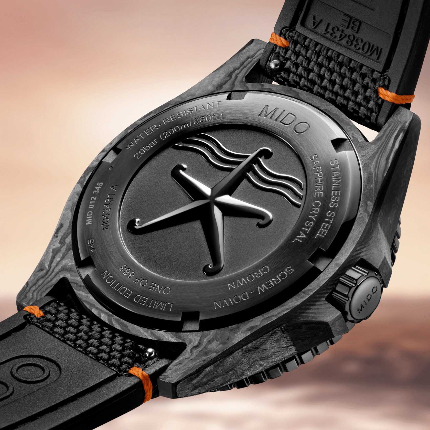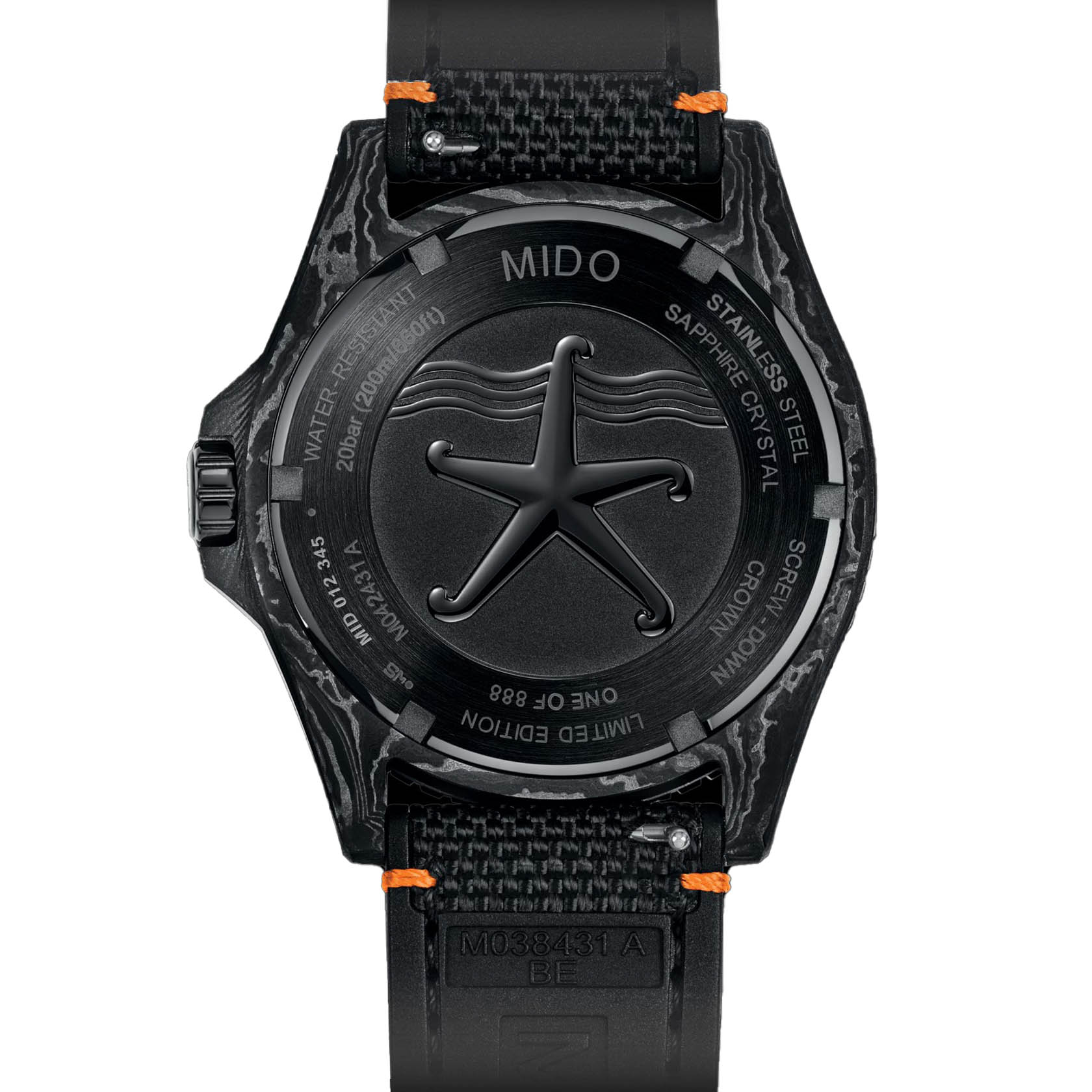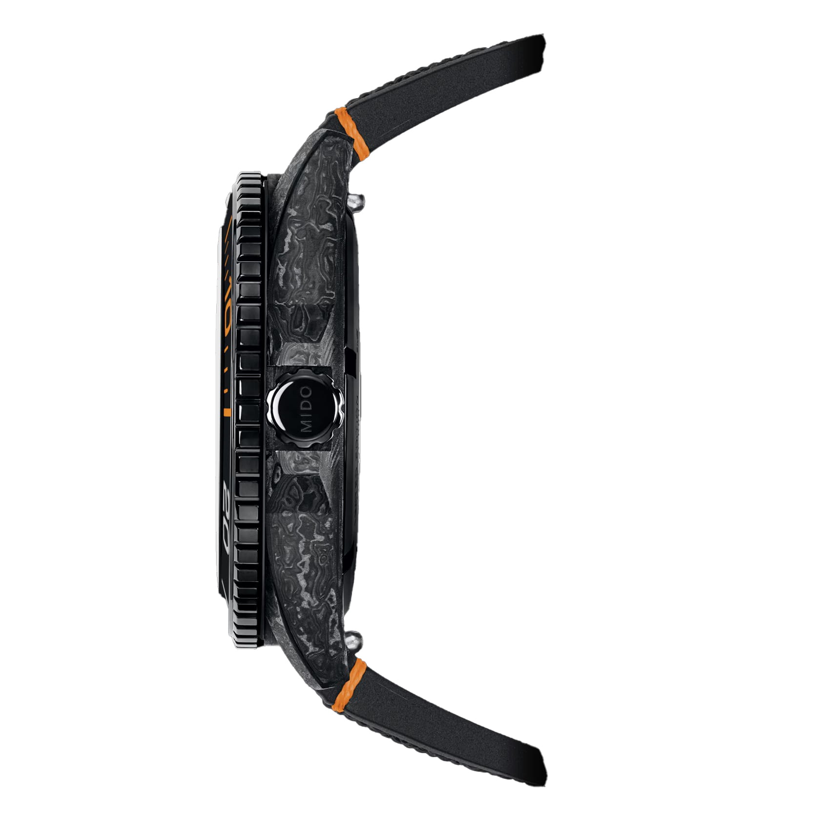 Мужские швейцарские механические часы с сапфировым стеклом Mido Ocean Star 200C Carbon Limited Edition M042.431.77.081.00, механический механизм (автоматический калибр) с высокой точностью. Сапфировое стеклоСапфировое стеклоПрочный и надёжный материал из кристалла сапфира синтетического происхождения, характеризующийся особой твёрдостью и устойчивостью к царапинам и повреждениям. устойчивое к появлению царапин, обладающее высокой прозрачностью. Класс водозащиты: 200 метров, позволит плавать, нырять и заниматься другими водными видами спорта. Корпус часов изготовлен из карбона. Mido использует керамику - один из самых выдающихся материалов в часовом производстве - для вращающегося в одном направлении безеляБезельВнешний ободок, закрепляющий стекло. В спортивных часах так называется поворотное кольцо с делениями на циферблате, выполняет роль таймера – замеряет отрезки времени на шкале. Неподвижный безель – элемент декора. Однонаправленно вращающийся безель на дайверских часах позволяет фиксировать моменты погружения и выныривания на поверхность. модели Ocean Star 200C. Циферблат украшен волнистой текстурой и имеет накладные индексы покрытые белым люминесцентным покрытиемЛюминесцентное покрытиеПозволяет считывать показания времени в темноте. Производители наносят на стрелки, часовые индексы, безель или поверхность циферблата светонакопительный состав, дающий холодное свечение. Super-Luminova®. Ограниченная серия из 888 часов.