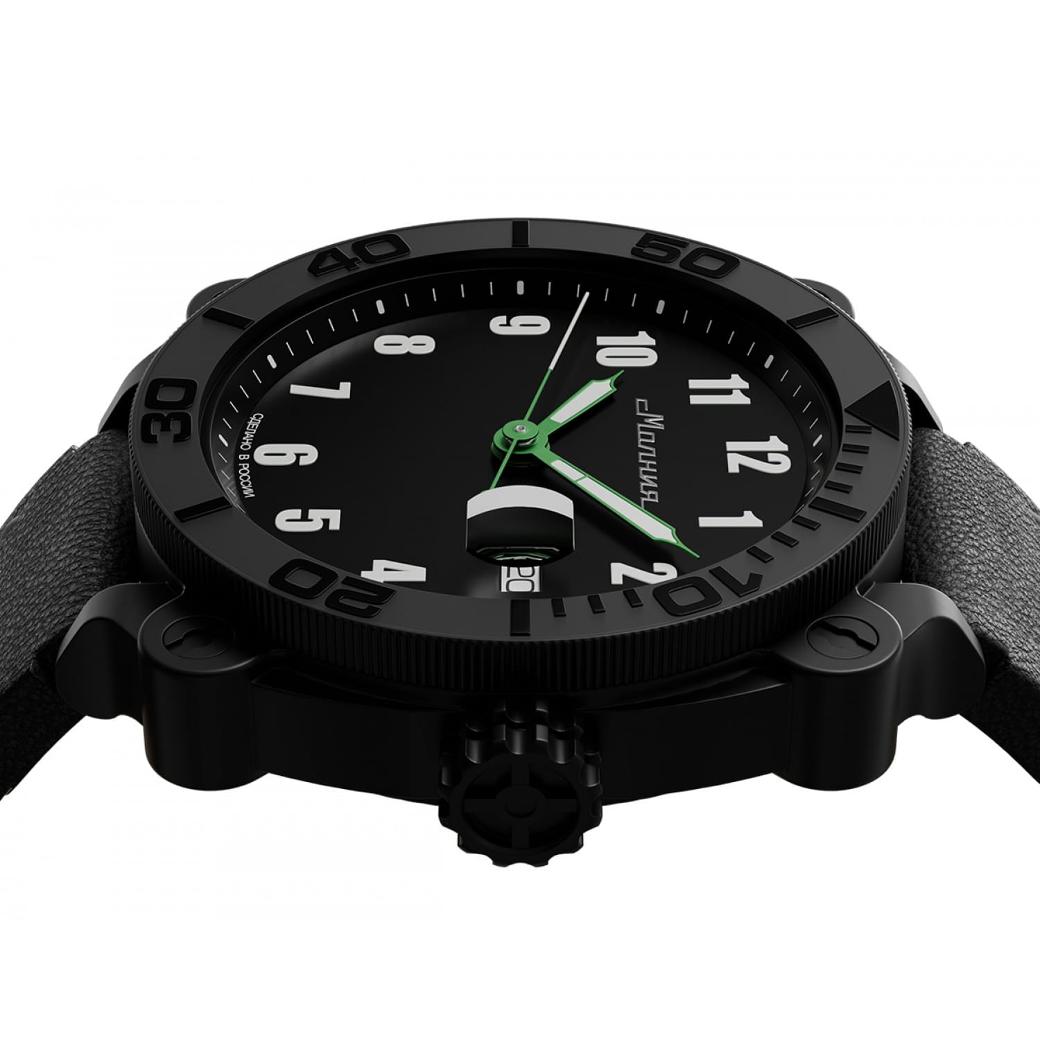 Мужские механические часы с автоподзаводом от бренда «МОЛНИЯ» — это стильный аксессуар, вдохновлённый дизайном приборной панели легендарного танка Т-72. Корпус диаметром 42 мм и толщиной 12 мм выполнен из нержавеющей стали 316L с IP-покрытиемIP-покрытиеМетод ионного напыления. Демонстрирует повышенную устойчивость к истиранию, окислению и химическим веществам. Под воздействием высокого давления и температуры около 1500°C молекулы металла надёжно соединяются с частицами корпуса часов.. БезельБезельВнешний ободок, закрепляющий стекло. В спортивных часах так называется поворотное кольцо с делениями на циферблате, выполняет роль таймера – замеряет отрезки времени на шкале. Неподвижный безель – элемент декора. Однонаправленно вращающийся безель на дайверских часах позволяет фиксировать моменты погружения и выныривания на поверхность. однонаправленный, вращающийся. Циферблат чёрного цвета оформлен арабскими цифрами и логотипом бренда. Окошко даты расположено в положении 3 часов и оснащено увеличительным стеклом. Стрелки и метки с люминесцентным покрытиемЛюминесцентное покрытиеПозволяет считывать показания времени в темноте. Производители наносят на стрелки, часовые индексы, безель или поверхность циферблата светонакопительный состав, дающий холодное свечение. Super-LumiNova. Циферблат защищён сапфировым стекломСапфировое стеклоПрочный и надёжный материал из кристалла сапфира синтетического происхождения, характеризующийся особой твёрдостью и устойчивостью к царапинам и повреждениям. с антибликовым покрытиемАнтибликовое покрытиеСлой оксида металла в 0,13-0,3 микрон, благодаря которому стекло часов не бликует и не отражает свет. Антибликовое покрытие уменьшает отражение света в 10 раз, обеспечивая отличную читаемость показателей циферблата.. Механизм — Русский автоматический калибр Восток 2416 запас хода до 42 часов. Заводная головка стилизована под гусеничную ленту, задняя крышка с гравировкой танка. Часы оснащены кожаным ремешком чёрного цвета с классической пряжкой и системой быстрой замены. Водонепроницаемость 100 м позволяет использовать часы для плавания и повседневного ношения. Идеальный выбор для тех, кто ценит инженерное наследие и мощный дизайн.