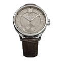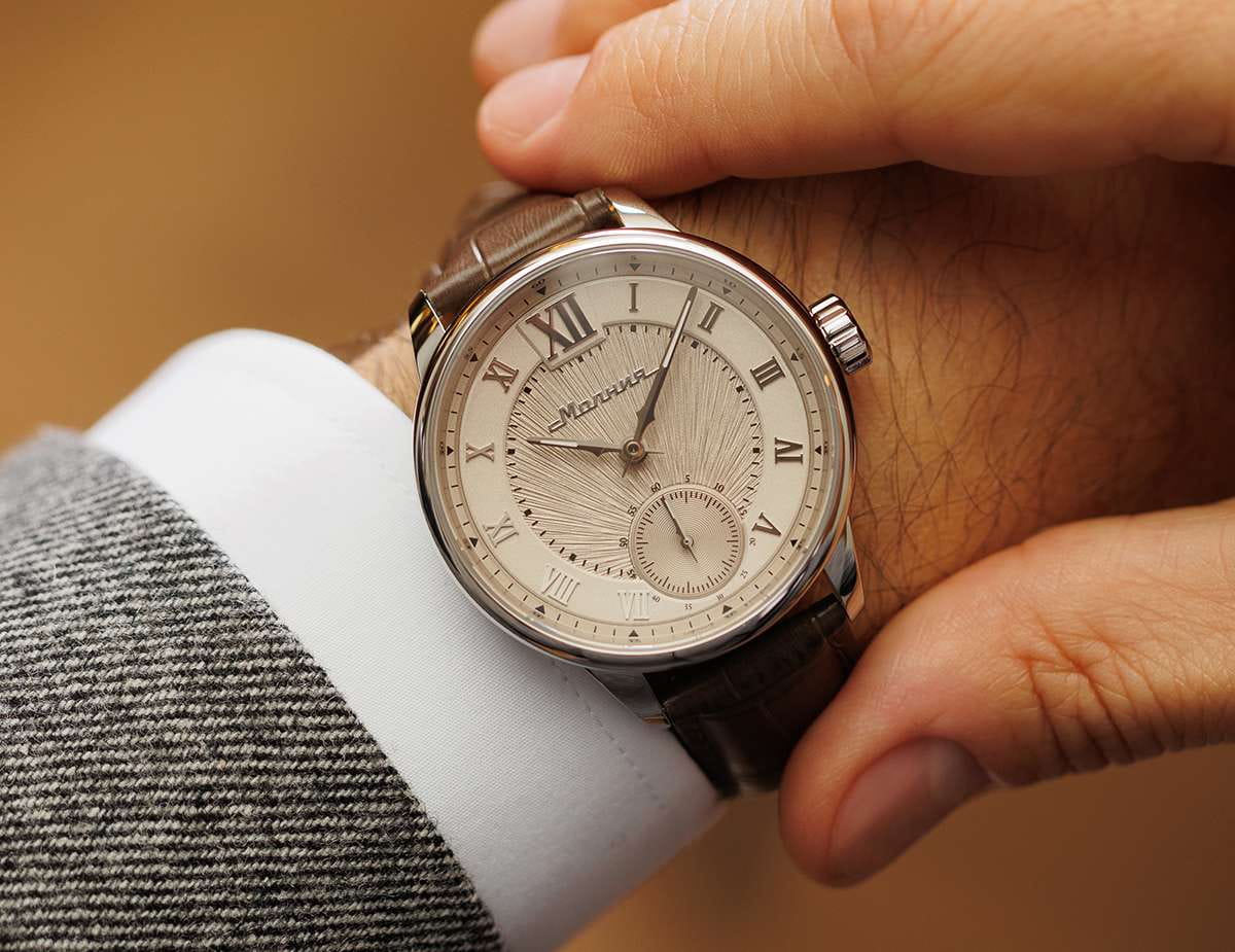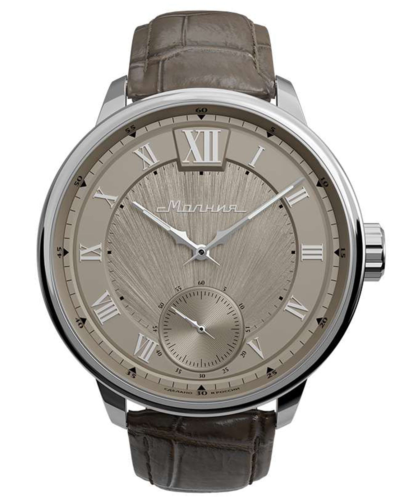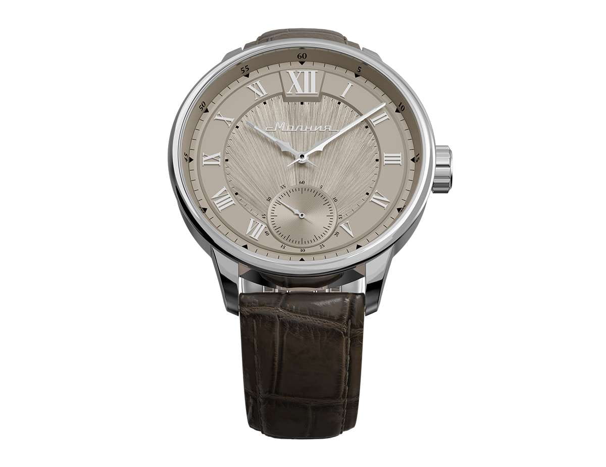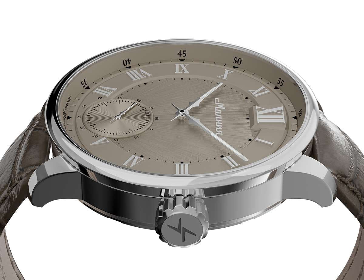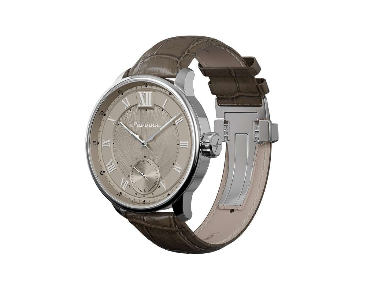 Мужские механические часы с ручным подзаводом — это аксессуар от легендарного бренда «МОЛНИЯ», созданный на Челябинском часовом заводе. Корпус диаметром 41 мм и толщиной 12 мм выполнен из нержавеющей стали 316L с зеркальной полировкой. БезельБезельВнешний ободок, закрепляющий стекло. В спортивных часах так называется поворотное кольцо с делениями на циферблате, выполняет роль таймера – замеряет отрезки времени на шкале. Неподвижный безель – элемент декора. Однонаправленно вращающийся безель на дайверских часах позволяет фиксировать моменты погружения и выныривания на поверхность. также выполнен из стали с зеркальной отделкой. Циферблат бежевый цвета оформлен римскими цифрами и стальными индексами. Малая секундная стрелка вынесена на позицию 9 часов. Циферблат защищён сапфировым стекломСапфировое стеклоПрочный и надёжный материал из кристалла сапфира синтетического происхождения, характеризующийся особой твёрдостью и устойчивостью к царапинам и повреждениям. толщиной 2,5 мм. Механизм — мануфактурный калибр 3603, собранный вручную, с запасом хода до 40 часов. Прозрачная задняя крышка позволяет наблюдать за работой механизма. Часы оснащены коричневым кожаным ремешком шириной 20 мм с раскладной застёжкойРаскладная застёжкаТакой тип застёжки используется только на браслетах из металла. Она никогда не раскрывается полностью, происходит разделение на 2 и более частей. Раскладывающая застёжка снизит вероятность потери часов к минимуму. и системой быстрой замены. Водонепроницаемость 100 м позволяет использовать часы для плавания и повседневного ношения. Идеальный выбор для тех, кто ценит российское качество и традиции.