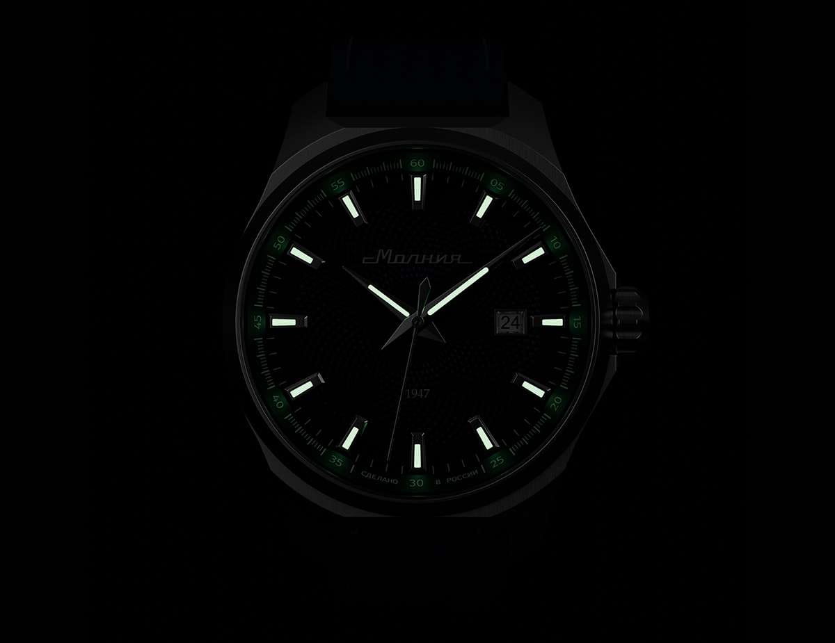 Мужские механические часы с автоподзаводом — это надёжный аксессуар от легендарного бренда «МОЛНИЯ», созданный на Челябинском часовом заводе. Корпус диаметром 42 мм выполнен из нержавеющей стали 316L с зеркальной полировкой. БезельБезельВнешний ободок, закрепляющий стекло. В спортивных часах так называется поворотное кольцо с делениями на циферблате, выполняет роль таймера – замеряет отрезки времени на шкале. Неподвижный безель – элемент декора. Однонаправленно вращающийся безель на дайверских часах позволяет фиксировать моменты погружения и выныривания на поверхность. также выполнен из стали с зеркальной отделкой. Циферблат синего цвета оформлен индексами и стрелками. Окошко даты расположено в положении 3 часов. Стрелки и метки с люминесцентным покрытиемЛюминесцентное покрытиеПозволяет считывать показания времени в темноте. Производители наносят на стрелки, часовые индексы, безель или поверхность циферблата светонакопительный состав, дающий холодное свечение. Super-LumiNova, обеспечивающим хорошую читаемость в темноте. Циферблат защищён сапфировым стекломСапфировое стеклоПрочный и надёжный материал из кристалла сапфира синтетического происхождения, характеризующийся особой твёрдостью и устойчивостью к царапинам и повреждениям. с антибликовым покрытиемАнтибликовое покрытиеСлой оксида металла в 0,13-0,3 микрон, благодаря которому стекло часов не бликует и не отражает свет. Антибликовое покрытие уменьшает отражение света в 10 раз, обеспечивая отличную читаемость показателей циферблата.. Механизм — японский автоматический калибр Miyota 8215 с функцией и запасом хода до 42 часов. Прозрачная задняя крышка позволяет наблюдать за работой механизма с кастомным ротором. Часы оснащены кожаным ремешком синего цвета с подкладкой из фтористого каучука и классической пряжкой, а также системой быстрой замены. Водонепроницаемость 100 м позволяет использовать часы для плавания и повседневного ношения. Идеальный выбор для тех, кто ценит качество, точность и стиль.