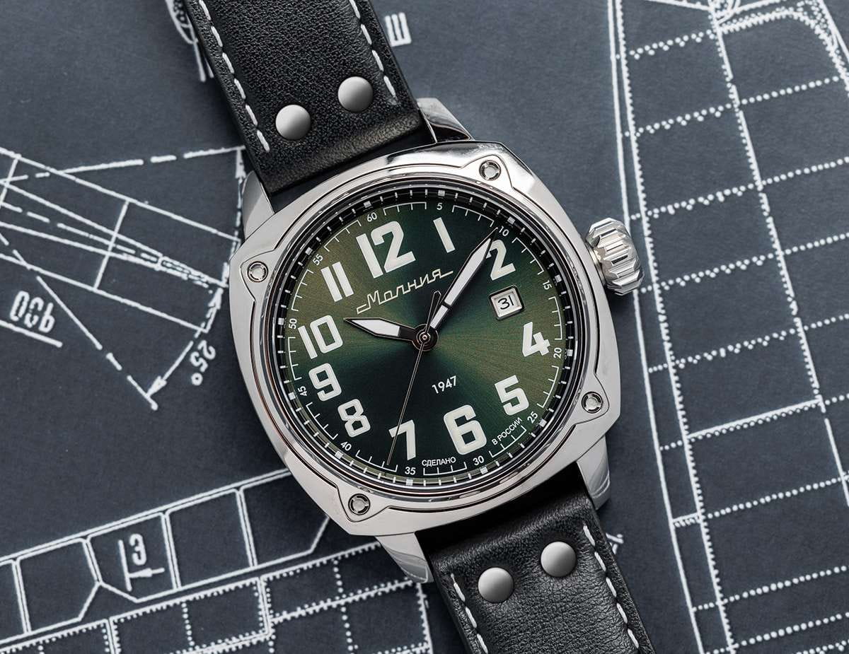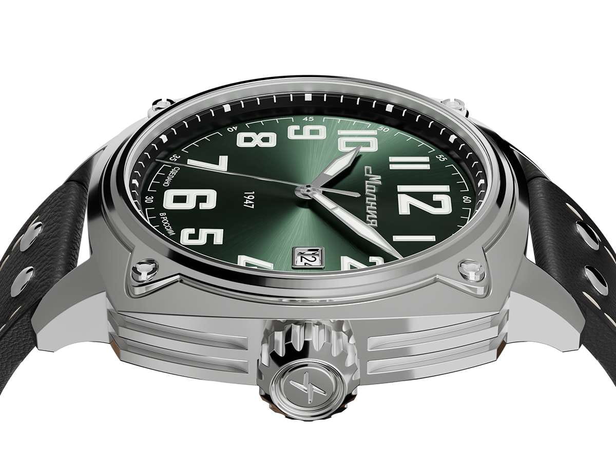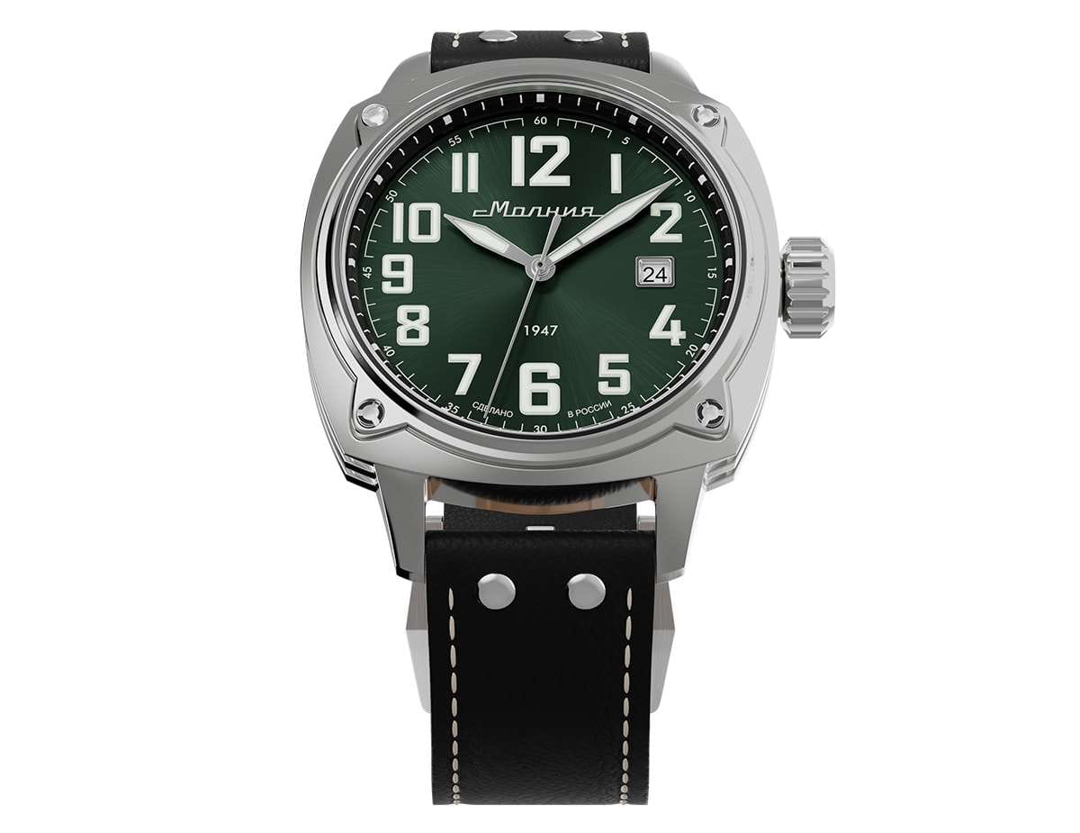 Мужские механические часы с автоподзаводом — это надёжный аксессуар от легендарного бренда «МОЛНИЯ», созданный на Челябинском часовом заводе. Корпус диаметром 42 мм выполнен из нержавеющей стали 316L с зеркальной полировкой. БезельБезельВнешний ободок, закрепляющий стекло. В спортивных часах так называется поворотное кольцо с делениями на циферблате, выполняет роль таймера – замеряет отрезки времени на шкале. Неподвижный безель – элемент декора. Однонаправленно вращающийся безель на дайверских часах позволяет фиксировать моменты погружения и выныривания на поверхность. также выполнен из стали с зеркальной отделкой. Циферблат зелёного цвета оформлен индексами и стрелками. Окошко даты расположено в положении 3 часов. Стрелки и метки с люминесцентным покрытиемЛюминесцентное покрытиеПозволяет считывать показания времени в темноте. Производители наносят на стрелки, часовые индексы, безель или поверхность циферблата светонакопительный состав, дающий холодное свечение. Super-LumiNova, обеспечивающим хорошую читаемость в темноте. Циферблат защищён сапфировым стекломСапфировое стеклоПрочный и надёжный материал из кристалла сапфира синтетического происхождения, характеризующийся особой твёрдостью и устойчивостью к царапинам и повреждениям. с антибликовым покрытиемАнтибликовое покрытиеСлой оксида металла в 0,13-0,3 микрон, благодаря которому стекло часов не бликует и не отражает свет. Антибликовое покрытие уменьшает отражение света в 10 раз, обеспечивая отличную читаемость показателей циферблата.. Механизм — японский автоматический калибр Miyota 8215 с функцией и запасом хода до 42 часов. Прозрачная задняя крышка позволяет наблюдать за работой механизма. Часы оснащены кожаным ремешком чёрного цвета с белой отстрочкой и классической пряжкой. Водонепроницаемость 100 м позволяет использовать часы для плавания и повседневного ношения. Идеальный выбор для тех, кто ценит качество, точность и стиль.