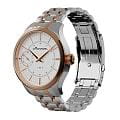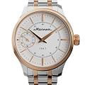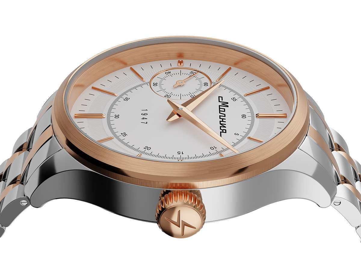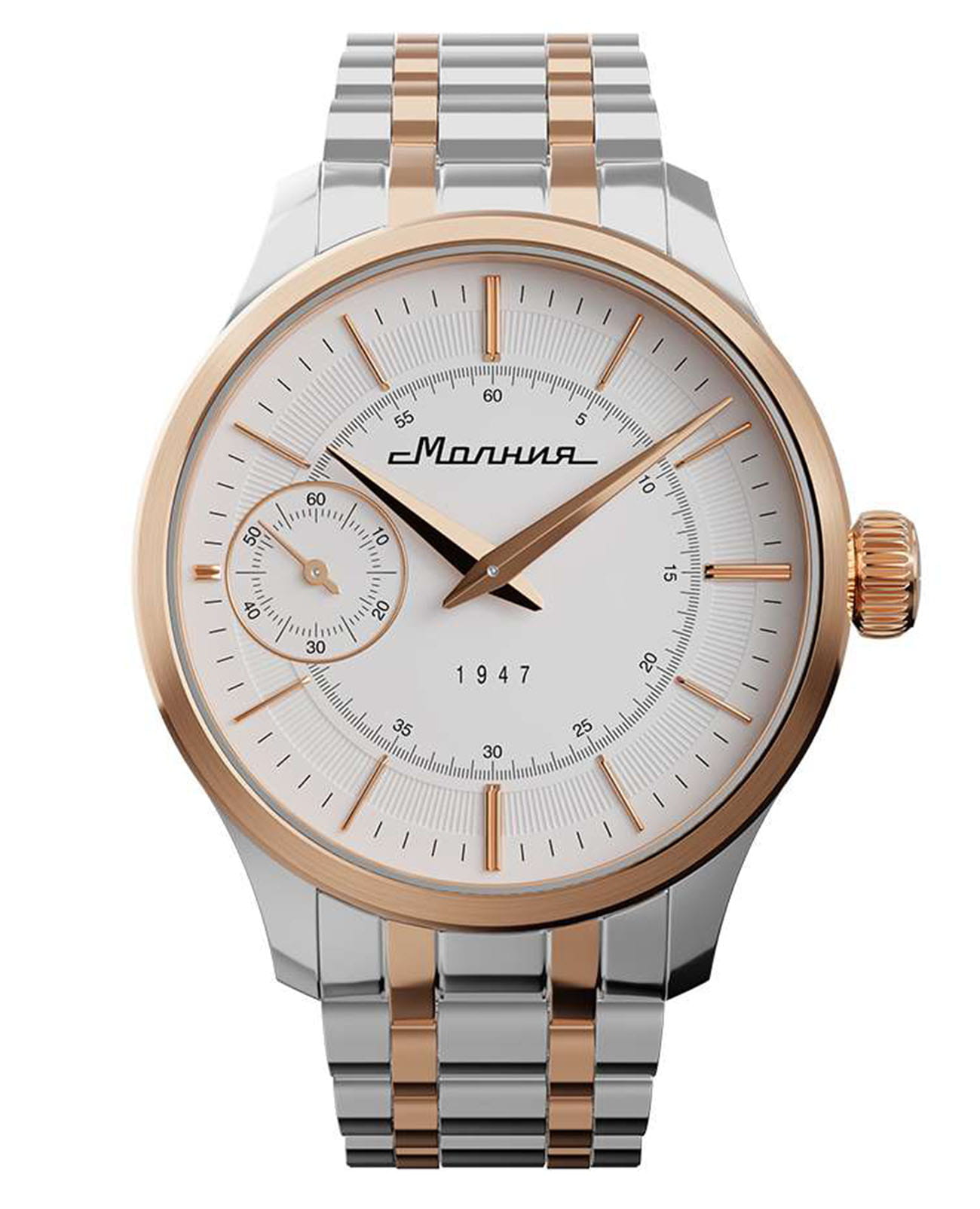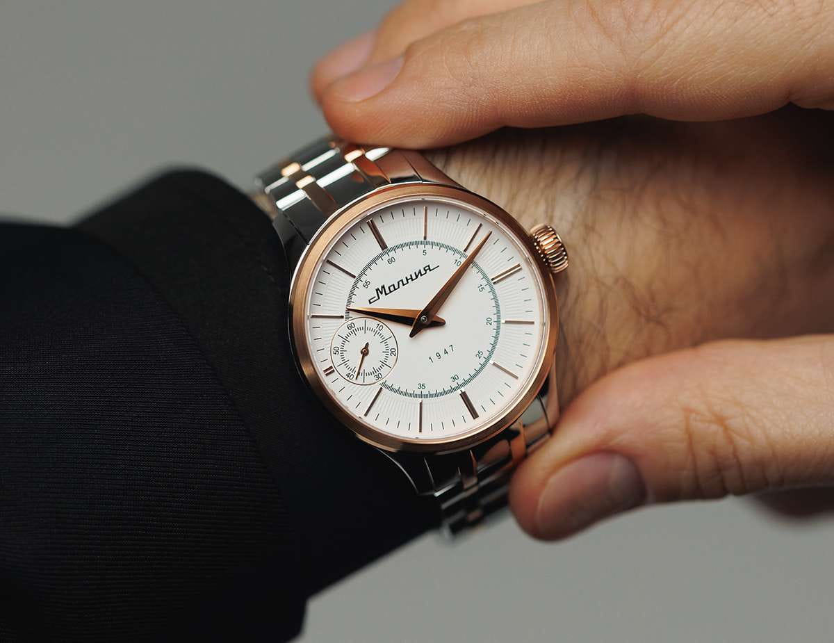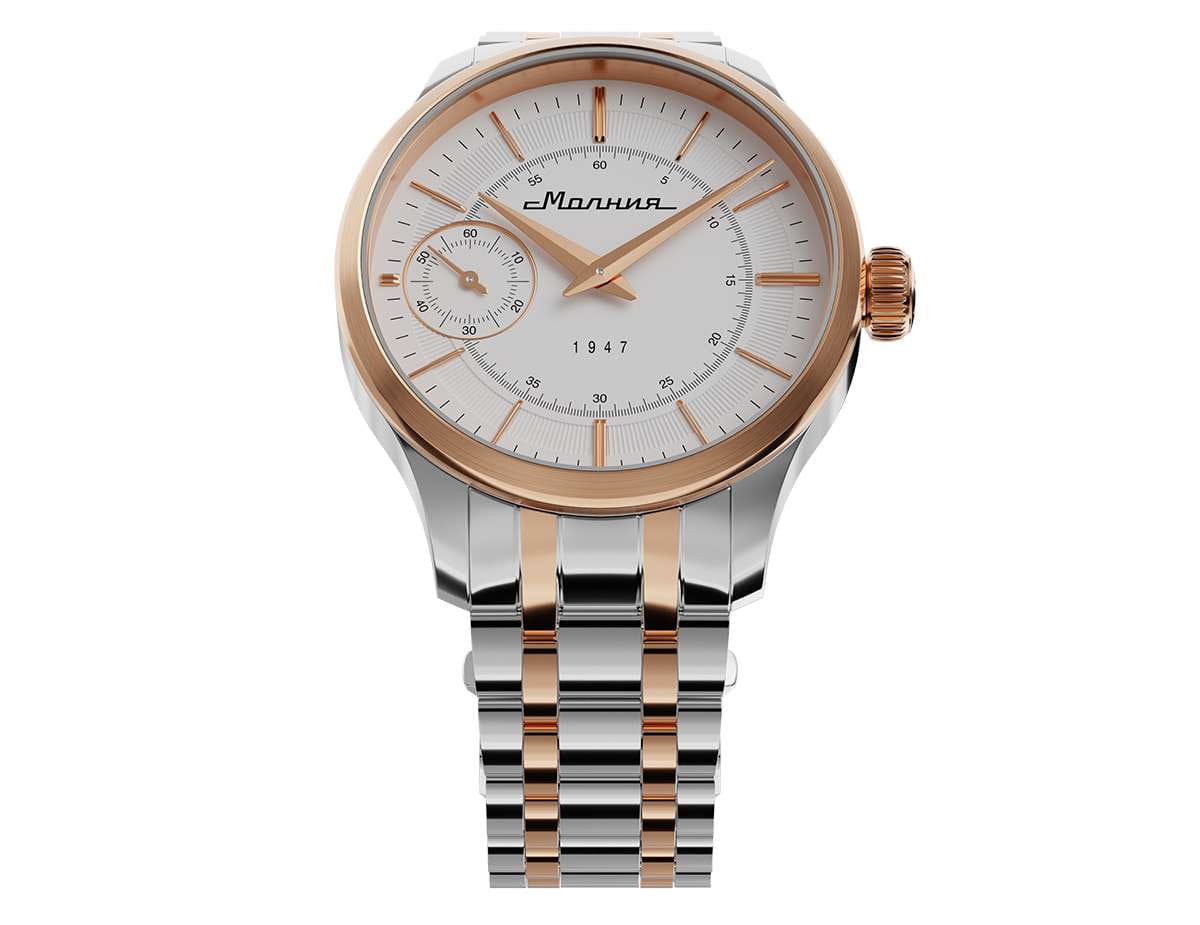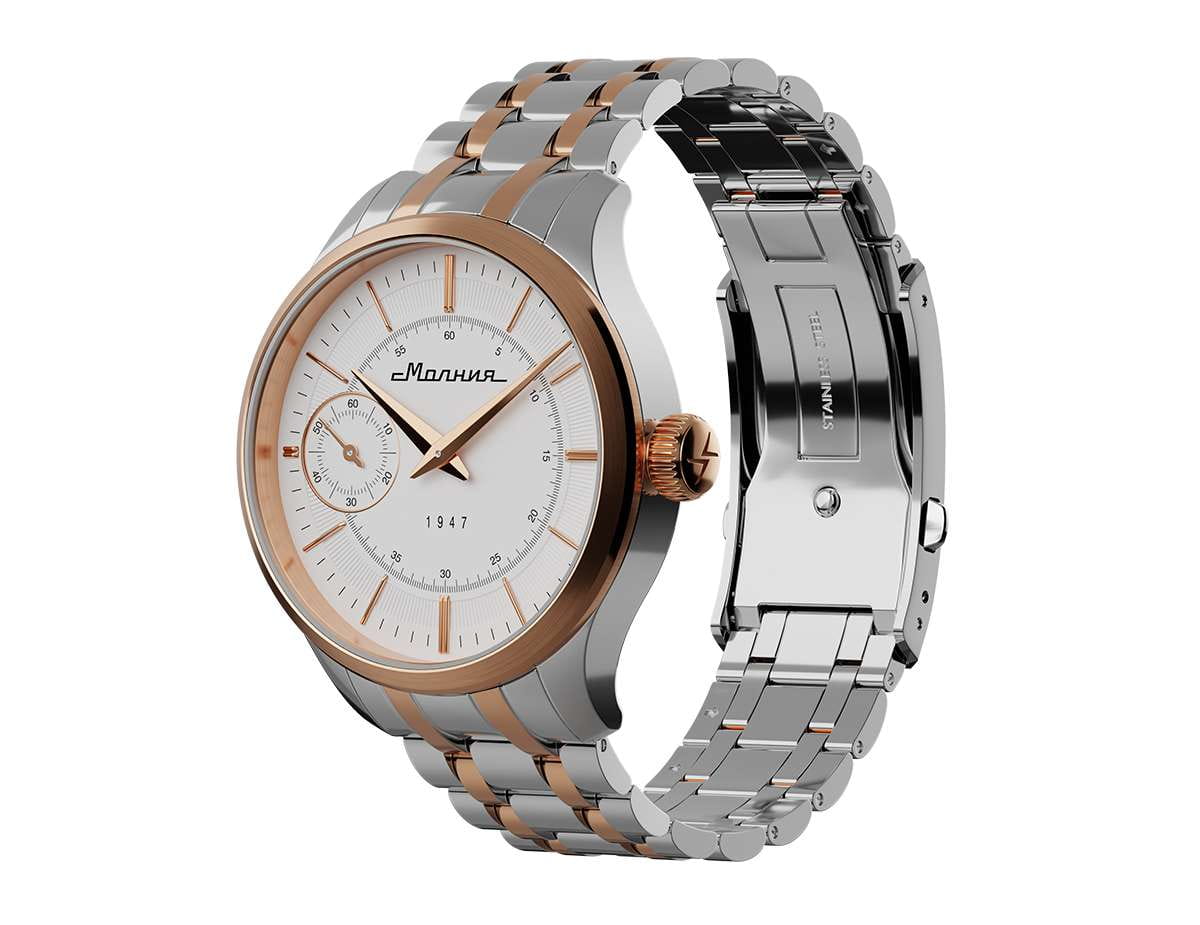 Мужские механические часы с ручным подзаводом — это аксессуар от легендарного бренда «МОЛНИЯ», созданный на Челябинском часовом заводе. Корпус диаметром 41 мм выполнен из нержавеющей стали 316L. БезельБезельВнешний ободок, закрепляющий стекло. В спортивных часах так называется поворотное кольцо с делениями на циферблате, выполняет роль таймера – замеряет отрезки времени на шкале. Неподвижный безель – элемент декора. Однонаправленно вращающийся безель на дайверских часах позволяет фиксировать моменты погружения и выныривания на поверхность. выполнен из стали с PVD-покрытиемPVDУльтратонкое покрытие наносится в технике вакуумного напыления, сочетает в себе нитрид титана особой прочности со слоем золота или оксида хрома. Несёт в себе декоративную или защитную функцию. и зеркальной отделкой. Циферблат белого цвета оформлен индексами и стрелками. Малая секундная стрелка вынесена на позицию 9 часов. Циферблат защищён сапфировым стекломСапфировое стеклоПрочный и надёжный материал из кристалла сапфира синтетического происхождения, характеризующийся особой твёрдостью и устойчивостью к царапинам и повреждениям. толщиной 2 мм. Механизм — мануфактурный калибр 3603, собранный вручную, с запасом хода до 40 часов. Прозрачная задняя крышка позволяет наблюдать за работой механизма. Часы оснащены стальным браслетом с частичным PVD-покрытиемPVDУльтратонкое покрытие наносится в технике вакуумного напыления, сочетает в себе нитрид титана особой прочности со слоем золота или оксида хрома. Несёт в себе декоративную или защитную функцию. под золото и системой быстрой замены на раскладной застёжкеРаскладная застёжкаТакой тип застёжки используется только на браслетах из металла. Она никогда не раскрывается полностью, происходит разделение на 2 и более частей. Раскладывающая застёжка снизит вероятность потери часов к минимуму. типа клипса. Водонепроницаемость 50 м позволяет использовать часы в повседневных условиях. Идеальный выбор для тех, кто ценит российское качество и традиции.