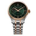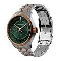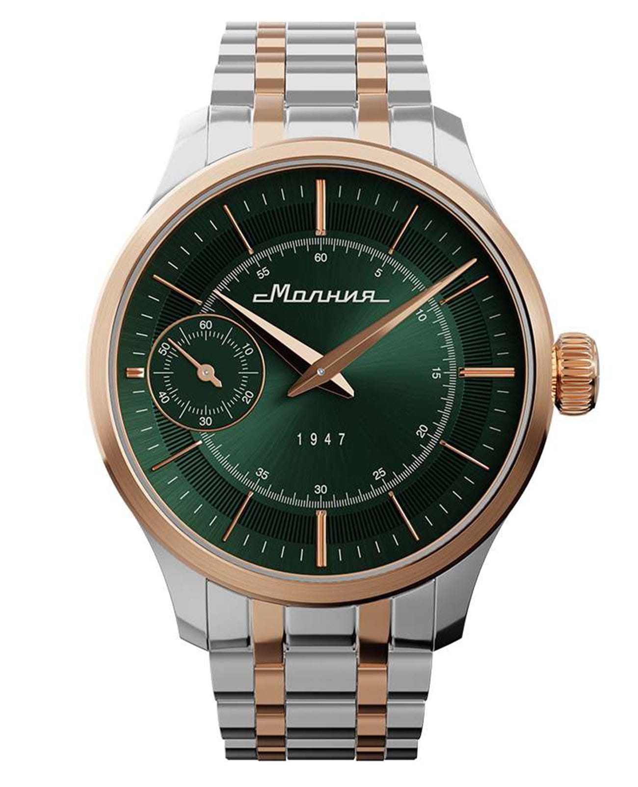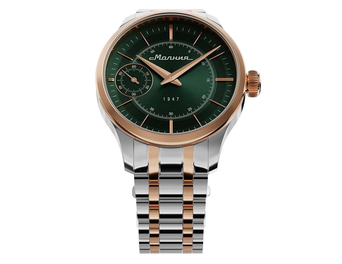 Мужские механические часы с ручным подзаводом — это аксессуар от легендарного бренда «МОЛНИЯ», созданный на Челябинском часовом заводе. Корпус диаметром 41 мм выполнен из нержавеющей стали 316L. БезельБезельВнешний ободок, закрепляющий стекло. В спортивных часах так называется поворотное кольцо с делениями на циферблате, выполняет роль таймера – замеряет отрезки времени на шкале. Неподвижный безель – элемент декора. Однонаправленно вращающийся безель на дайверских часах позволяет фиксировать моменты погружения и выныривания на поверхность. выполнен из стали с PVD-покрытиемPVDУльтратонкое покрытие наносится в технике вакуумного напыления, сочетает в себе нитрид титана особой прочности со слоем золота или оксида хрома. Несёт в себе декоративную или защитную функцию. и зеркальной отделкой. Циферблат зелёного цвета оформлен индексами и стрелками. Малая секундная стрелка вынесена на позицию 9 часов. Циферблат защищён сапфировым стекломСапфировое стеклоПрочный и надёжный материал из кристалла сапфира синтетического происхождения, характеризующийся особой твёрдостью и устойчивостью к царапинам и повреждениям. толщиной 2 мм. Механизм — мануфактурный калибр 3603, собранный вручную, с запасом хода до 40 часов. Прозрачная задняя крышка позволяет наблюдать за работой механизма. Часы оснащены стальным браслетом с частичным PVD-покрытиемPVDУльтратонкое покрытие наносится в технике вакуумного напыления, сочетает в себе нитрид титана особой прочности со слоем золота или оксида хрома. Несёт в себе декоративную или защитную функцию. под золото и системой быстрой замены на раскладной застёжкеРаскладная застёжкаТакой тип застёжки используется только на браслетах из металла. Она никогда не раскрывается полностью, происходит разделение на 2 и более частей. Раскладывающая застёжка снизит вероятность потери часов к минимуму. типа клипса. Водонепроницаемость 50 м позволяет использовать часы в повседневных условиях. Идеальный выбор для тех, кто ценит российское качество и традиции.