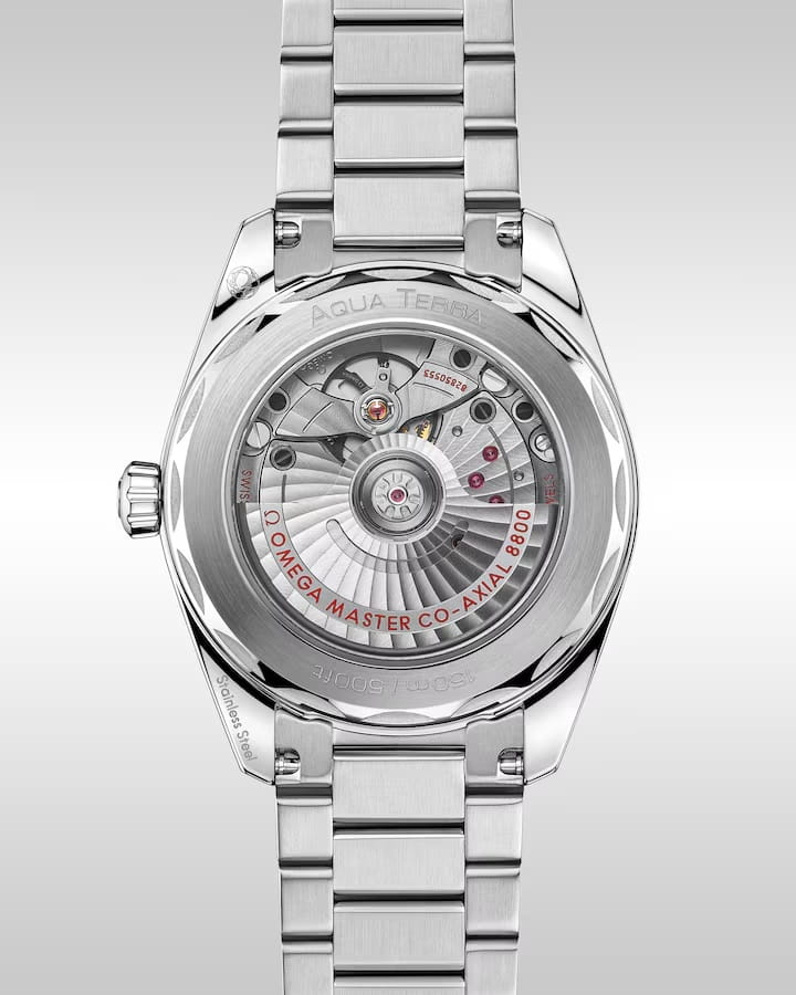 Omega Seamaster Aqua Terra выполнены в симметричном корпусе из нержавеющей стали с завинчивающейся задней крышкой, украшенной волновым узором. Циферблат дополнен окошком даты на 6 часах и оформлен горизонтальным рисунком, вдохновлённым текстурой тикового дерева палуб яхт. Стрелки и метки оснащены люминесцентным покрытиемЛюминесцентное покрытиеПозволяет считывать показания времени в темноте. Производители наносят на стрелки, часовые индексы, безель или поверхность циферблата светонакопительный состав, дающий холодное свечение. Super-LumiNova для лучшей читаемости в темноте. Калибр Omega 8800 сертифицирован как Master Chronometer — гарантия высочайшей точности и устойчивости к магнитным полям. Запас хода составляет 55 часов. Защиту циферблата обеспечивает сапфировое стеклоСапфировое стеклоПрочный и надёжный материал из кристалла сапфира синтетического происхождения, характеризующийся особой твёрдостью и устойчивостью к царапинам и повреждениям. с антибликовым покрытиемАнтибликовое покрытиеСлой оксида металла в 0,13-0,3 микрон, благодаря которому стекло часов не бликует и не отражает свет. Антибликовое покрытие уменьшает отражение света в 10 раз, обеспечивая отличную читаемость показателей циферблата. с обеих сторон. Водозащита позволяет использовать часы в воде без риска повреждения. Часы установлены на полированный и матовый браслет. Это сочетание премиального качества, технологичности и классического дизайна.