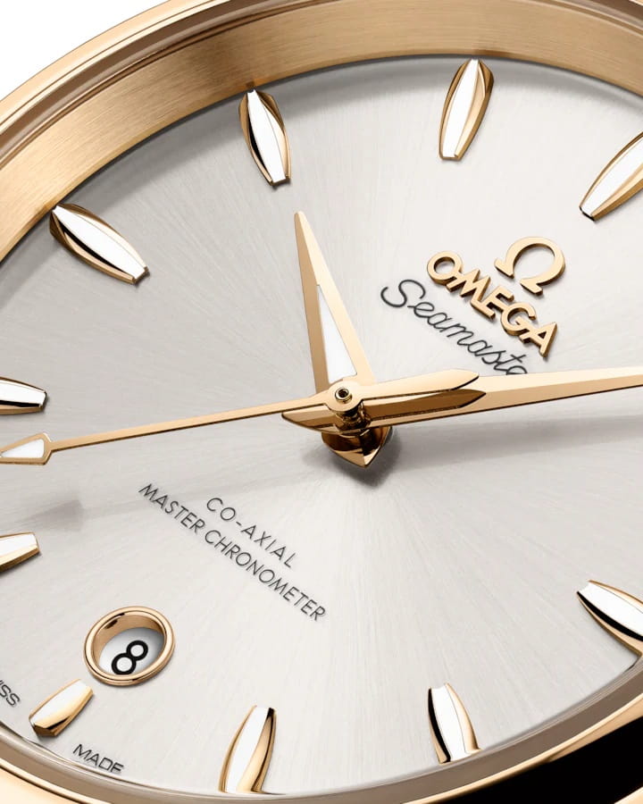 Omega Seamaster Aqua Terra выполнены в симметричном корпусе из нержавеющей стали и 18K Sedna™ золота с завинчивающейся задней крышкой, украшенной волновым узором. Циферблат дополнен окошком даты на 6 часах. Стрелки и метки оснащены люминесцентным покрытиемЛюминесцентное покрытиеПозволяет считывать показания времени в темноте. Производители наносят на стрелки, часовые индексы, безель или поверхность циферблата светонакопительный состав, дающий холодное свечение. Super-LumiNova для лучшей читаемости в темноте. Калибр Omega 8800 сертифицирован как Master Chronometer — гарантия высочайшей точности и устойчивости к магнитным полям. Запас хода составляет 55 часов. Защиту циферблата обеспечивает сапфировое стеклоСапфировое стеклоПрочный и надёжный материал из кристалла сапфира синтетического происхождения, характеризующийся особой твёрдостью и устойчивостью к царапинам и повреждениям. с антибликовым покрытиемАнтибликовое покрытиеСлой оксида металла в 0,13-0,3 микрон, благодаря которому стекло часов не бликует и не отражает свет. Антибликовое покрытие уменьшает отражение света в 10 раз, обеспечивая отличную читаемость показателей циферблата.. Водозащита позволяет использовать часы в воде без риска повреждения. Часы установлены на комбинированный браслет из 18K Sedna™ золота и нержавеющей стали с застёжка «бабочка» с кнопкамиЗастёжка "бабочка"Такой вид застёжки дополняется предохранителями, помогающими избежать случайного раскрытия браслета. Обладают изящным исполнением. . Это сочетание премиального качества, технологичности и классического дизайна.