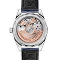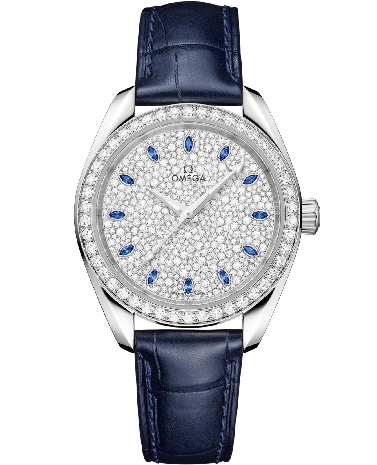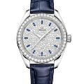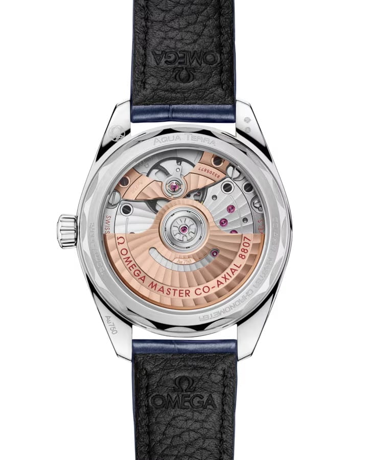 Часы Omega Seamaster Aqua Terra выполнены в симметричном корпусе из полированного 18K Canopus Gold™ с завинчивающейся задней крышкой, украшенной волновым узором. Безель инкрустирован бриллиантами, что добавляет модели роскошный акцент. Циферблат серебристого цвета дополнен окошком даты и 12 часовыми метками из сапфиров, а также стрелками из белого золота, оснащёнными люминесцентным покрытиемЛюминесцентное покрытиеПозволяет считывать показания времени в темноте. Производители наносят на стрелки, часовые индексы, безель или поверхность циферблата светонакопительный состав, дающий холодное свечение. Super-LumiNova для лучшей читаемости в темноте. Калибр Omega 8807 сертифицирован как Master Chronometer — гарантия высочайшей точности и устойчивости к магнитным полям. Запас хода составляет 55 часов. Защиту циферблата обеспечивает сапфировое стеклоСапфировое стеклоПрочный и надёжный материал из кристалла сапфира синтетического происхождения, характеризующийся особой твёрдостью и устойчивостью к царапинам и повреждениям. с антибликовым покрытиемАнтибликовое покрытиеСлой оксида металла в 0,13-0,3 микрон, благодаря которому стекло часов не бликует и не отражает свет. Антибликовое покрытие уменьшает отражение света в 10 раз, обеспечивая отличную читаемость показателей циферблата. с обеих сторон. Водозащита позволяет использовать часы в воде без риска повреждения. Часы установлены на кожаный ремешок синего цвета. Вес модели — около 94 грамма. Это сочетание премиального качества, технологичности и классического дизайна.