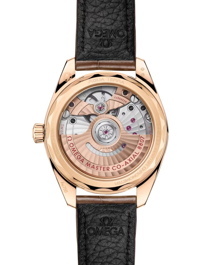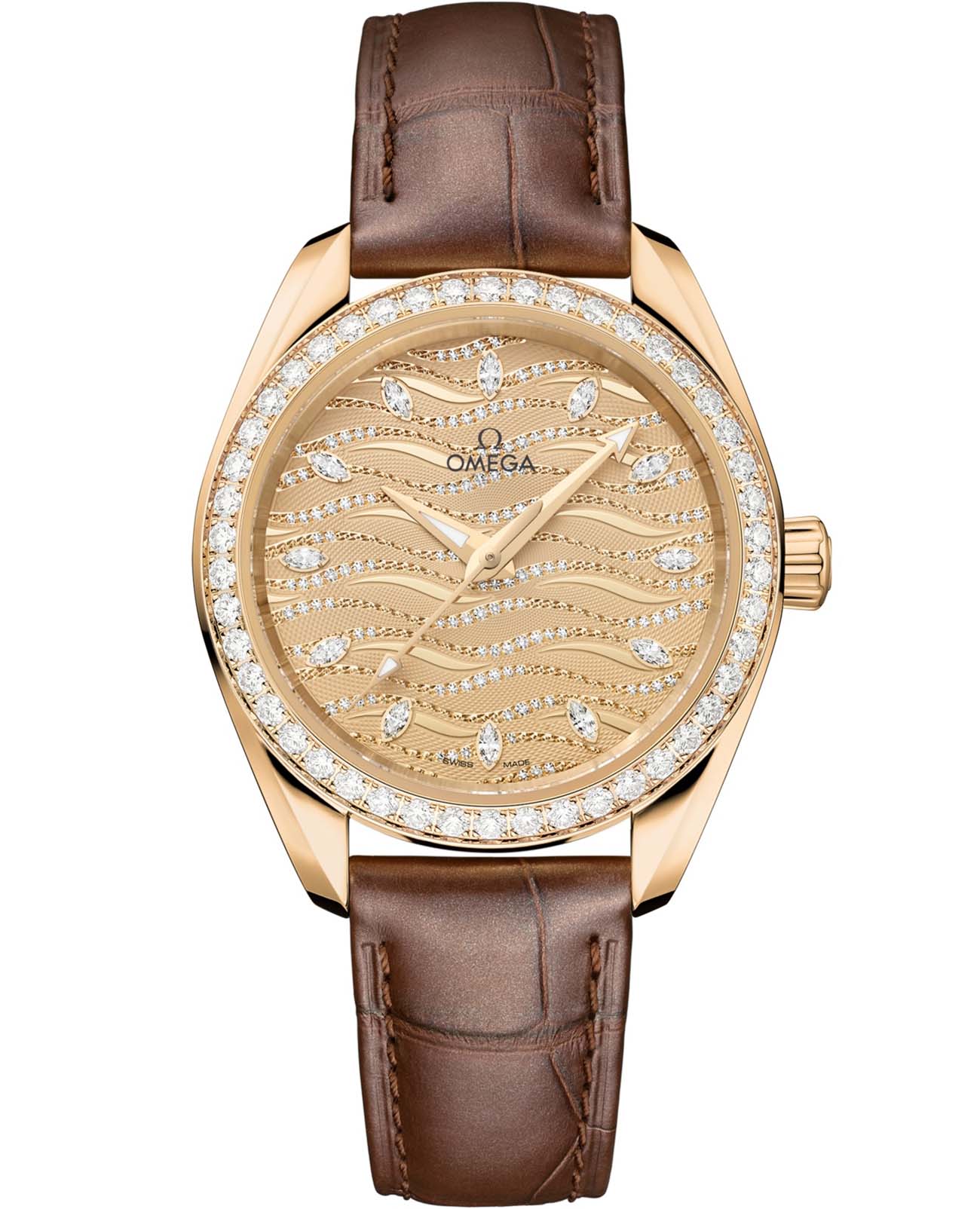 Часы Omega Seamaster Aqua Terra выполнены в симметричном корпусе из полированного 18K Moonshine™ золота с завинчивающейся задней крышкой, украшенной волновым узором. Безель инкрустирован бриллиантами, что добавляет модели роскошный акцент. Циферблат жёлтого цвета дополнен окошком даты и оформлен вручную с использованием техники гильоше, а также 12 бриллиантами по окружности. Стрелки выполнены из 18K Moonshine™ золота и оснащены люминесцентным покрытиемЛюминесцентное покрытиеПозволяет считывать показания времени в темноте. Производители наносят на стрелки, часовые индексы, безель или поверхность циферблата светонакопительный состав, дающий холодное свечение. Super-LumiNova для лучшей читаемости в темноте. Калибр Omega 8807 сертифицирован как Master Chronometer — гарантия высочайшей точности и устойчивости к магнитным полям. Запас хода составляет 55 часов. Защиту циферблата обеспечивает сапфировое стеклоСапфировое стеклоПрочный и надёжный материал из кристалла сапфира синтетического происхождения, характеризующийся особой твёрдостью и устойчивостью к царапинам и повреждениям. с антибликовым покрытиемАнтибликовое покрытиеСлой оксида металла в 0,13-0,3 микрон, благодаря которому стекло часов не бликует и не отражает свет. Антибликовое покрытие уменьшает отражение света в 10 раз, обеспечивая отличную читаемость показателей циферблата. с обеих сторон. Водозащита позволяет использовать часы в воде без риска повреждения. Часы установлены на кожаный ремешок коричневого цвета. Вес модели — около 87 грамм. Это сочетание премиального качества, технологичности и классического дизайна.
