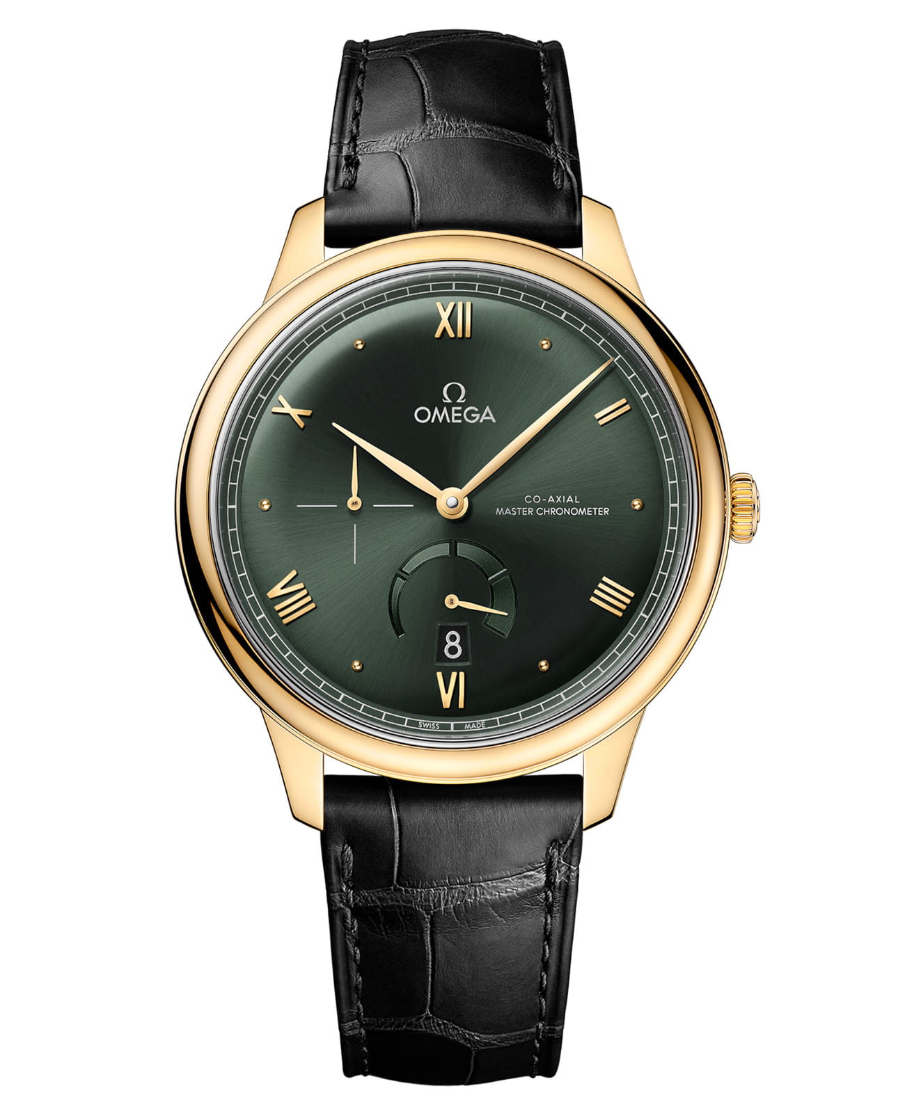 обрамляет циферблат с темно-зеленым PVD-покрытиемPVDУльтратонкое покрытие наносится в технике вакуумного напыления, сочетает в себе нитрид титана особой прочности со слоем золота или оксида хрома. Несёт в себе декоративную или защитную функцию. и радиальным сатинированием. Стрелки из желтого золота и чередующиеся римские цифры с кабошонами создают благородную гармонию. Уникальный 270-градусный индикатор запаса хода в форме полумесяца с двухслойной конструкцией добавляет функциональную изысканность. Лаконичный дизайн дополняют окошко даты, счетчик малых секунд и минутная шкала "железная дорога". Черный кожаный ремешок завершает образ, а сапфировое стеклоСапфировое стеклоПрочный и надёжный материал из кристалла сапфира синтетического происхождения, характеризующийся особой твёрдостью и устойчивостью к царапинам и повреждениям. задней крышки раскрывает взору сертифицированный калибр OMEGA Master Co-Axial 8810 — символ часового совершенства.