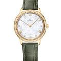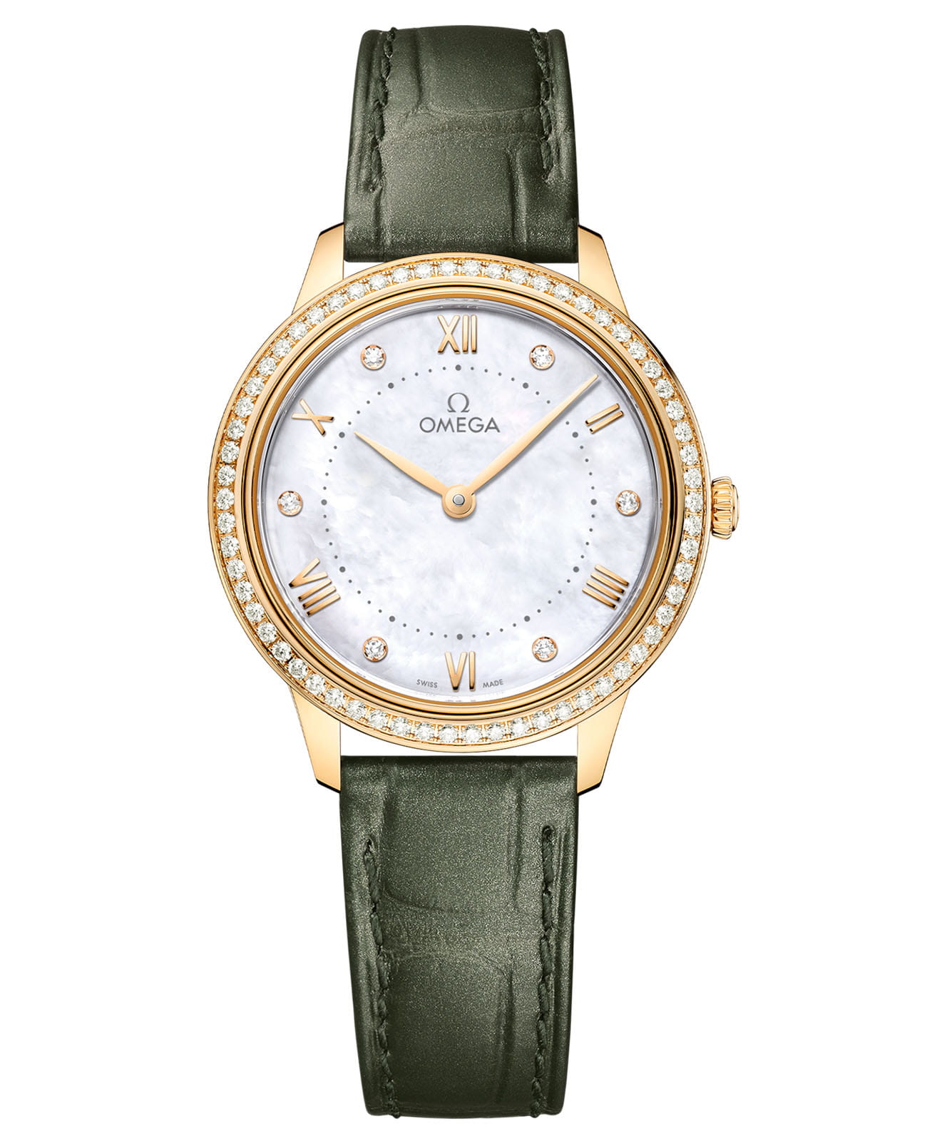 танцуют между римскими цифрами и бриллиантовыми метками. Лаконичный дизайн дополнен изящной минутной шкалой-россыпью точек и крышкой с рельефным медальоном Хроноса. Модель представлена с кожаным ремешком оливково-зеленого оттенка и оснащена кварцевым механизмом OMEGA 4061, работающим без замены батареи минимум 48 месяцев.