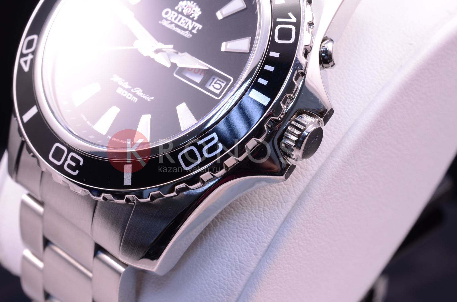 Чёрный циферблат с крупной индикацией времени не имеет лишних деталей. Японский автоматический калибр Orient 46943 имеет запас хода на 40 часов. Завинчивающаяся задняя крышка и заводная головка усиливают водостойкость в 200 метров. люминесцентная подсветкаЛюминесцентное покрытиеПозволяет считывать показания времени в темноте. Производители наносят на стрелки, часовые индексы, безель или поверхность циферблата светонакопительный состав, дающий холодное свечение. позволяет просматривать время и в темноте. На позиции 3 часов – окошко даты и дня недели.