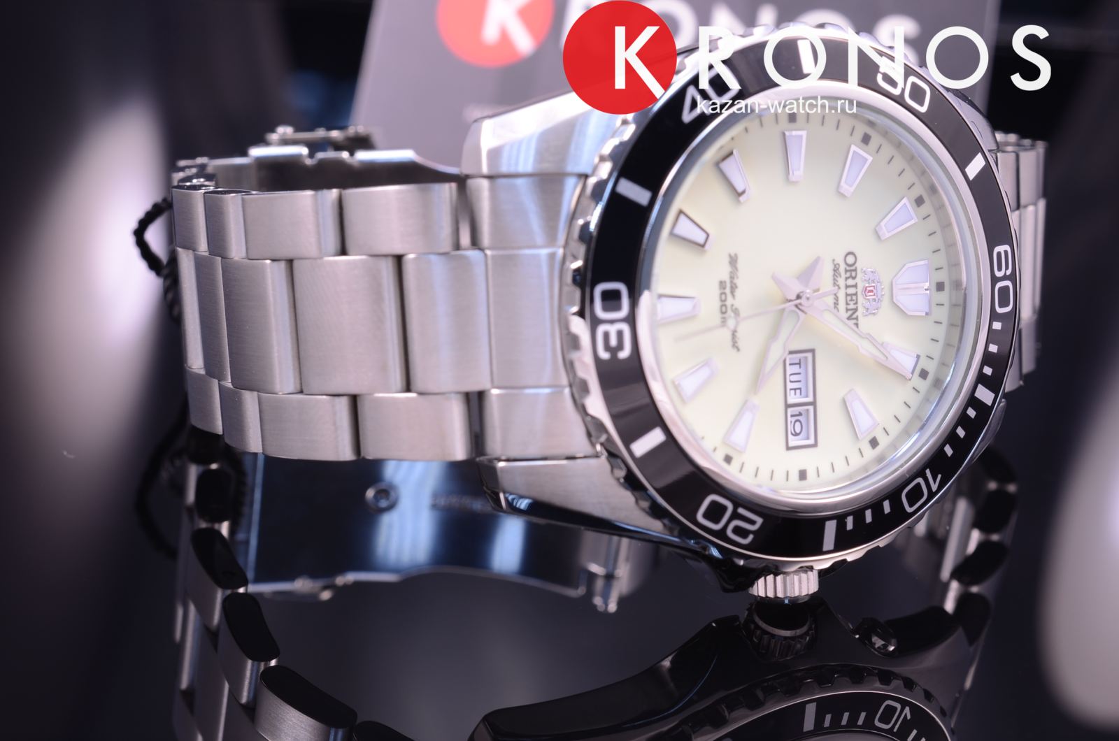 Светлый циферблат с крупной индикацией времени не имеет лишних деталей. Японский автоматический калибр Orient 46943 имеет запас хода на 40 часов. Завинчивающаяся задняя крышка и заводная головка усиливают водостойкость в 200 метров. люминесцентная подсветкаЛюминесцентное покрытиеПозволяет считывать показания времени в темноте. Производители наносят на стрелки, часовые индексы, безель или поверхность циферблата светонакопительный состав, дающий холодное свечение. позволяет просматривать время и в темноте. На позиции 3 часов – окошко даты и дня недели.