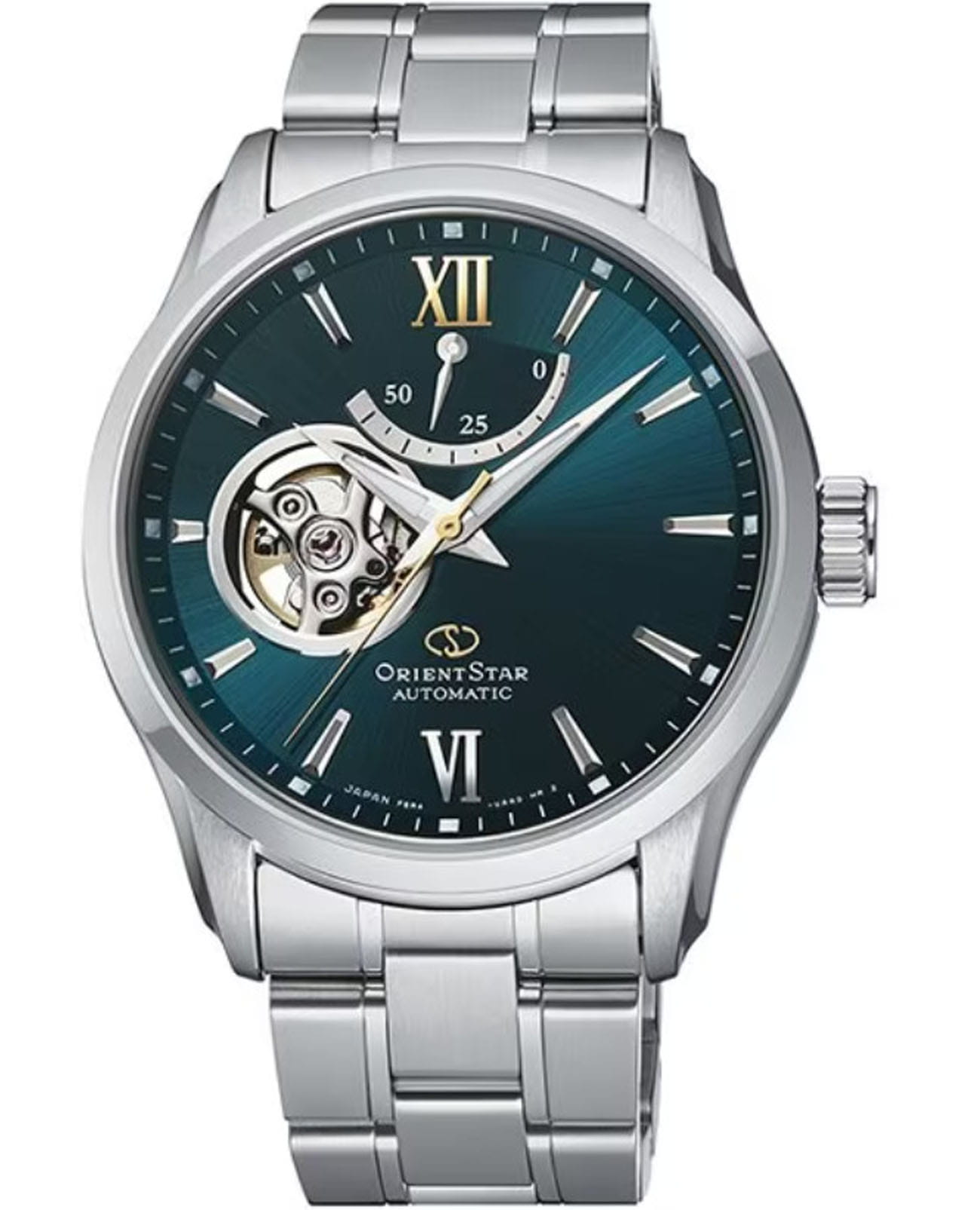 Мужские изысканные часы Orient Contemporary Semi-Skeleton RE-AT0003E — это стильное сочетание современного дизайна и часового мастерства. Корпус из нержавеющей стали с диаметром 39.3 мм защищён сапфировым стекломСапфировое стеклоПрочный и надёжный материал из кристалла сапфира синтетического происхождения, характеризующийся особой твёрдостью и устойчивостью к царапинам и повреждениям. с антибликовым покрытиемАнтибликовое покрытиеСлой оксида металла в 0,13-0,3 микрон, благодаря которому стекло часов не бликует и не отражает свет. Антибликовое покрытие уменьшает отражение света в 10 раз, обеспечивая отличную читаемость показателей циферблата., что обеспечивает отличную видимость и защиту от царапин. Особенностью этой модели является прозрачное окошко на циферблате, через которое можно наблюдать за работой сложного внутреннего механизма. Элегантные часы оснащены калибром F6R42. Элегантный браслет из нержавеющей стали с оснащён раскладной застёжкойРаскладная застёжкаТакой тип застёжки используется только на браслетах из металла. Она никогда не раскрывается полностью, происходит разделение на 2 и более частей. Раскладывающая застёжка снизит вероятность потери часов к минимуму., что обеспечивает удобство и надёжность. Эта изысканная модель имеет люминесцентное покрытиеЛюминесцентное покрытиеПозволяет считывать показания времени в темноте. Производители наносят на стрелки, часовые индексы, безель или поверхность циферблата светонакопительный состав, дающий холодное свечение. на стрелках и метках для отличной читаемости в темноте. Водозащита до 10 ATM позволяет использовать часы не только в повседневной жизни, но и при активности на воде. Orient Contemporary Semi-skeleton RE-AT0003E — это выбор для тех, кто ценит утончённость, стиль и высочайшее качество.