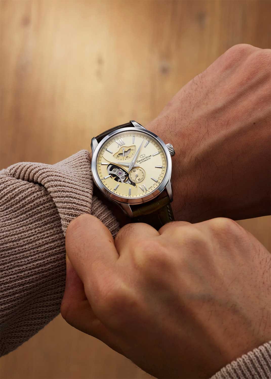 Оригинальные механические часы Orient Star Contemporary RE-AV0B10G0 представляют собой сочетание современного дизайна и инновационных технологий. Корпус диаметром 41 мм выполнен из нержавеющей стали, что обеспечивает долговечность и презентабельный внешний вид. Циферблат бежевого цвета украшен индексами и серебряными стрелками. Особенностью модели является полускелетонный дизайн, который позволяет Водозащита 100 метров делает часы практичными для повседневного использования, включая активности в воде. Дополняет образ кожаный ремешок, закрывающийся на надёжную раскладную застёжкуРаскладная застёжкаТакой тип застёжки используется только на браслетах из металла. Она никогда не раскрывается полностью, происходит разделение на 2 и более частей. Раскладывающая застёжка снизит вероятность потери часов к минимуму., что добавляет комфорта при ношении. Orient Star Contemporary — это выбор тех, кто ценит точность, качество и элегантный дизайн в одном аксессуаре. Эти часы станут прекрасным дополнением как к повседневной, так и к формальной одежде, подчеркивая ваш стиль и индивидуальность.