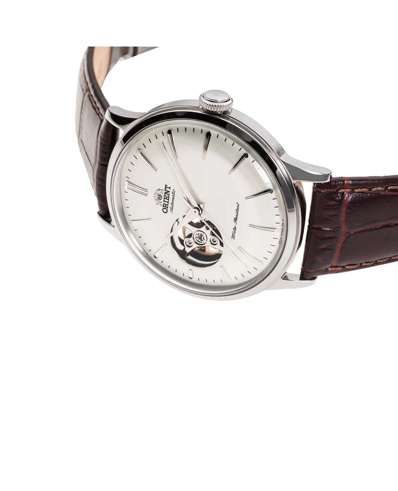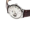 Циферблат выполнен в белом цвете с открытым сердечником (open heart) на позиции 9 часов, что добавляет часам уникальный и стильный вид. Браслет часов изготовлен из коричневой кожи, что придаёт часам классический и элегантный вид. Застёжка выполнена в виде традиционной конструкции, обеспечивающей надёжную фиксацию на запястье.