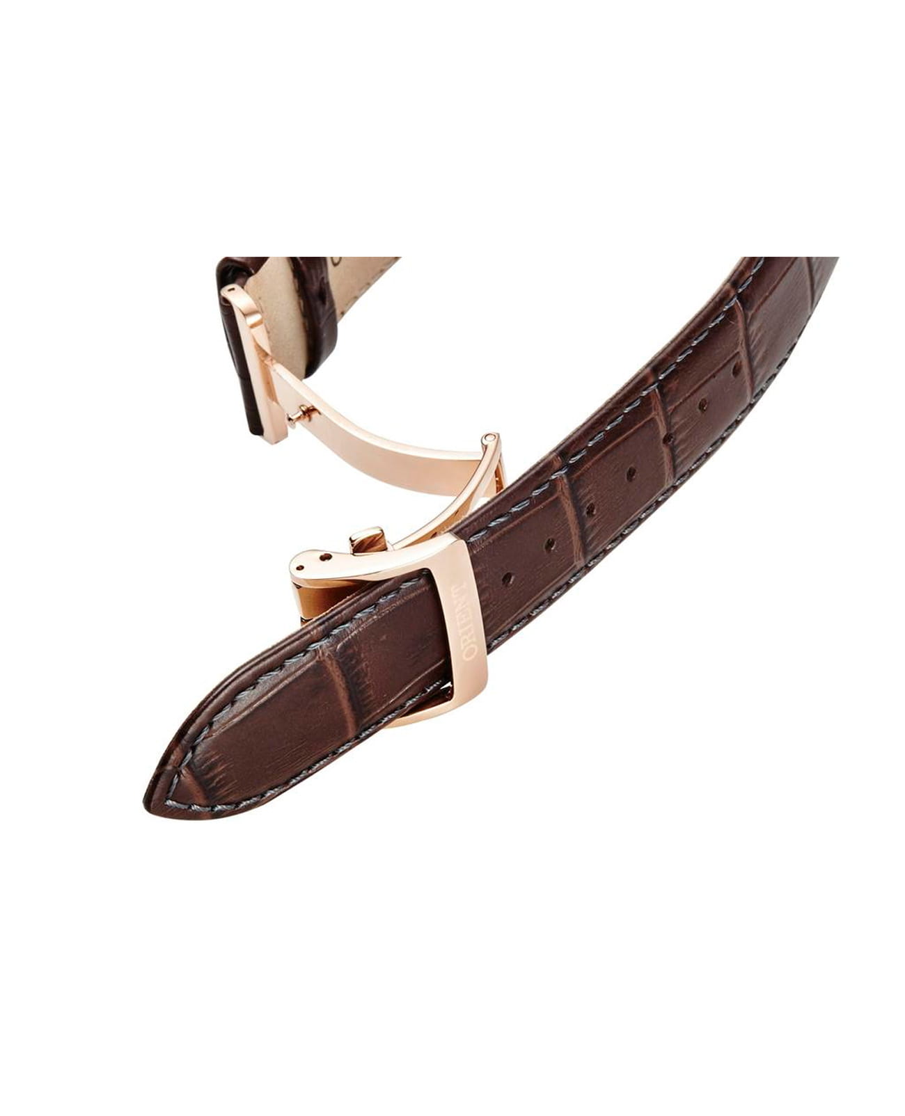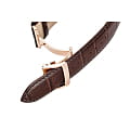 Ремешок часов изготовлен из коричневой кожи, что придаёт часам классический и элегантный вид. Застёжка выполнена в виде раскладной застежкиРаскладная застёжкаТакой тип застёжки используется только на браслетах из металла. Она никогда не раскрывается полностью, происходит разделение на 2 и более частей. Раскладывающая застёжка снизит вероятность потери часов к минимуму., которая обеспечивает удобство и надёжную фиксацию на запястье.