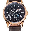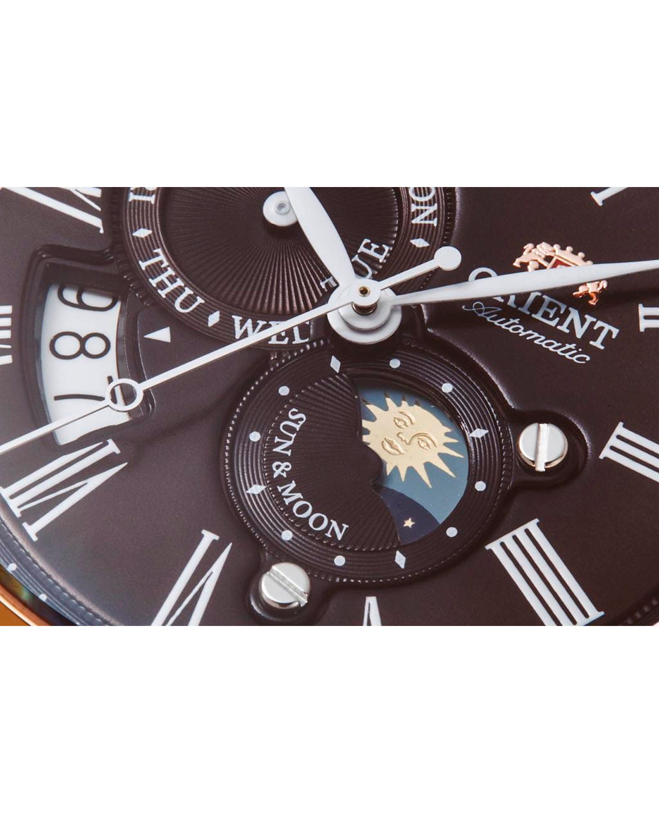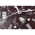 Циферблат выполнен в коричневом цвете с уникальным дизайном, включающим индикацию солнца и луны (Sun & Moon), что добавляет часам уникальный и стильный вид. На циферблате расположены римские цифры.